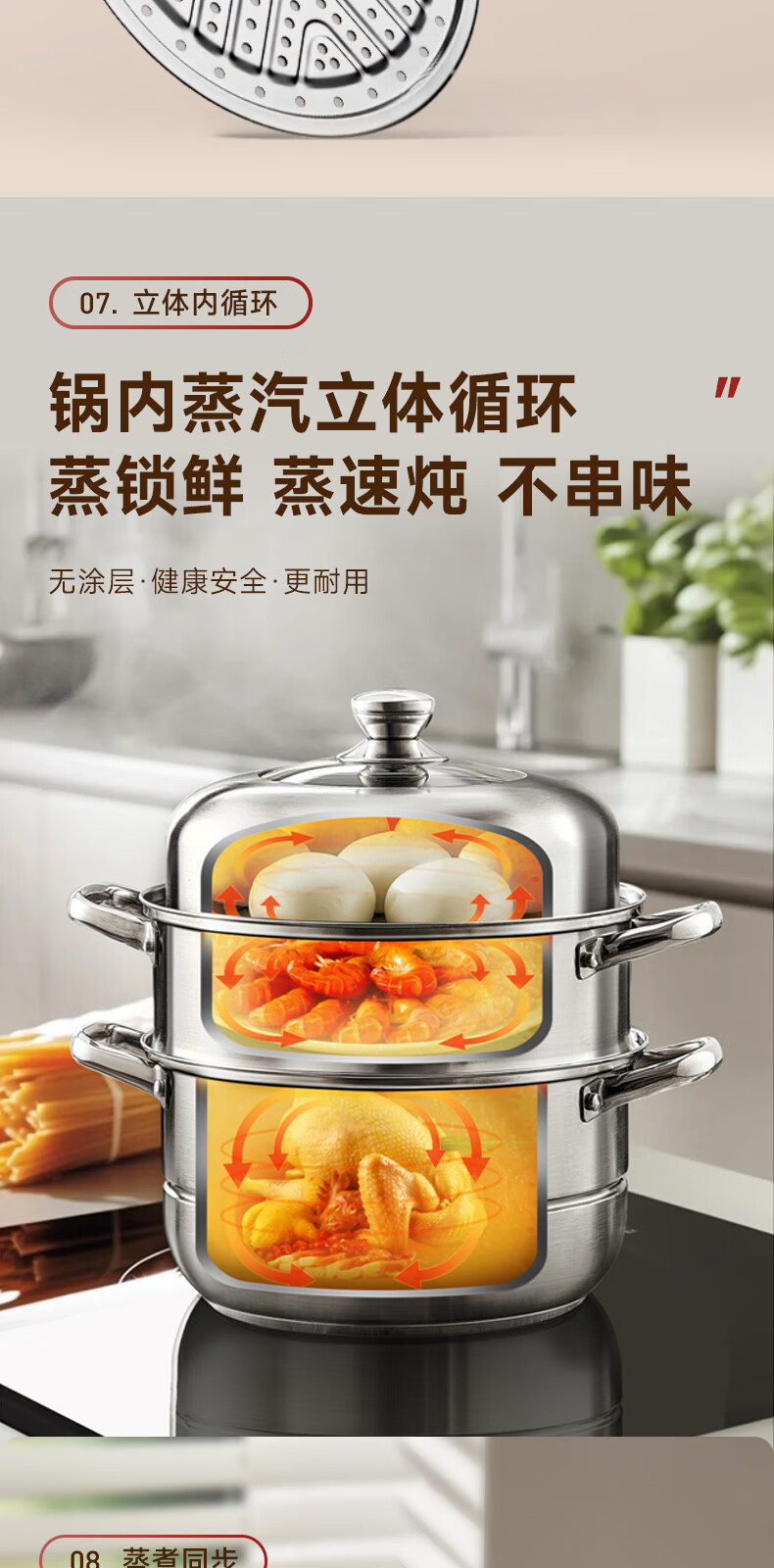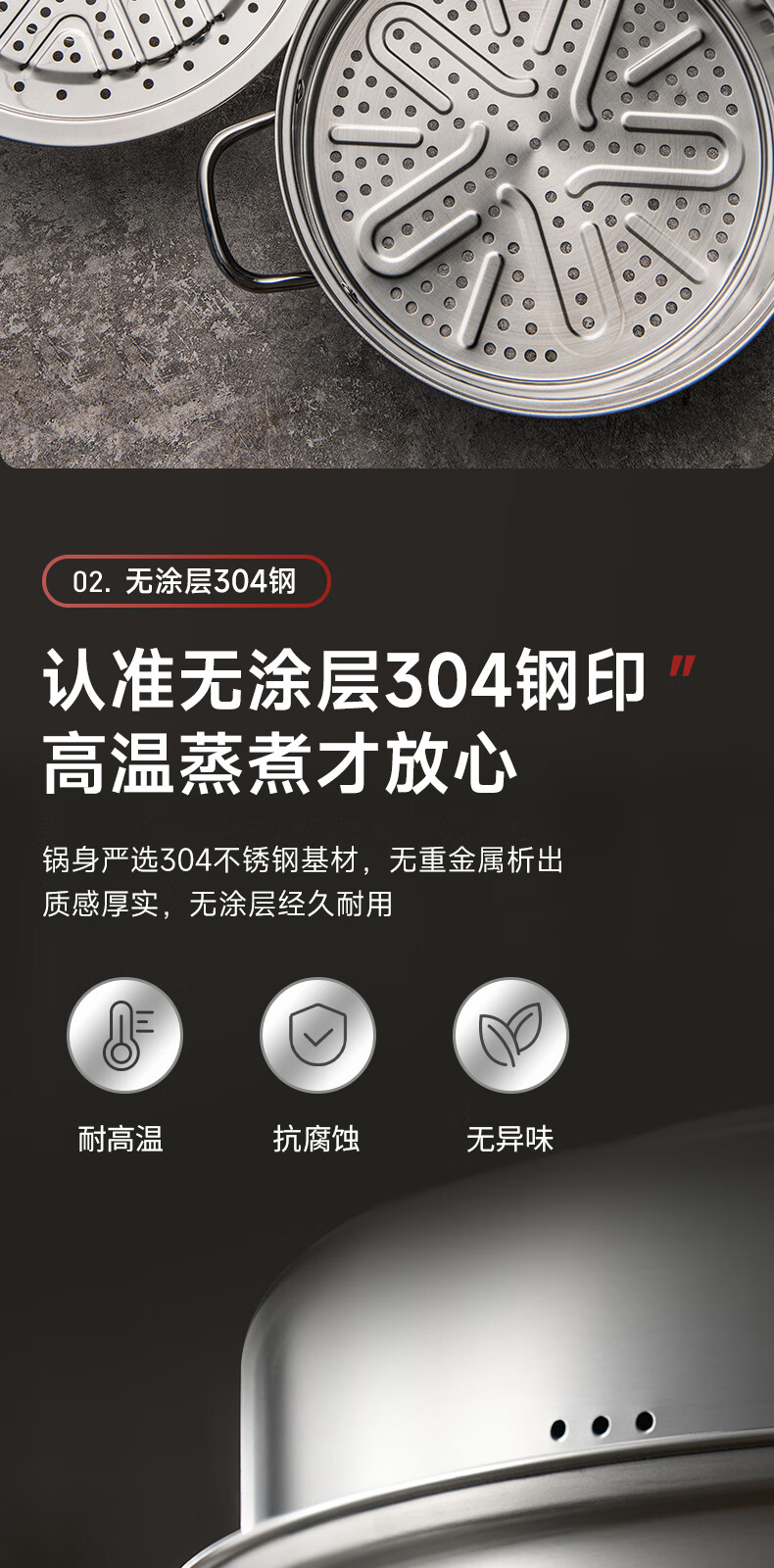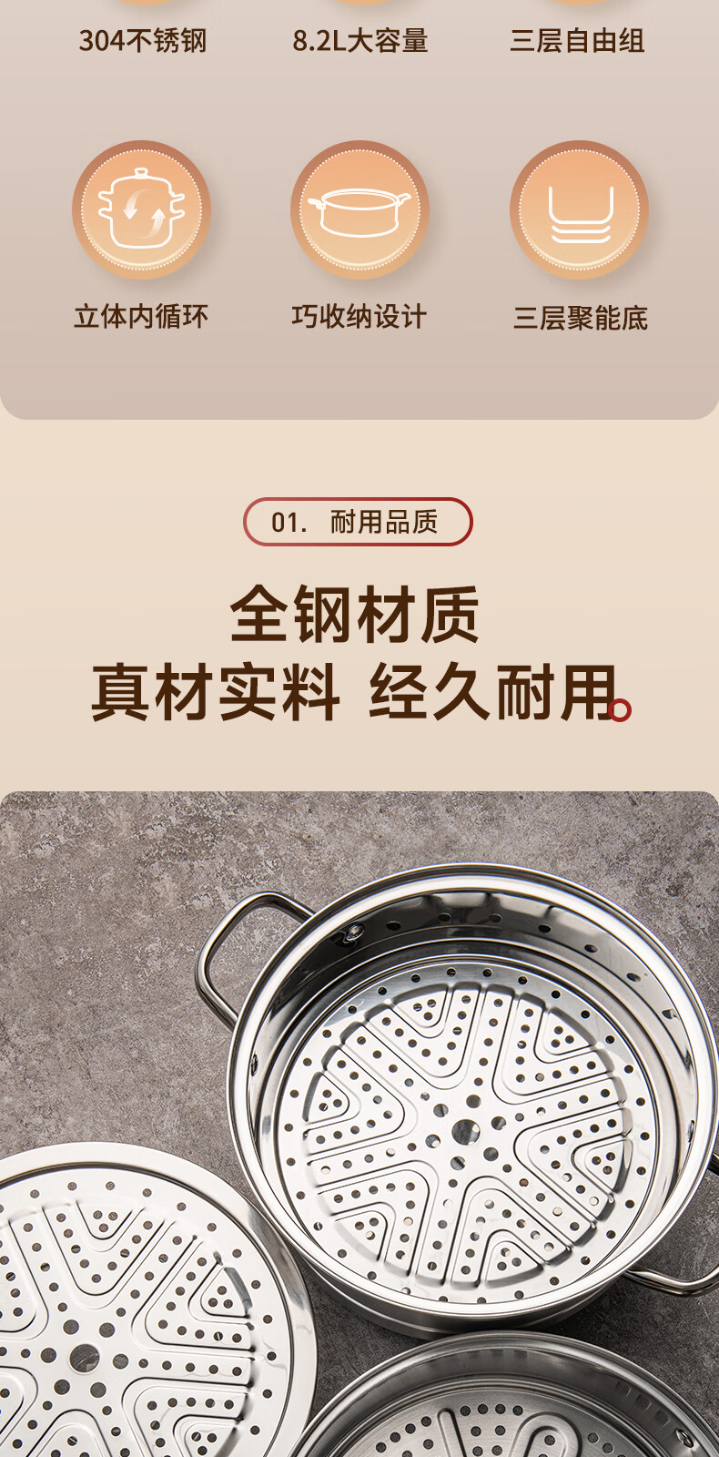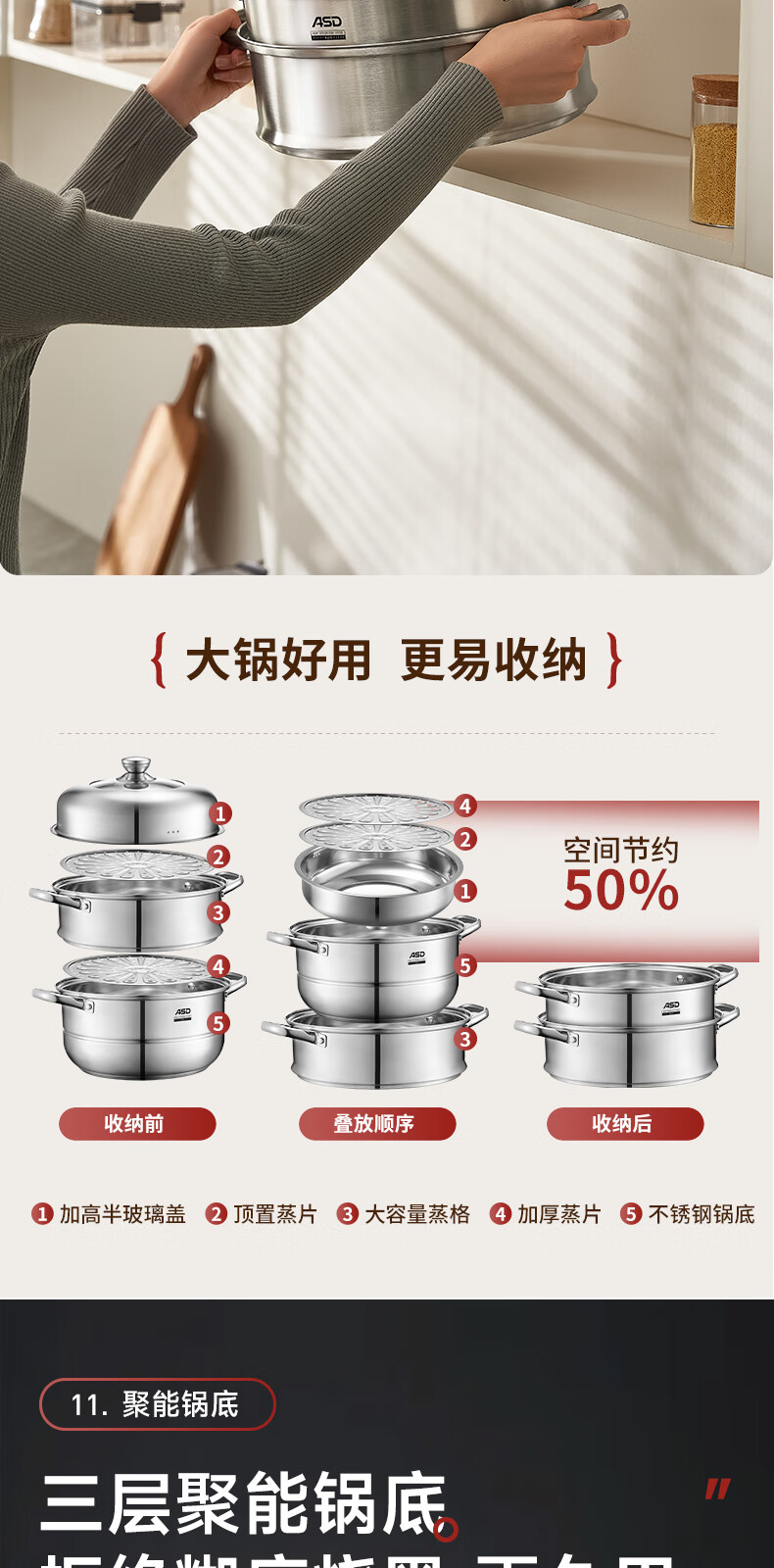 爱仕达(ASD)蒸锅304不锈钢三层汤锅蒸煮一体 家用复底28CM大容量高拱盖蒸笼G3