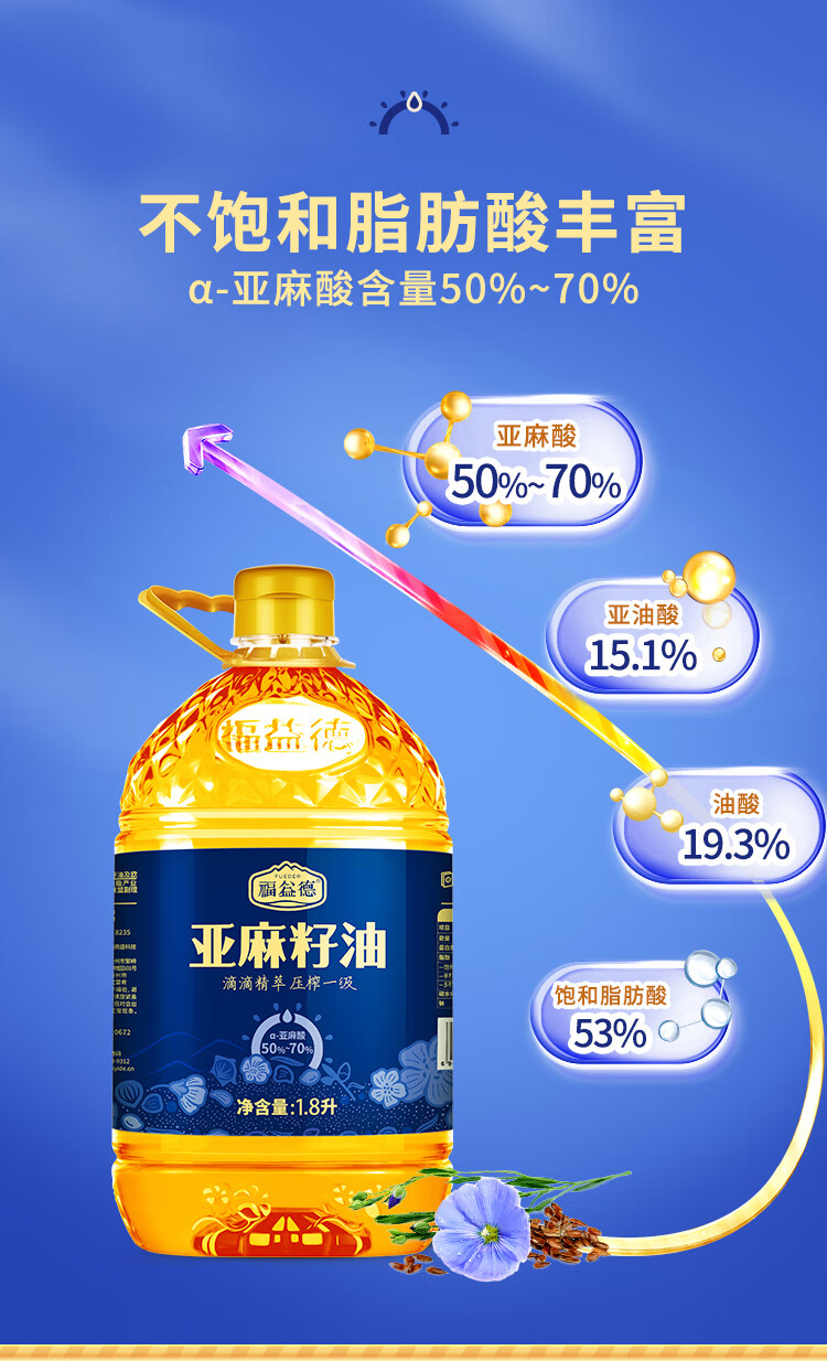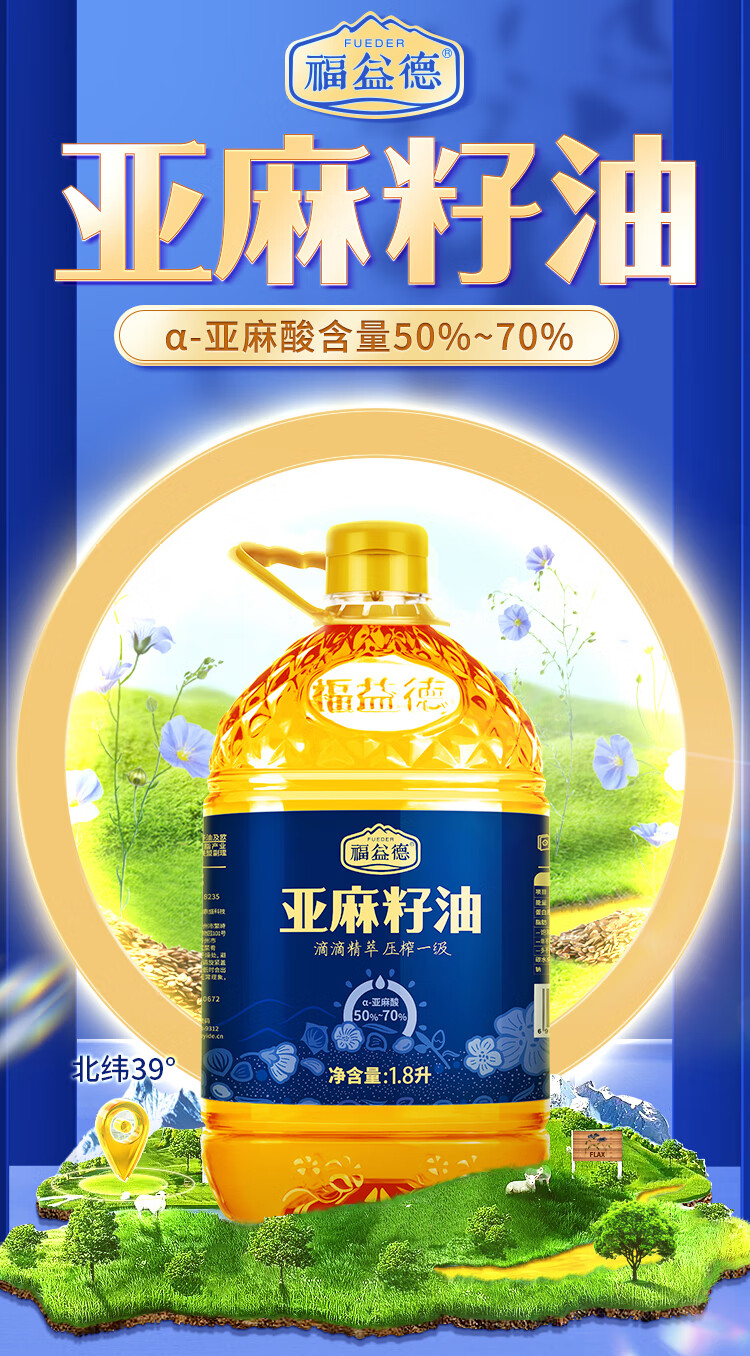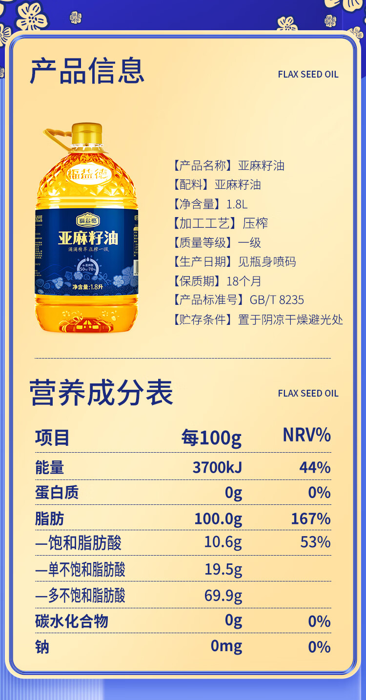 福益德 亚麻籽油 一级物理压榨 孕妇可食用油月子油胡麻油 食用亚麻籽油 【礼盒装】纯亚麻籽油1.8L*2桶