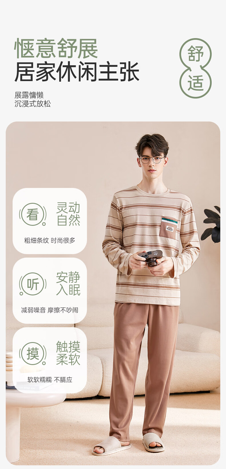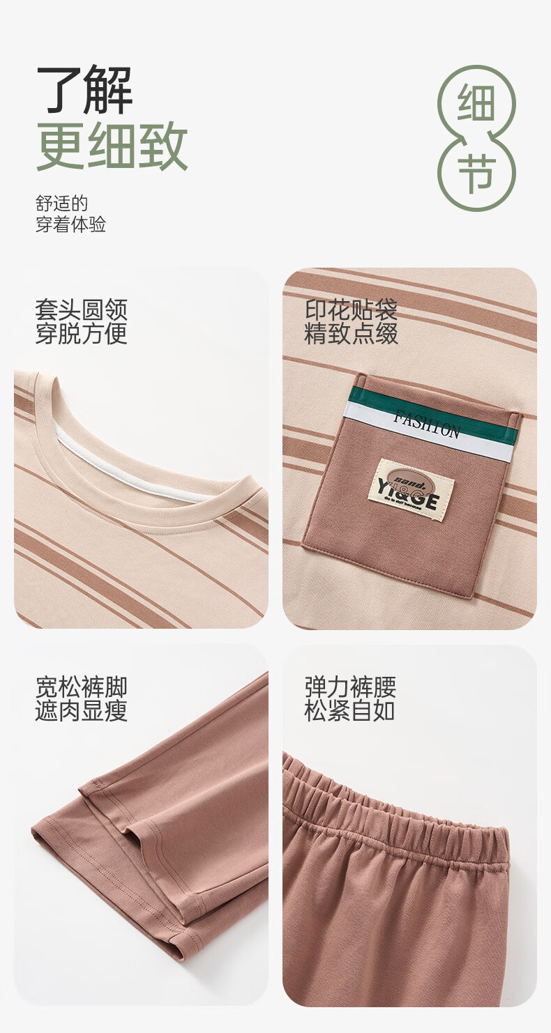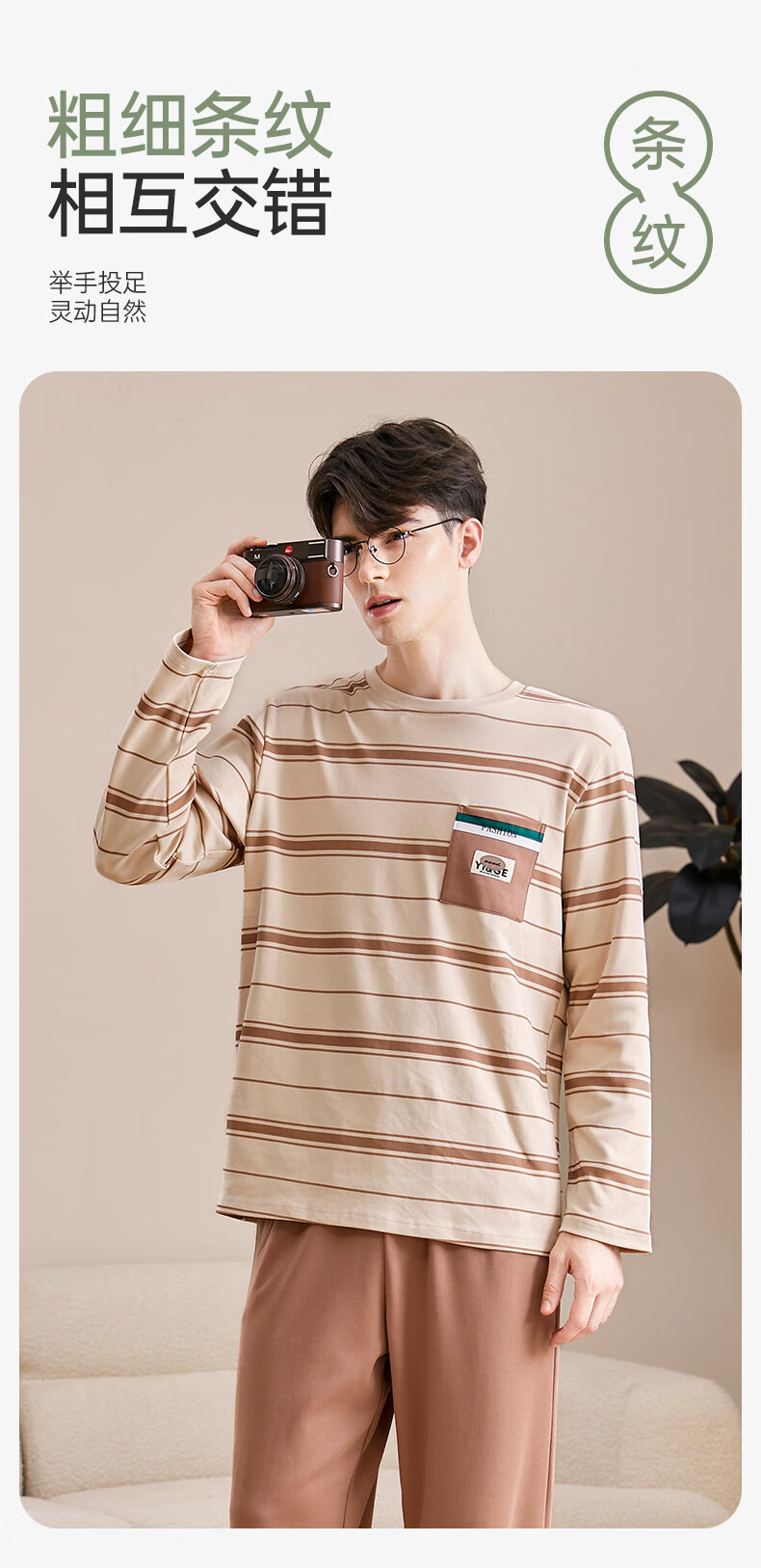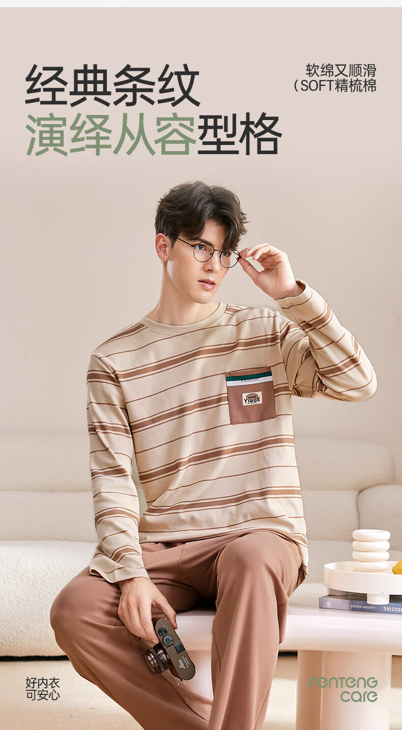 芬腾可安睡衣男【100%纯棉】条纹学生圆领长袖家居服可外穿男士睡衣套装 杏色 L