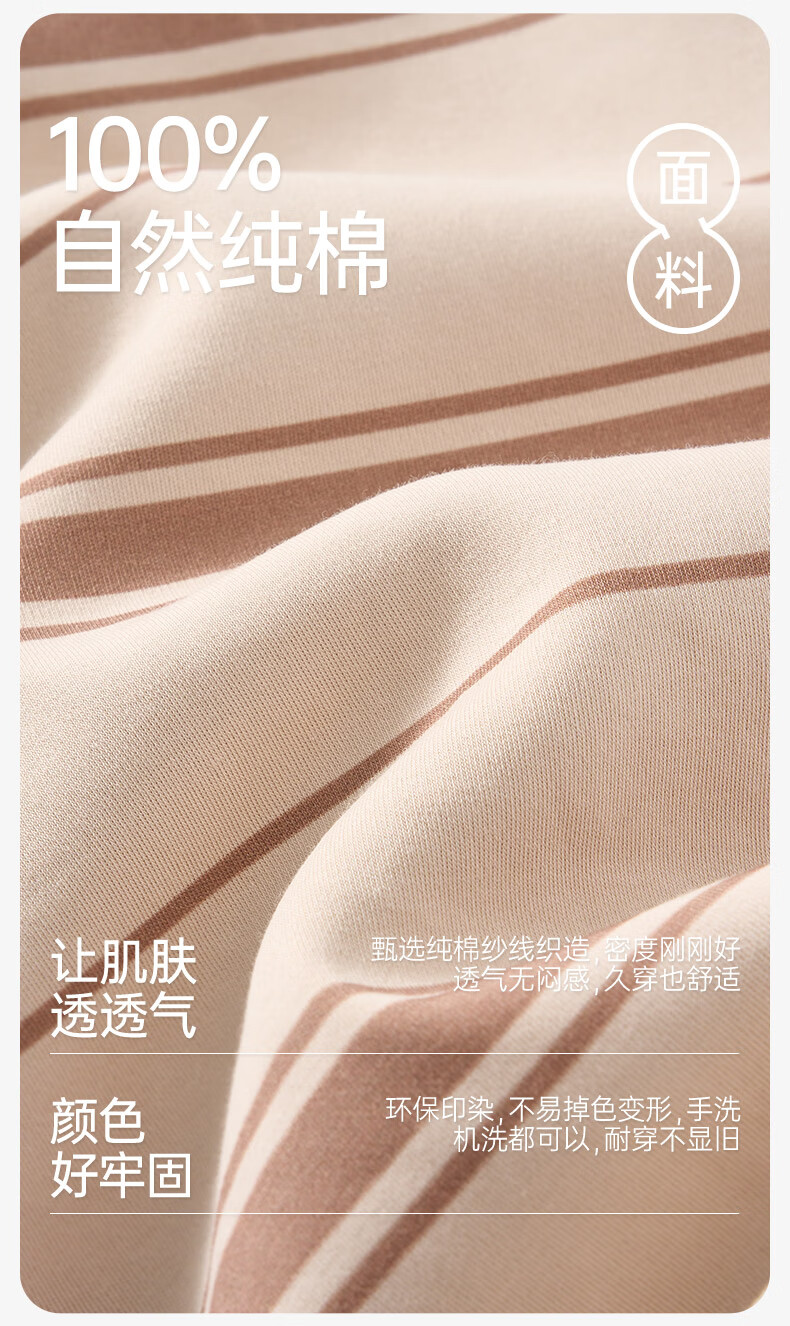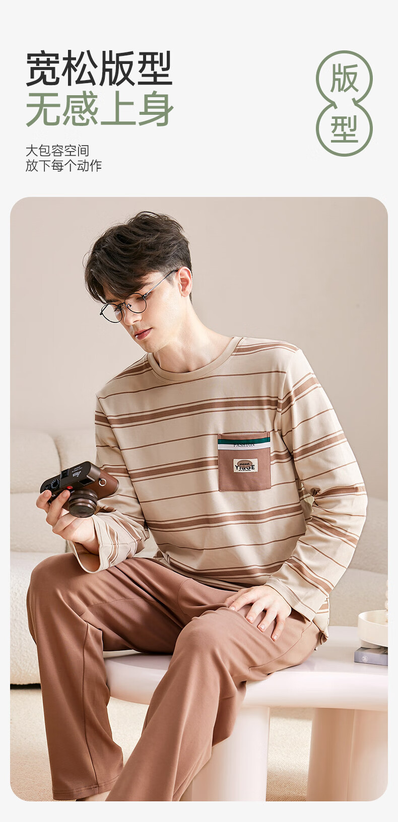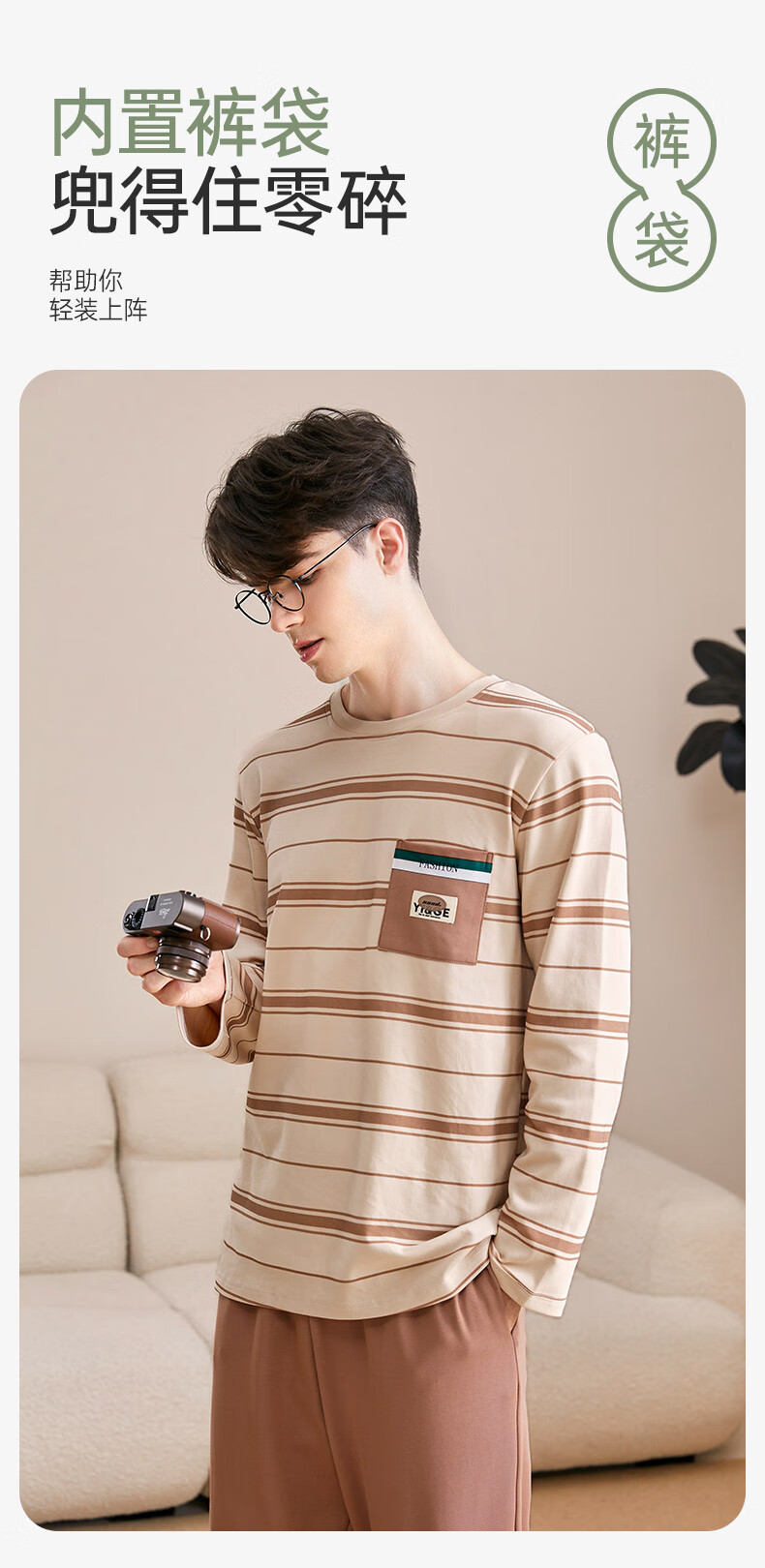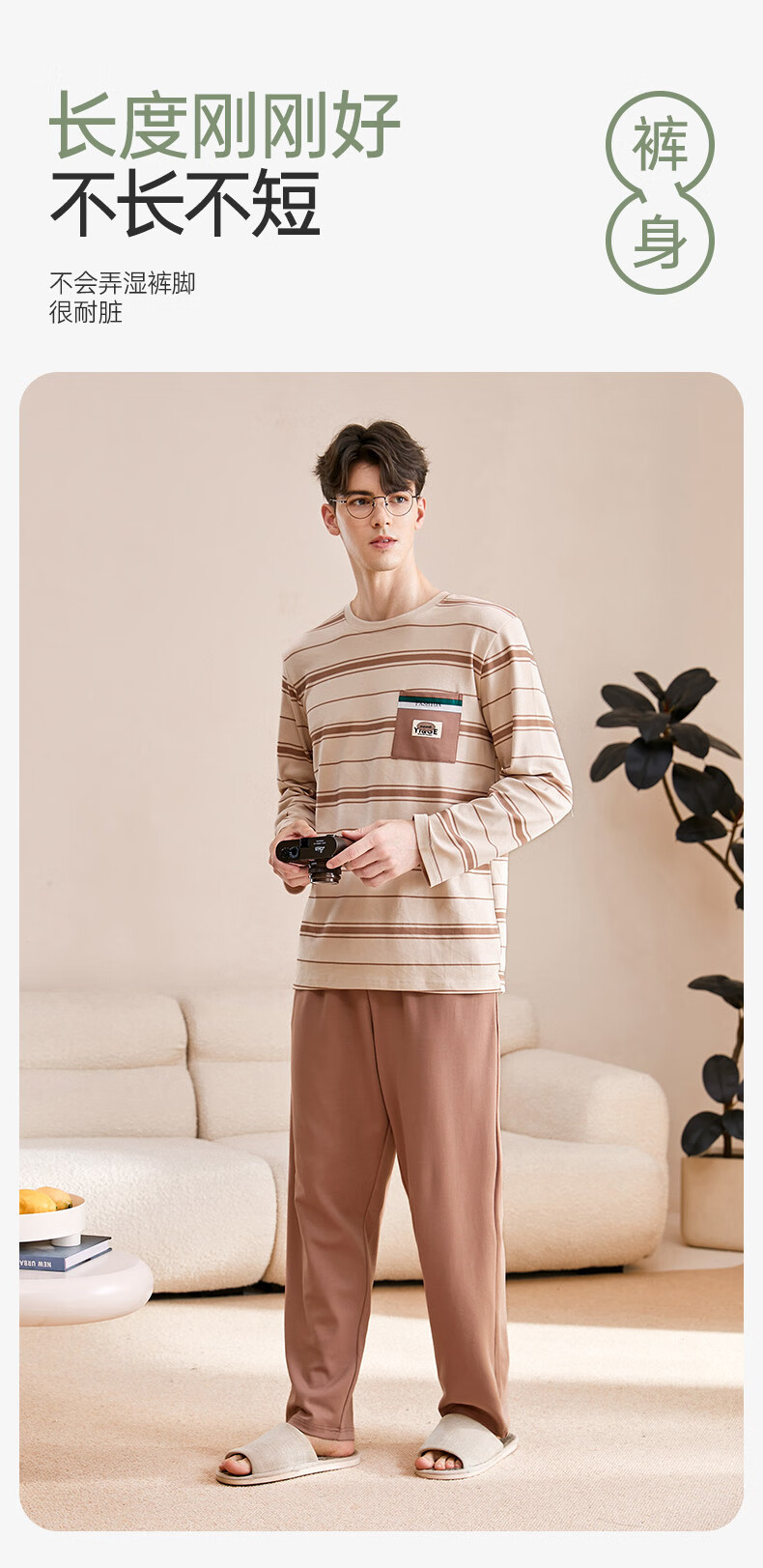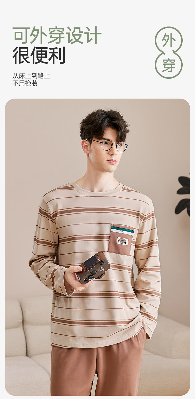 芬腾可安睡衣男【100%纯棉】条纹学生圆领长袖家居服可外穿男士睡衣套装 杏色 L