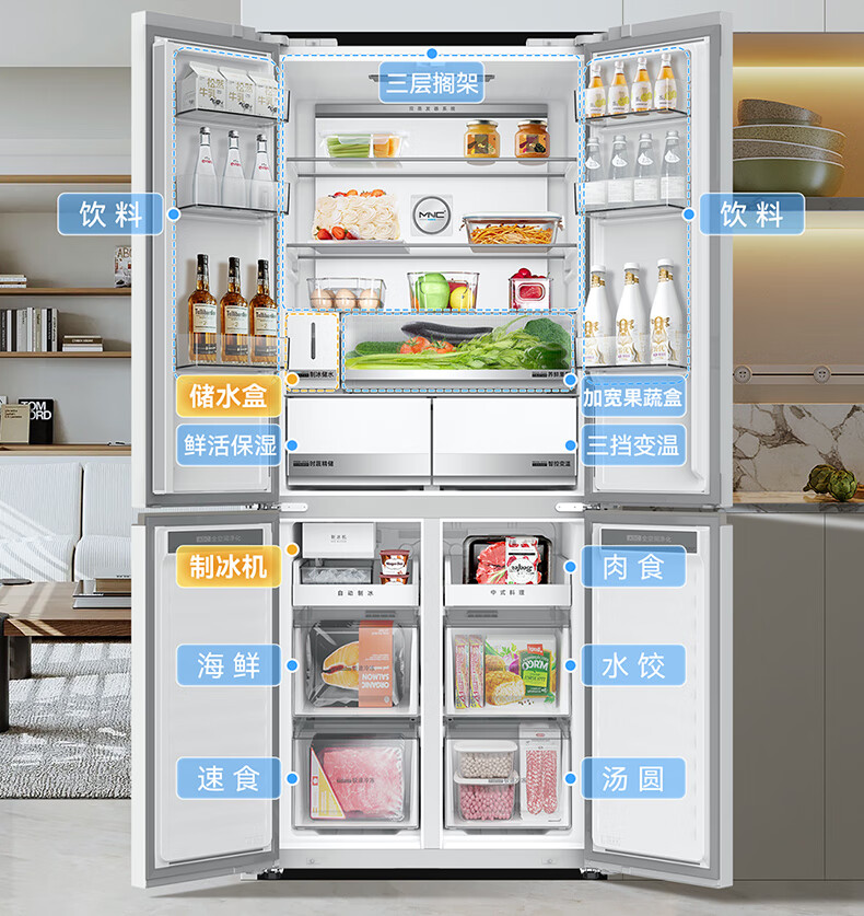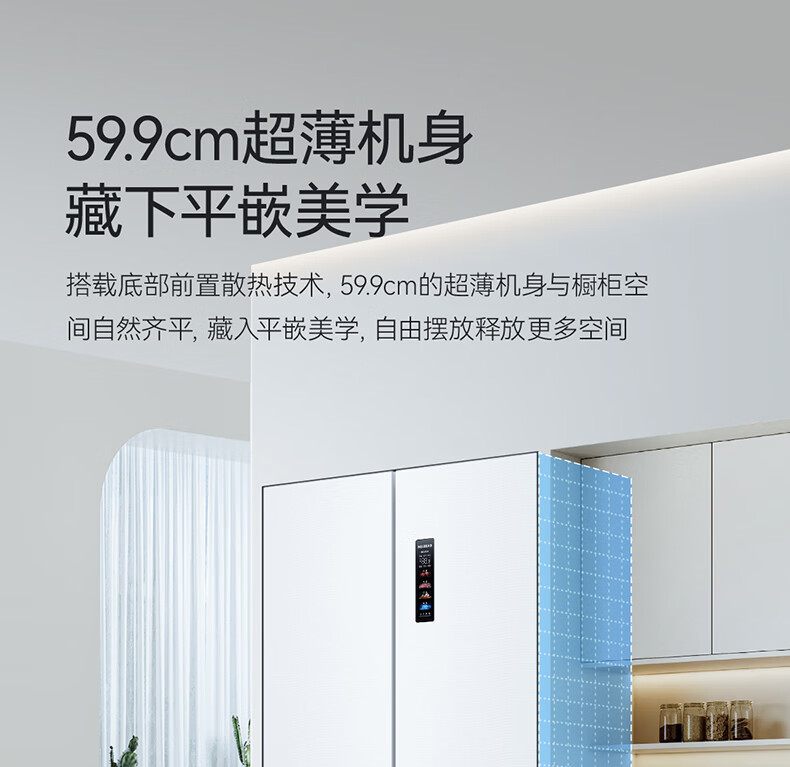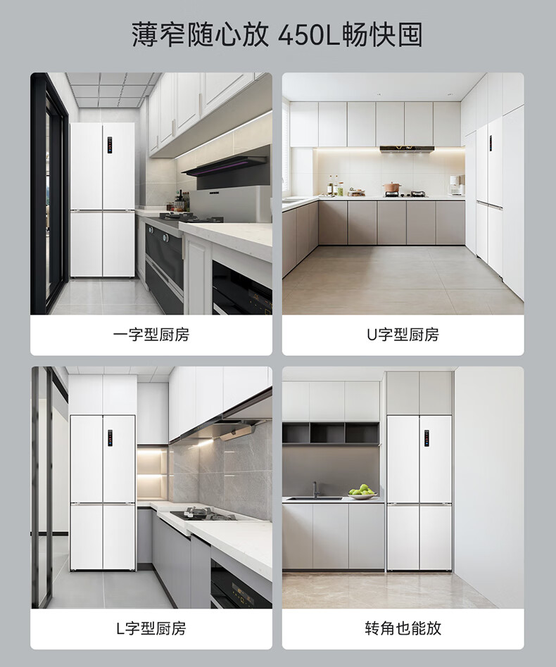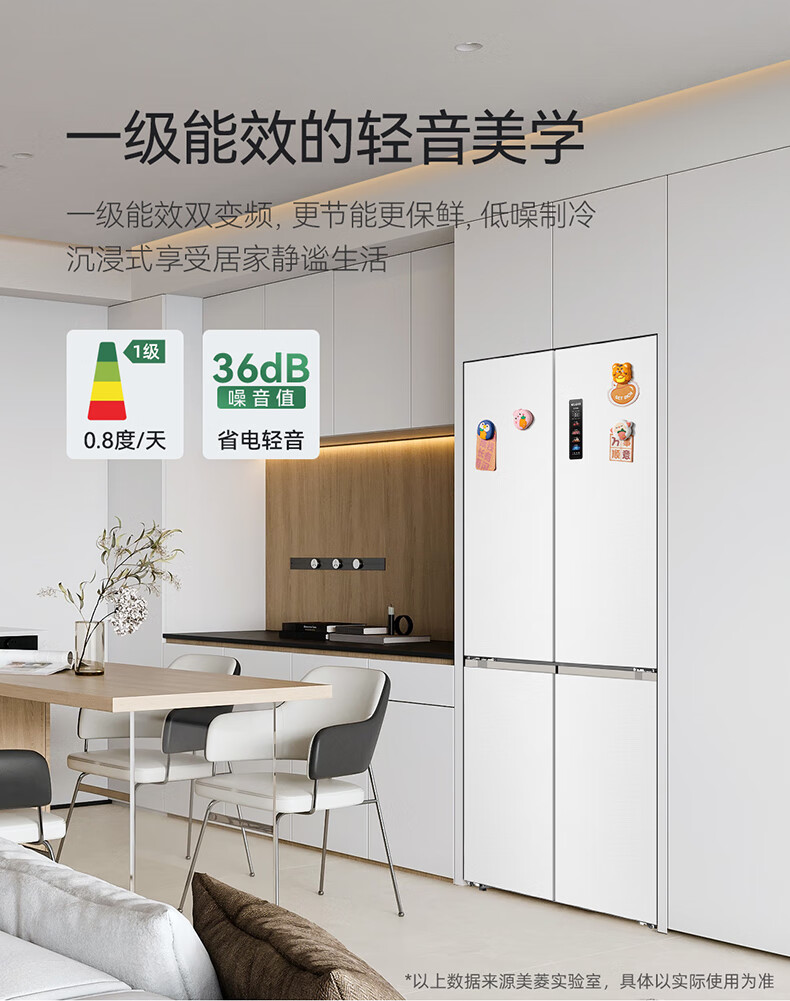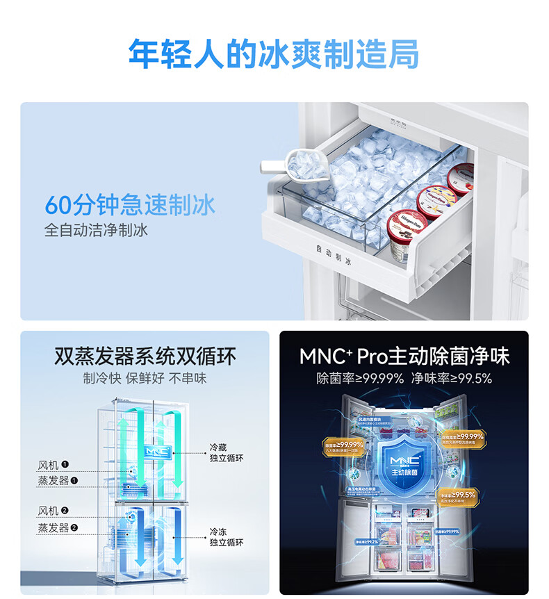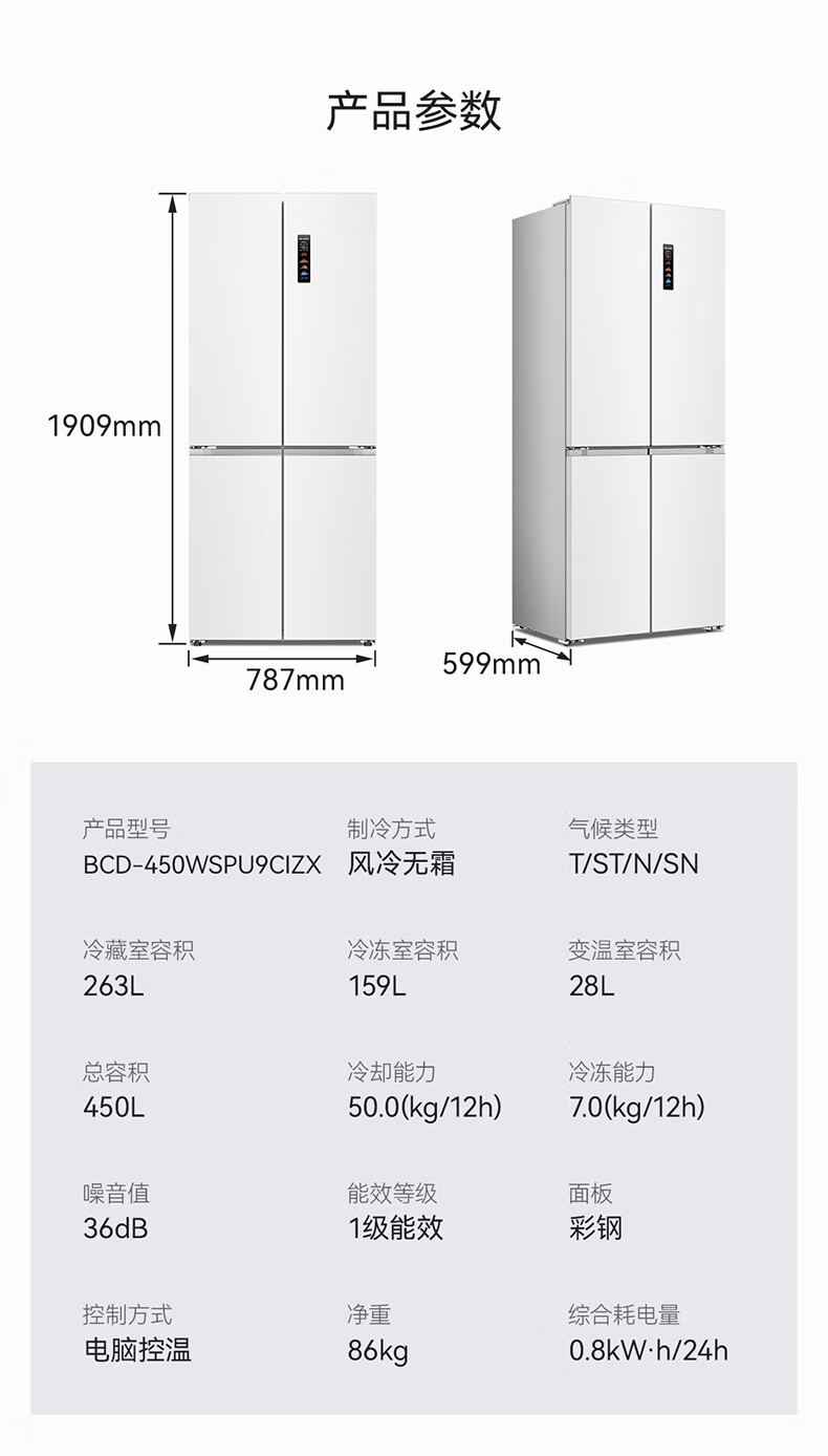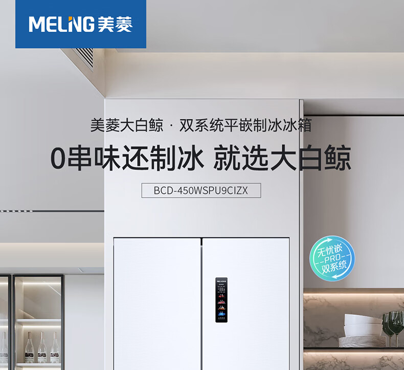 美菱(MeiLing)大白鲸450升自动制冰十字四开门冰箱双系统超薄零嵌入主动除菌底部散热BCD-450WSPU9CIZX国家补贴