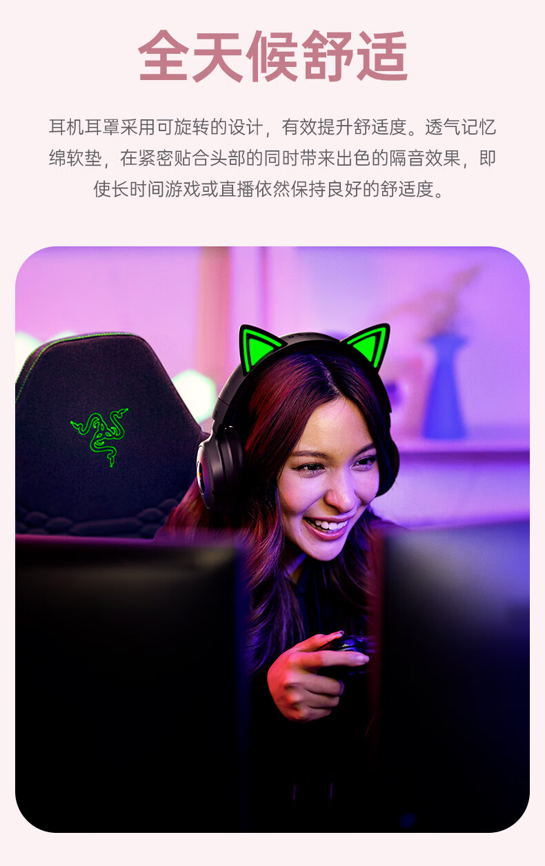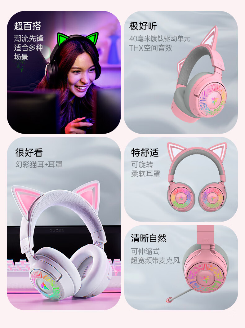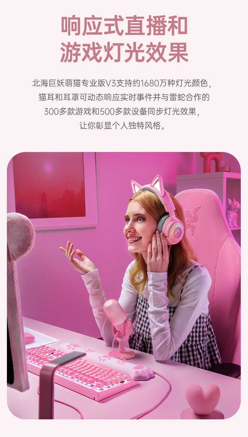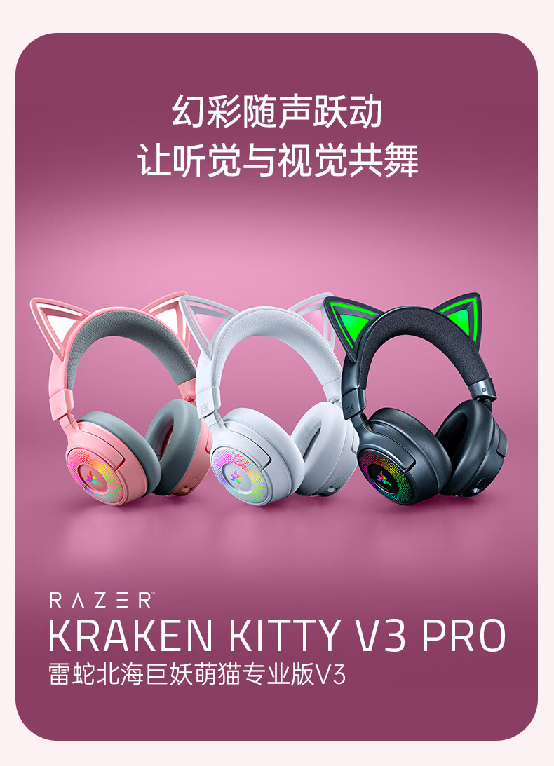 雷蛇(Razer)北海巨妖萌猫专业版V3 头戴式电竞游戏耳机 直播网红猫耳RGB灯效 2.4G/有线/蓝牙三模 三角洲 白色