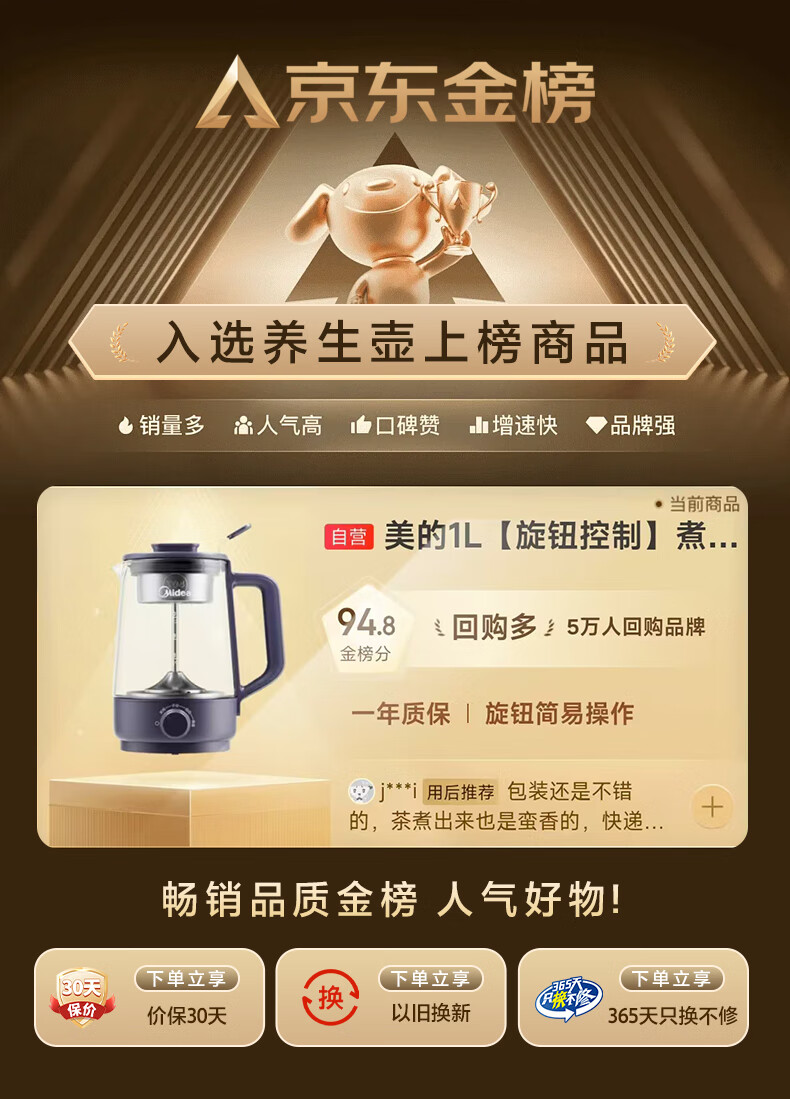 美的(Midea)养生壶 1L大容量一体式喷淋煮茶器蒸煮茶壶 办公室煮茶烧水一体机 304不锈钢花茶白茶ZC10S01