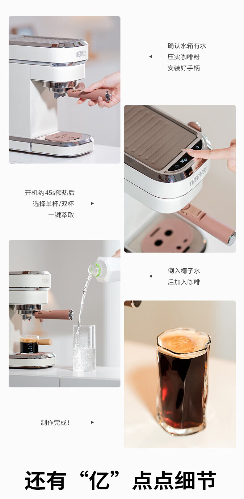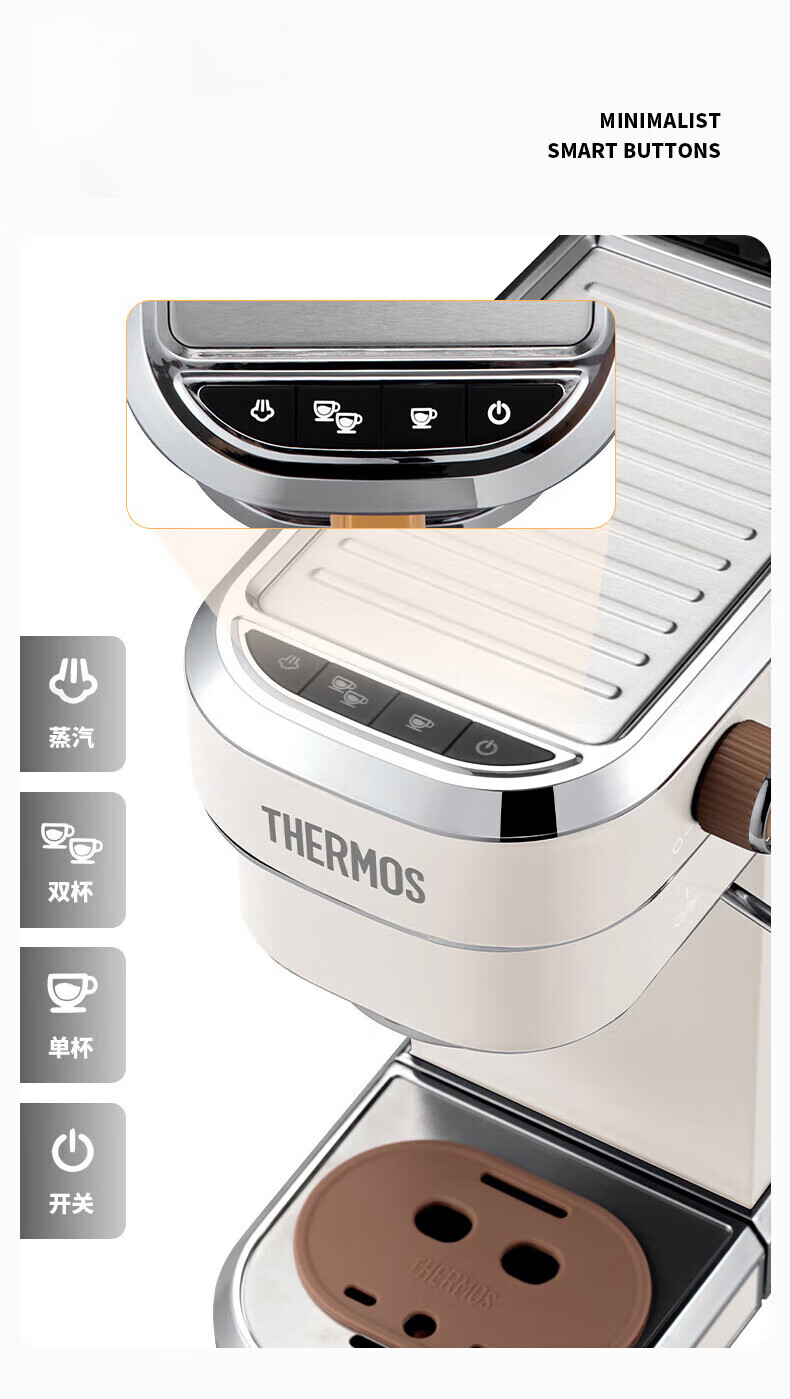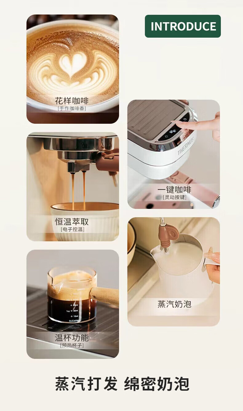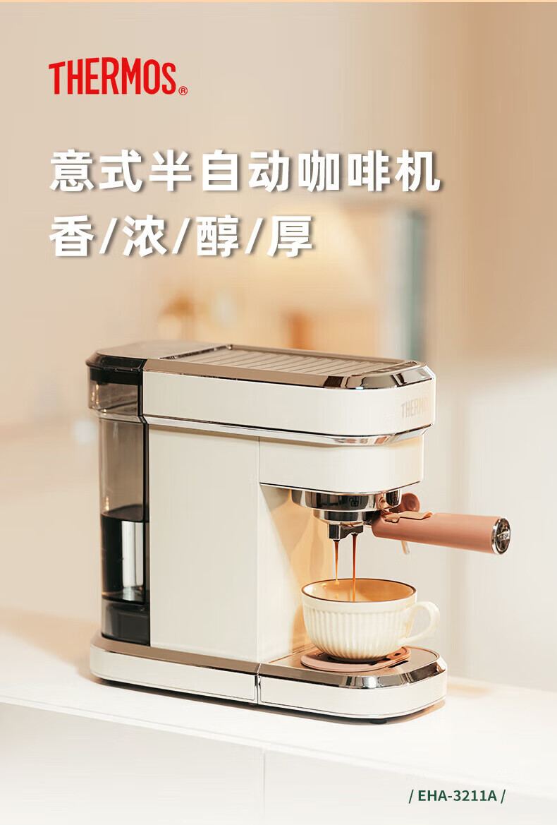 THERMOS【政府补贴】膳魔师意式半自动咖啡机 小型家用浓缩萃取复古便携咖啡机蒸汽奶泡 EHA-3211A-FW