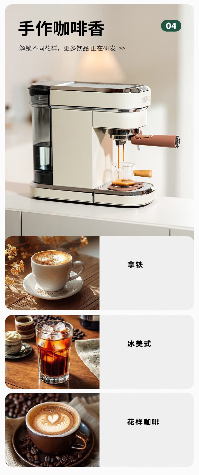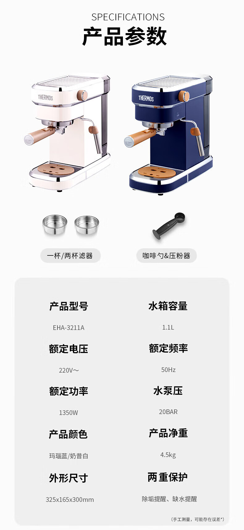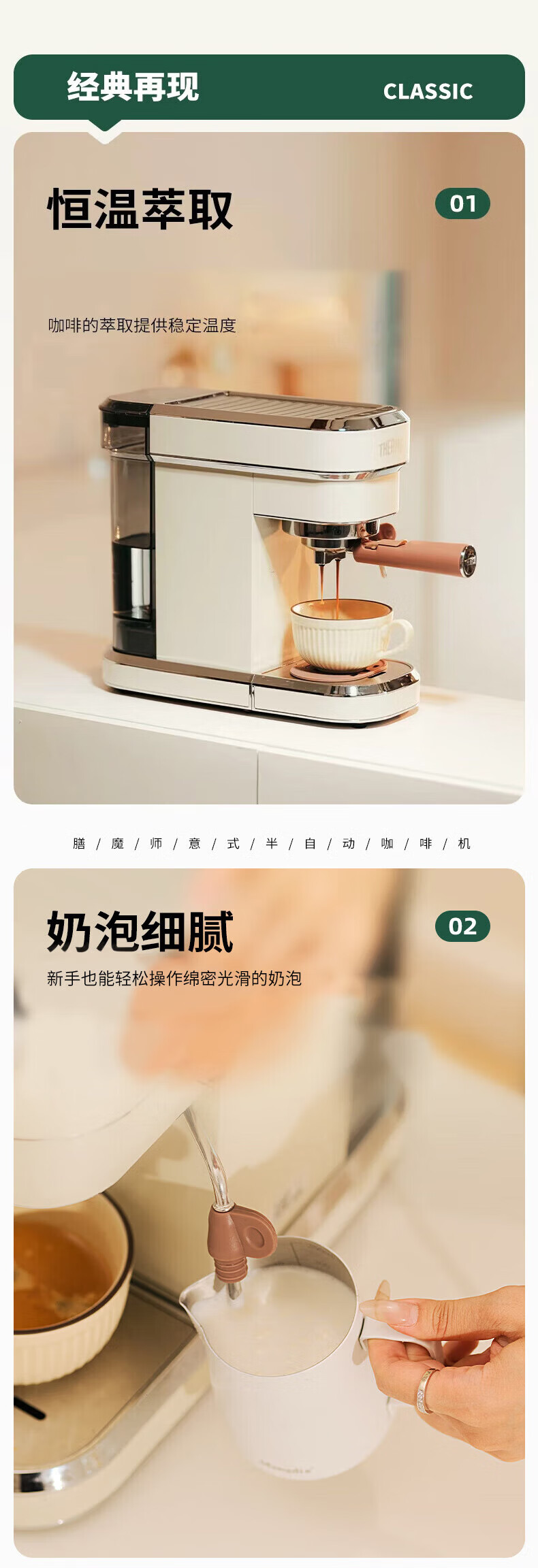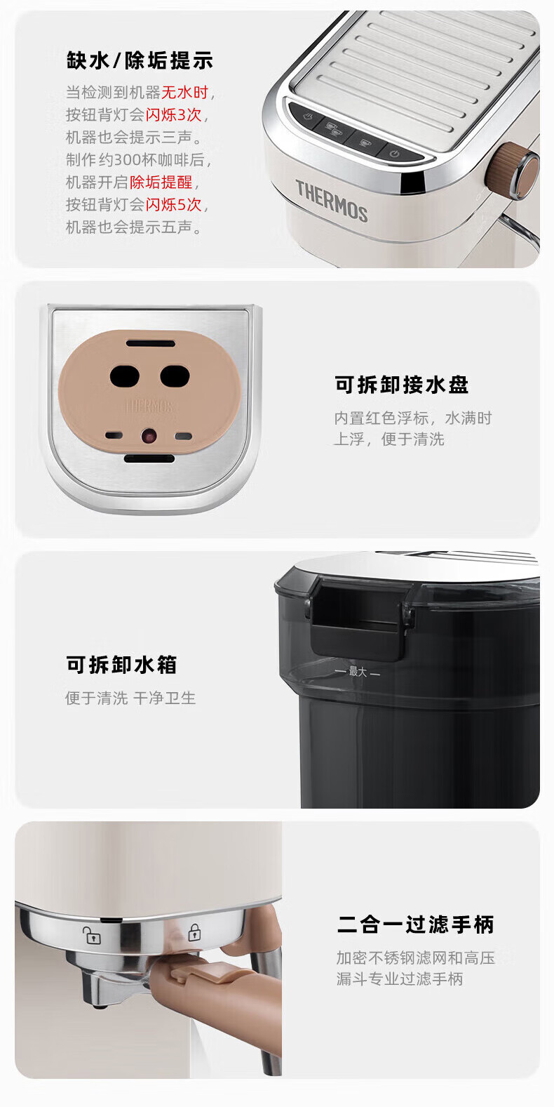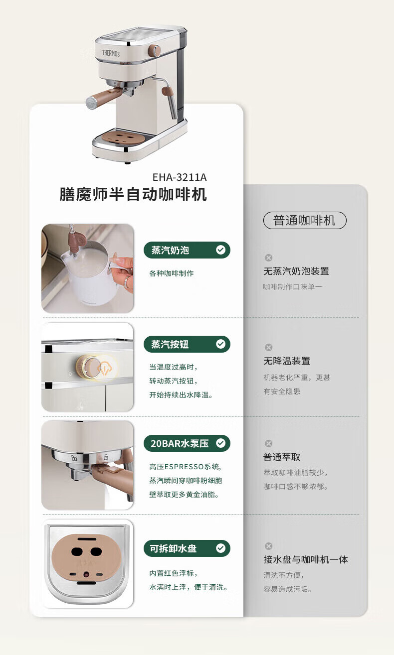 THERMOS【政府补贴】膳魔师意式半自动咖啡机 小型家用浓缩萃取复古便携咖啡机蒸汽奶泡 EHA-3211A-FW