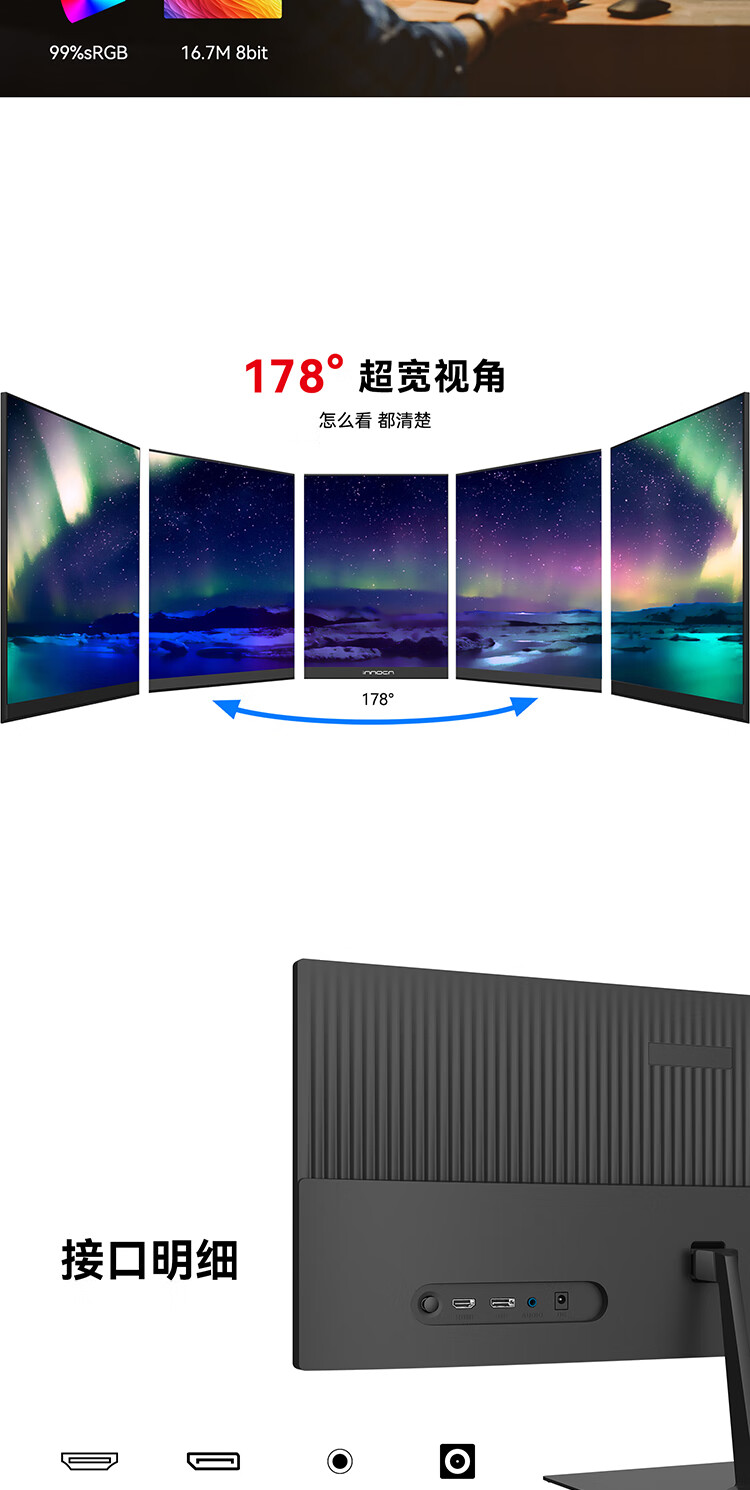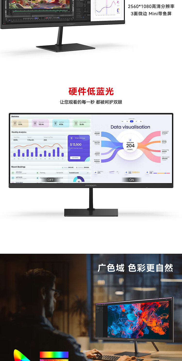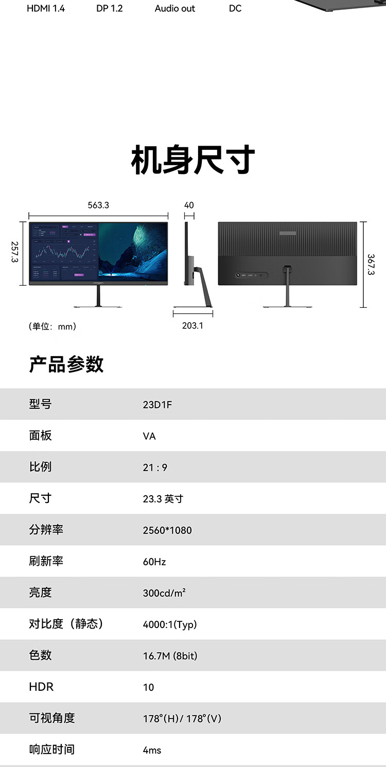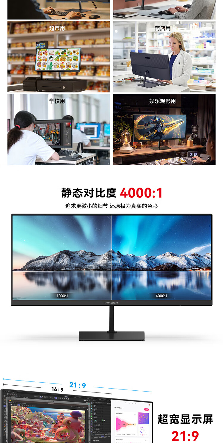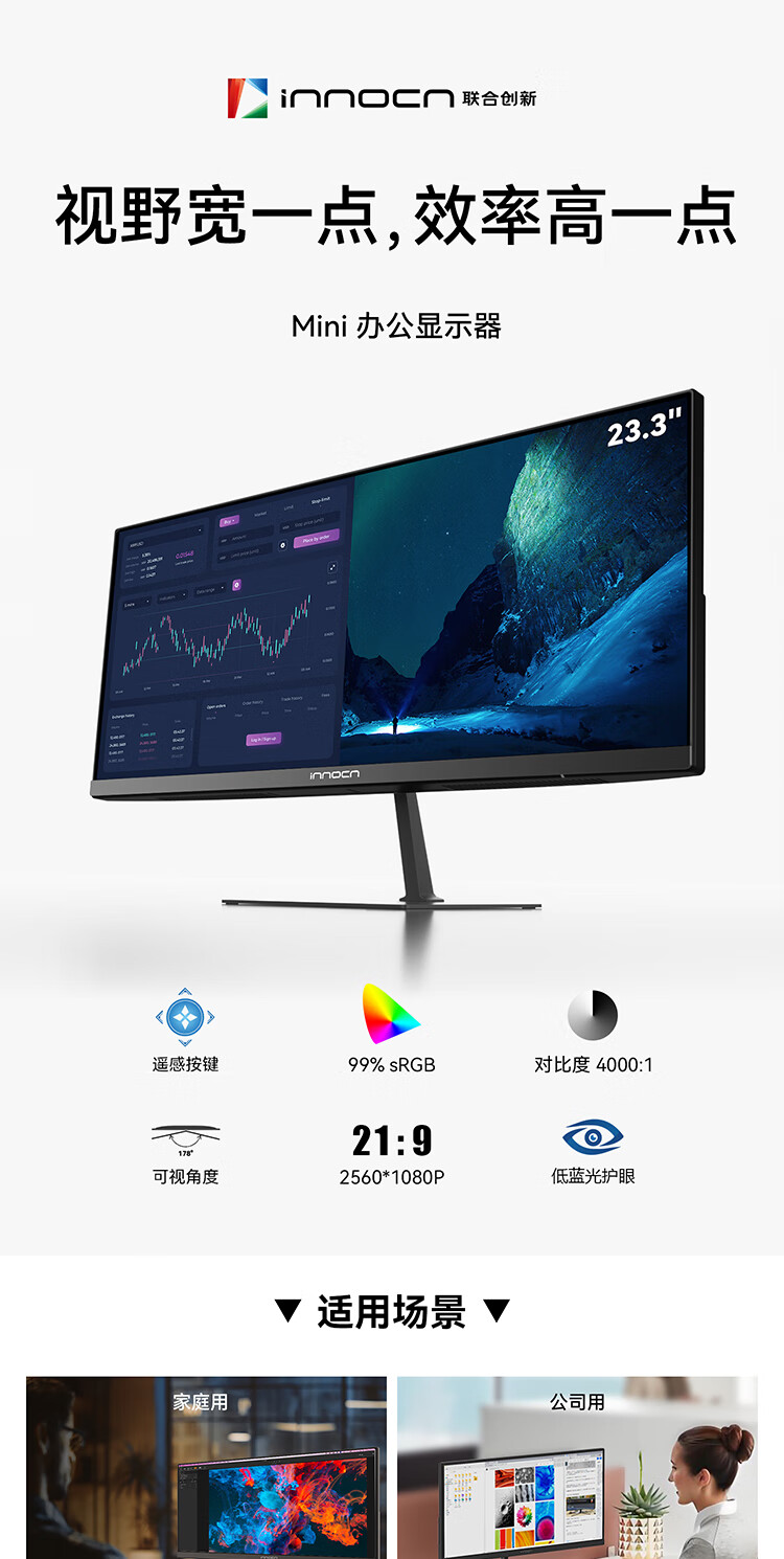 联合创新23.3英寸准2K 21:9超宽带鱼屏 硬件低蓝光护眼 三微边框 视频监控炒股商用办公电脑显示器23D1F