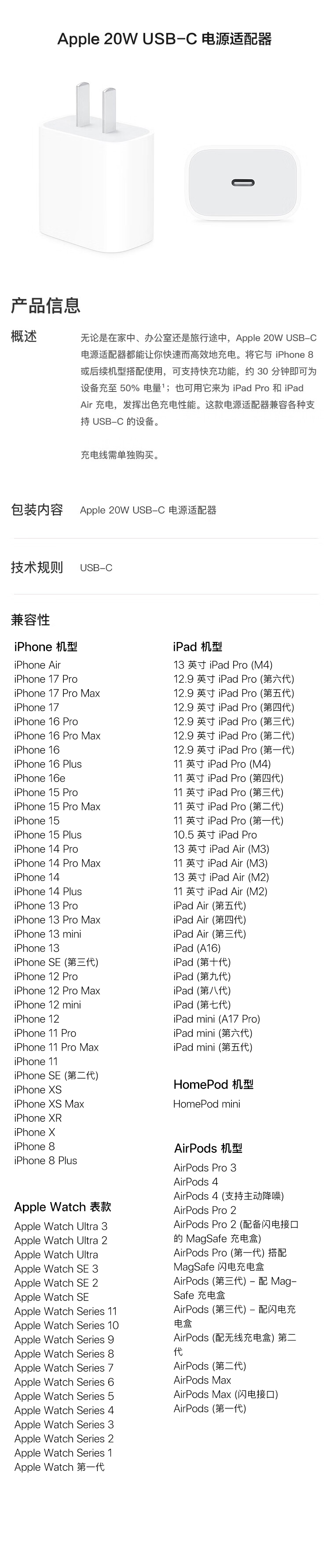 Apple/苹果 20W USB-C手机充电器 原装充电器手机快充头苹果充电器 适用iPhone 17系列/Air新品
