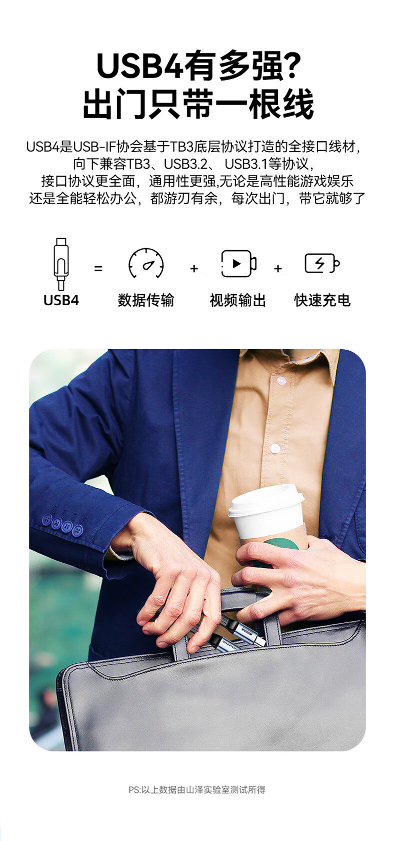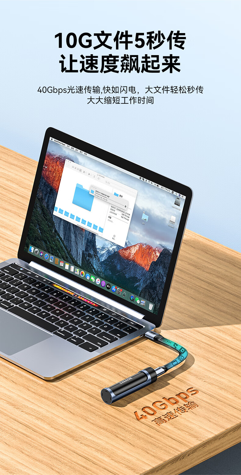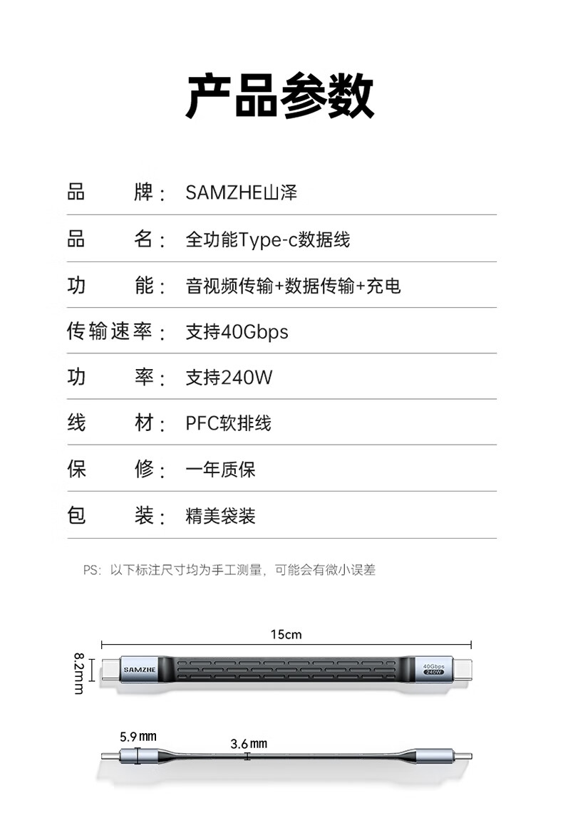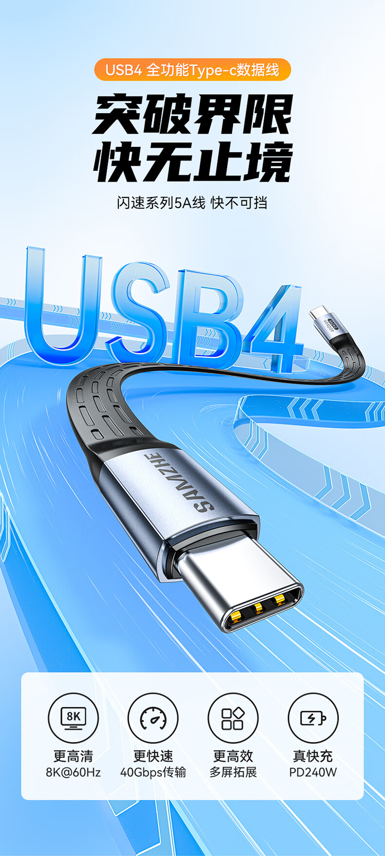 山泽USB4数据线Type-C全功能ctoc兼容雷电4双头短线PD240W快充40Gbps高速传输适用手机电脑移动硬盘