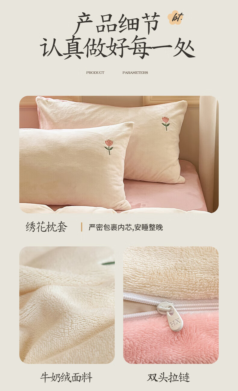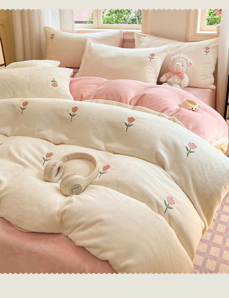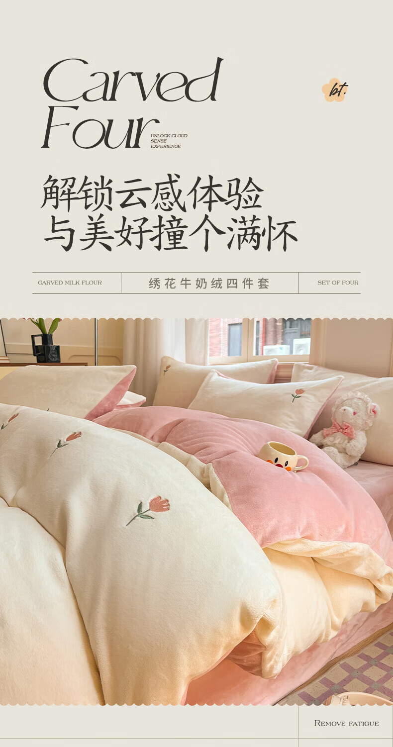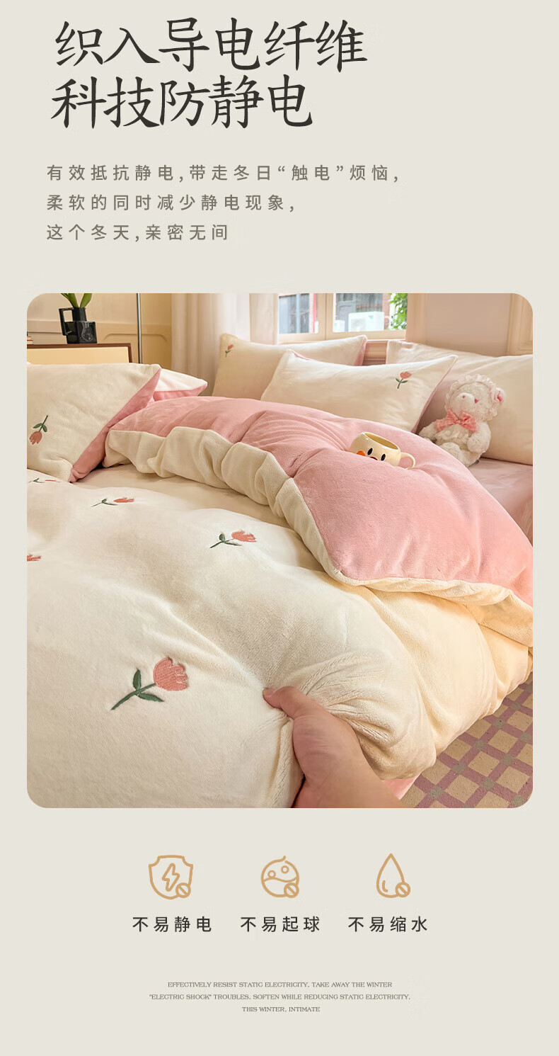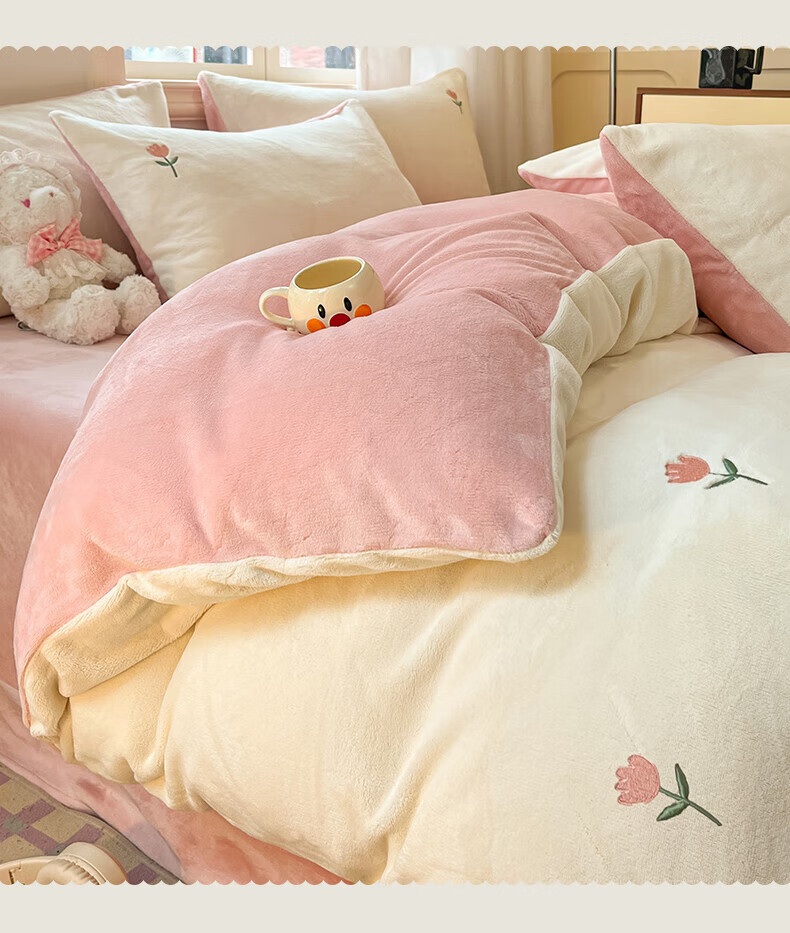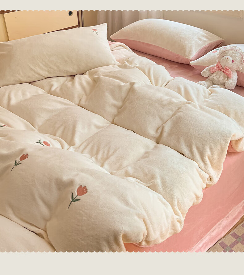 猫人(MiiOW)牛奶绒被套单件冬季双面绒刺绣被罩150x200x230珊瑚绒床单三件套 小花朵-奶白粉【双面厚绒保暖】 200*230cm单被套【柔软舒适】