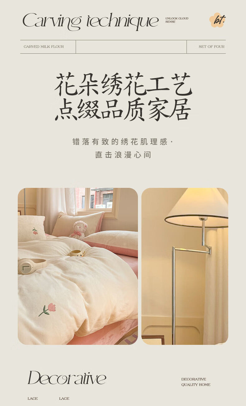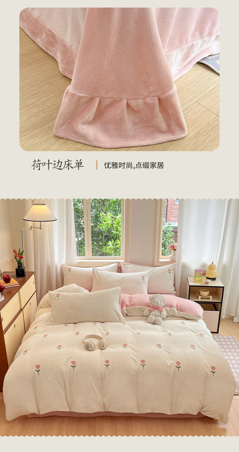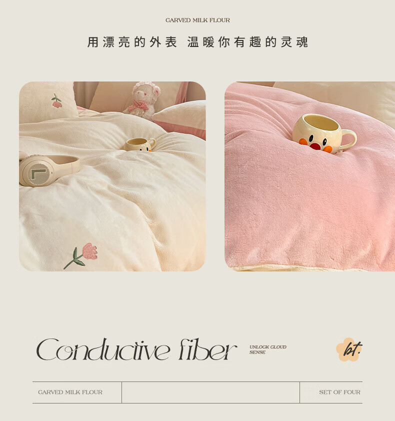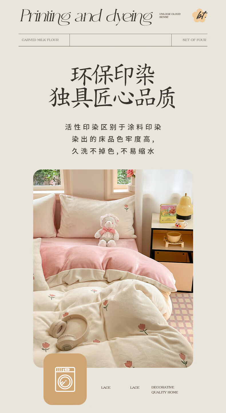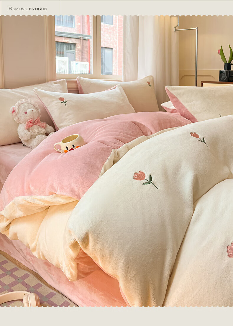 猫人(MiiOW)牛奶绒被套单件冬季双面绒刺绣被罩150x200x230珊瑚绒床单三件套 小花朵-奶白粉【双面厚绒保暖】 200*230cm单被套【柔软舒适】