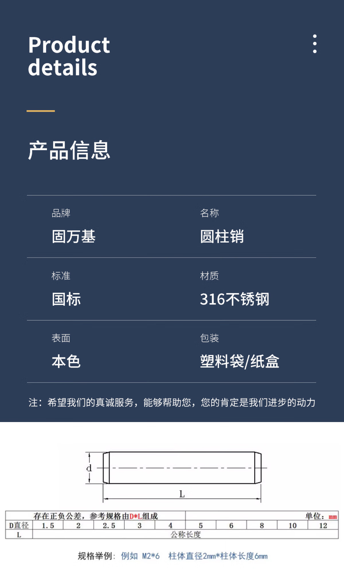 固万基(GUWANJI)316不锈钢圆柱销定位销GB119实心销子固定销销轴快速销钉M3M4-M12 M3x5[100只]