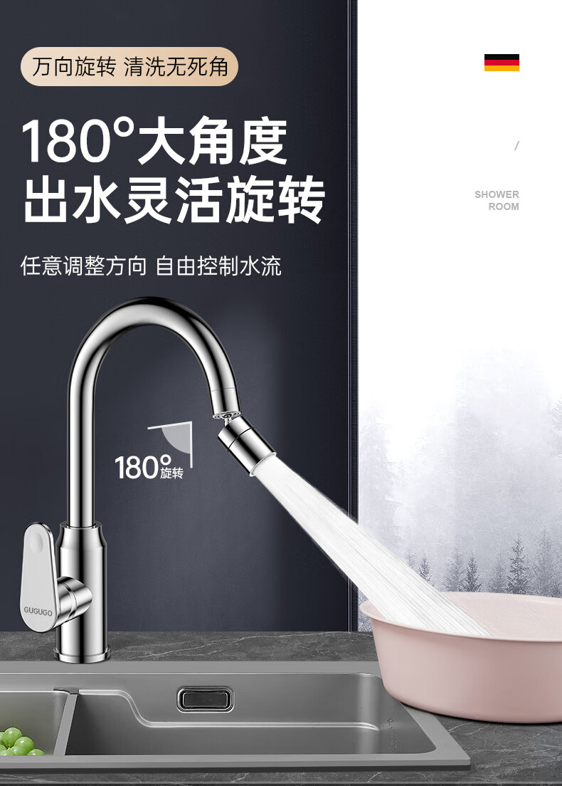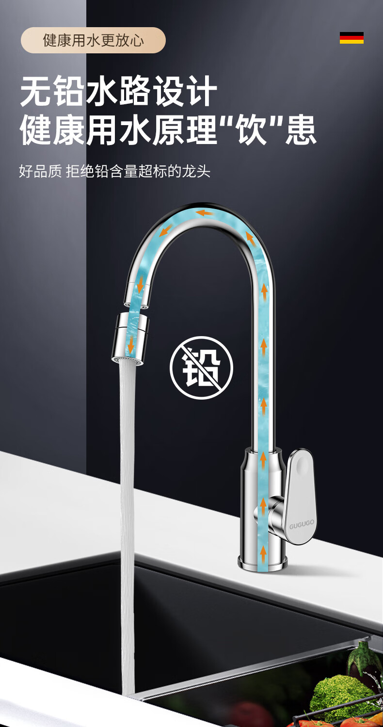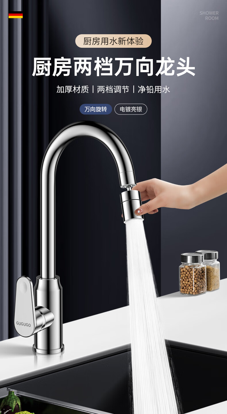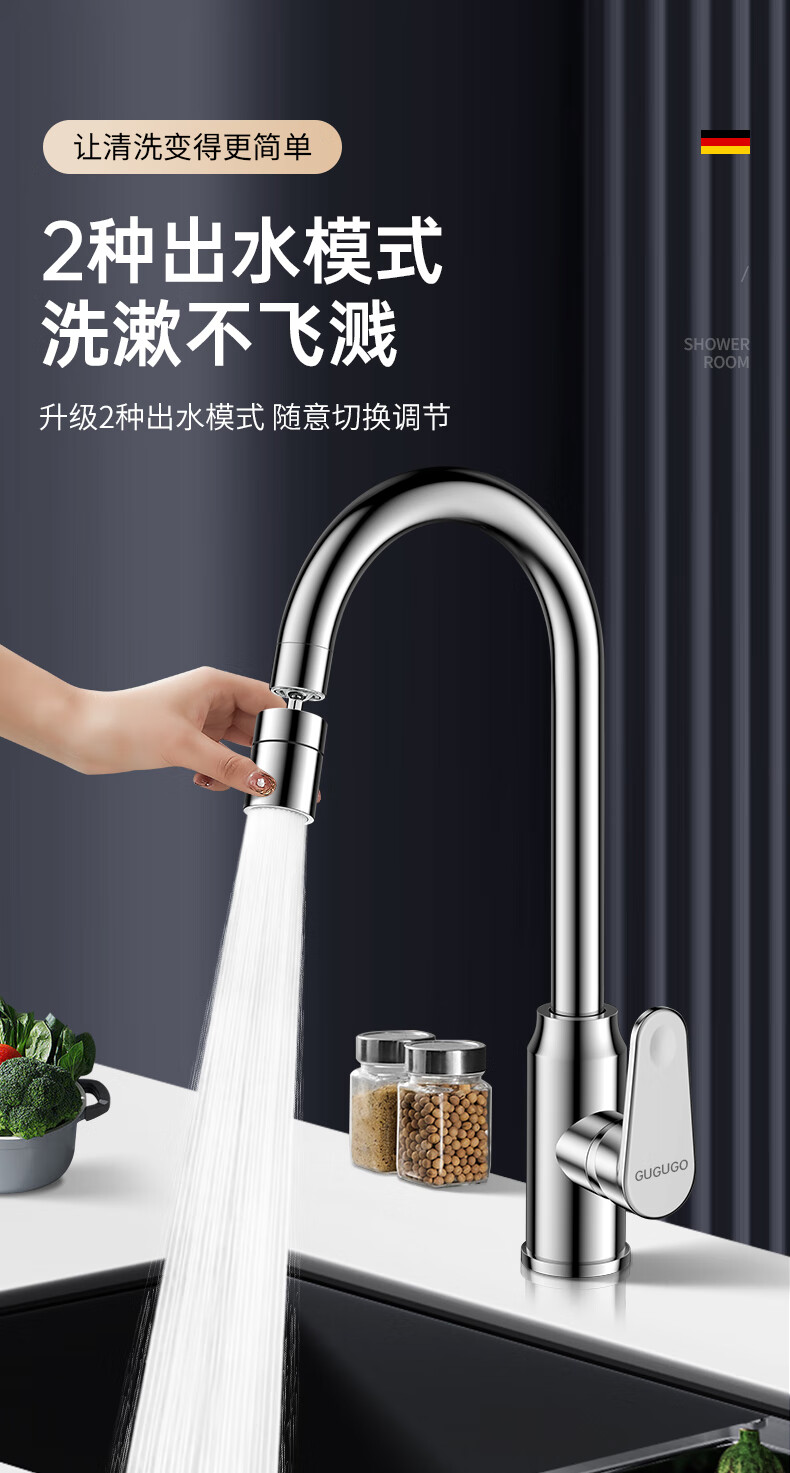 GuGuGo【德国】厨房水龙头洗菜盆冷热水二合一万向旋转水槽高抛水龙头 【电镀】两档万向水龙头 两档防溅丨送80CM不锈钢进水管*2
