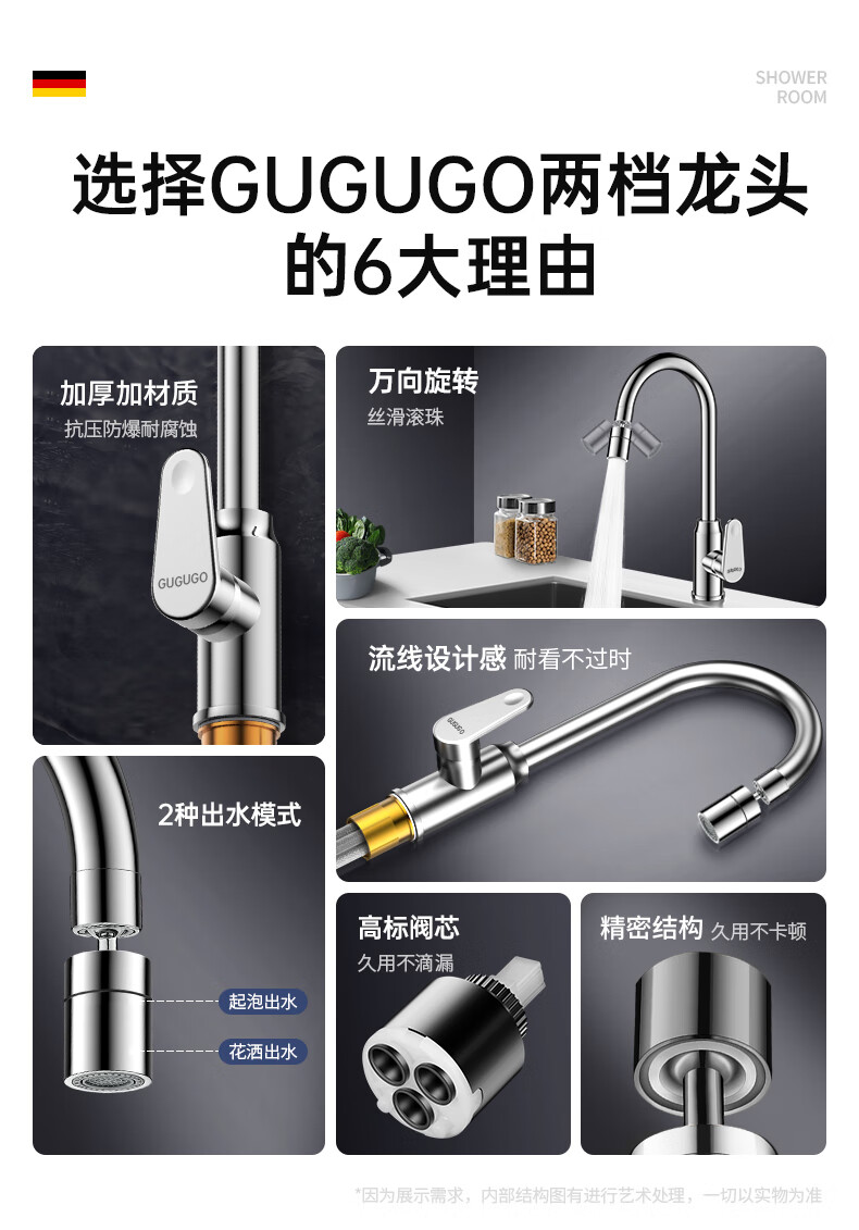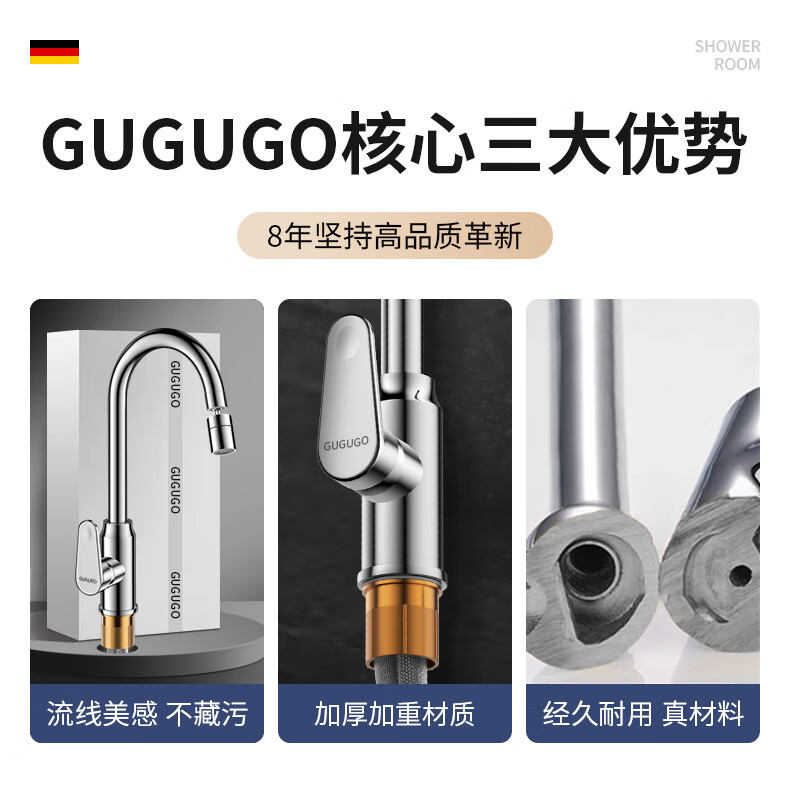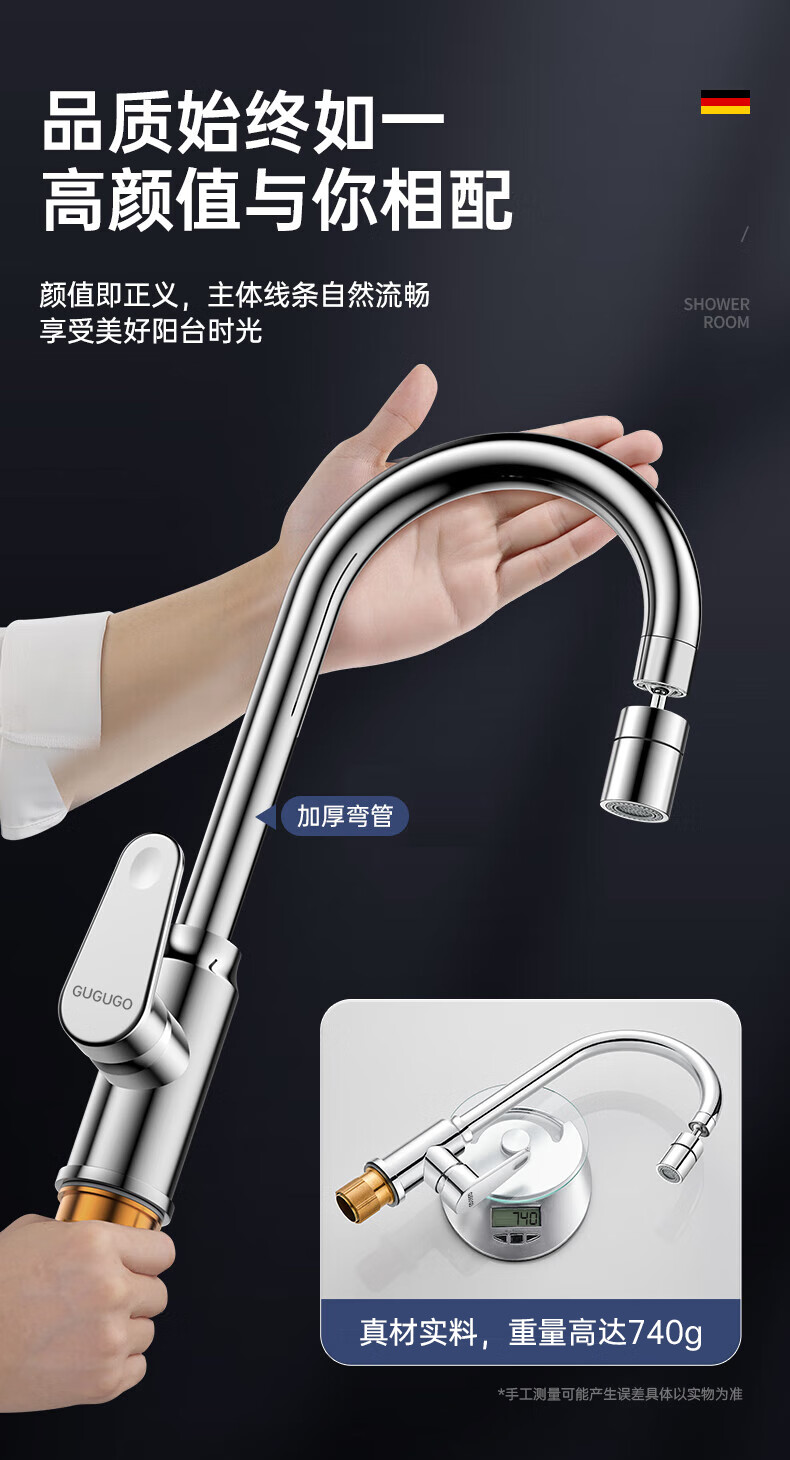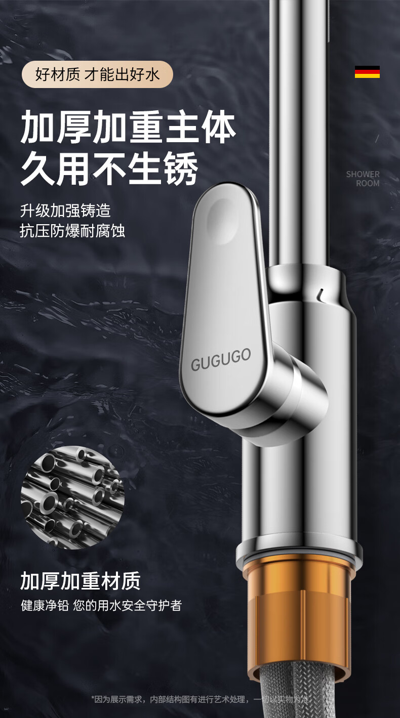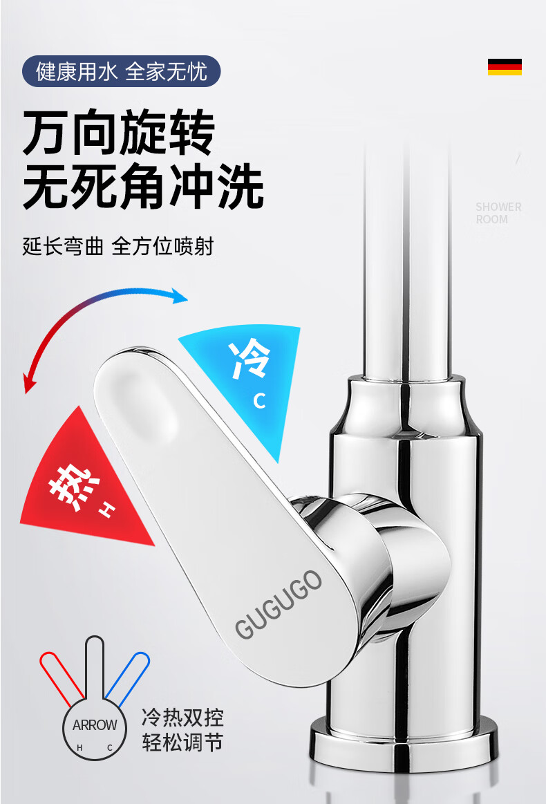 GuGuGo【德国】厨房水龙头洗菜盆冷热水二合一万向旋转水槽高抛水龙头 【电镀】两档万向水龙头 两档防溅丨送80CM不锈钢进水管*2