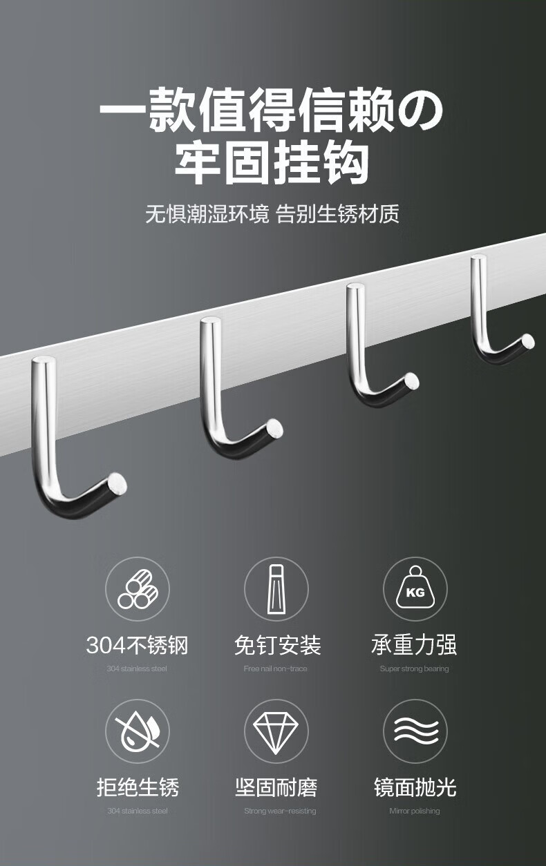 梦庭挂钩免打孔304不锈钢挂钩贴 挂衣服挂钩粘钩浴室卫生间排钩 6钩