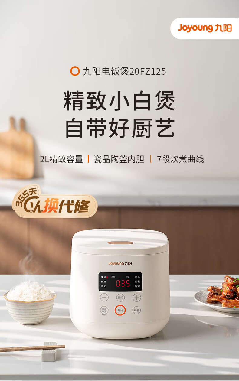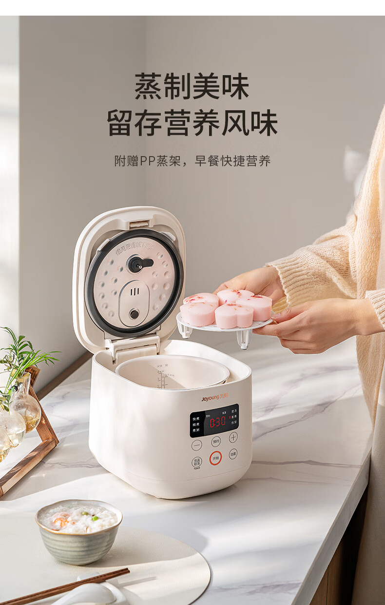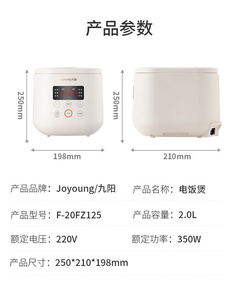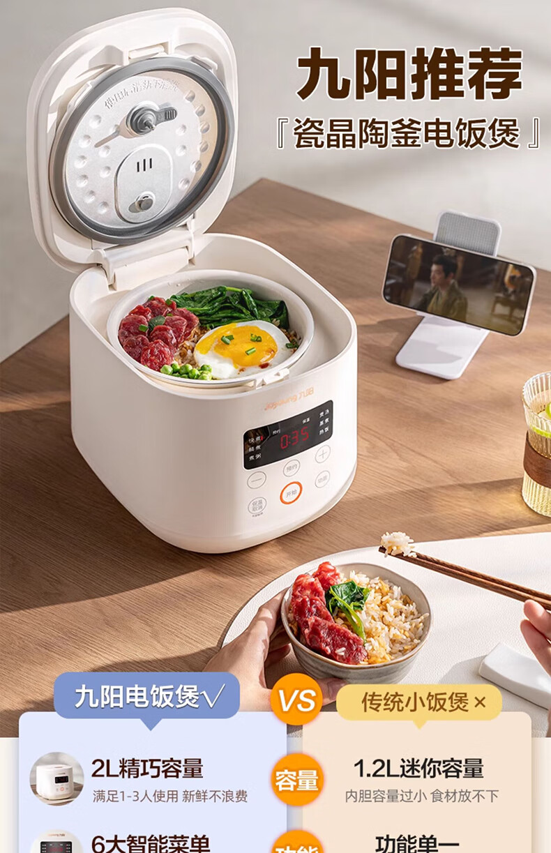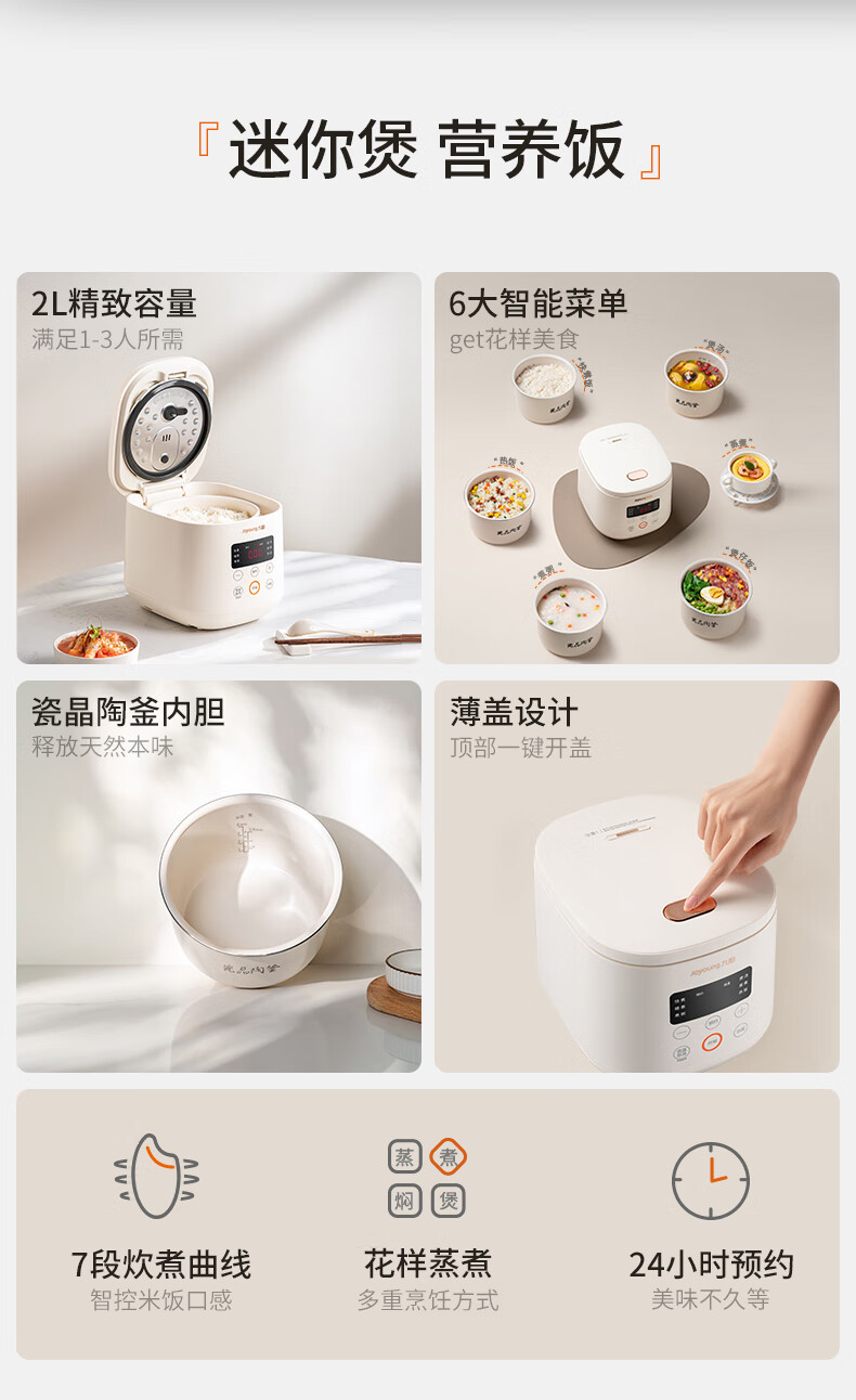 九阳(Joyoung)电饭煲电饭锅迷你家用不粘小容量1-2-3人快煮饭多功能锅微压预约2L升蒸饭器小型锅 【瓷晶陶釜内胆】F-20FZ125 2L