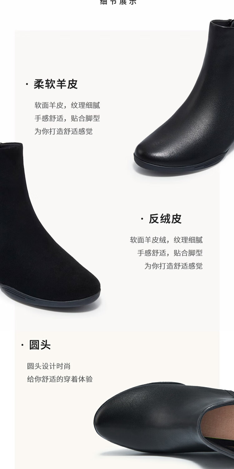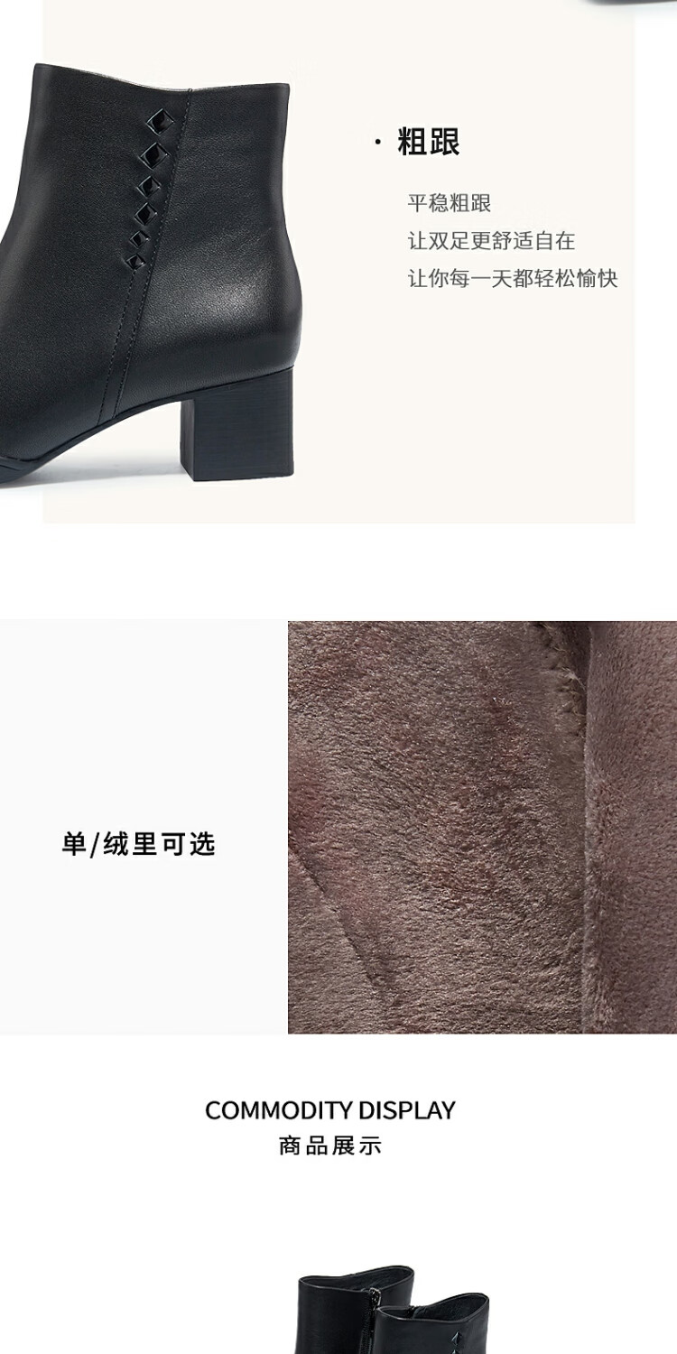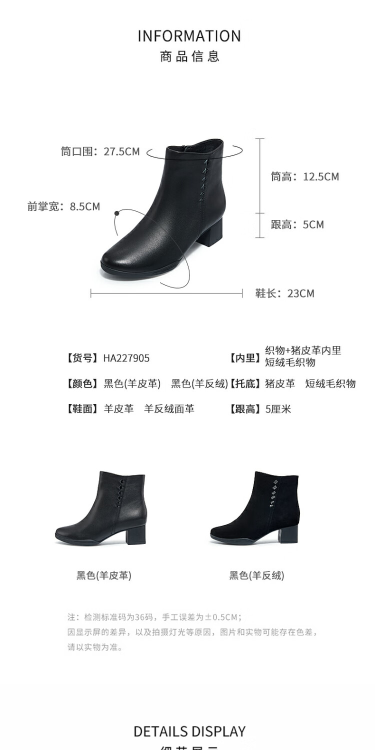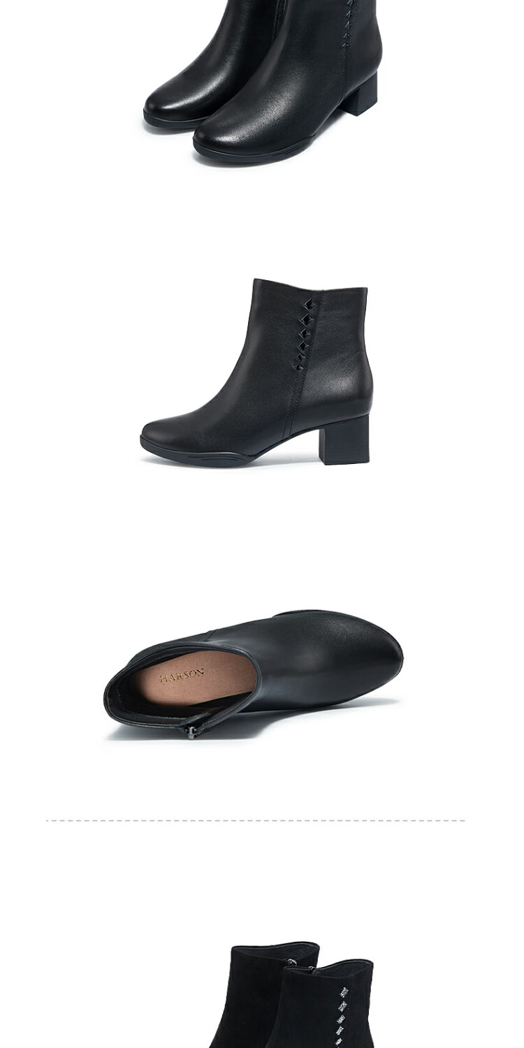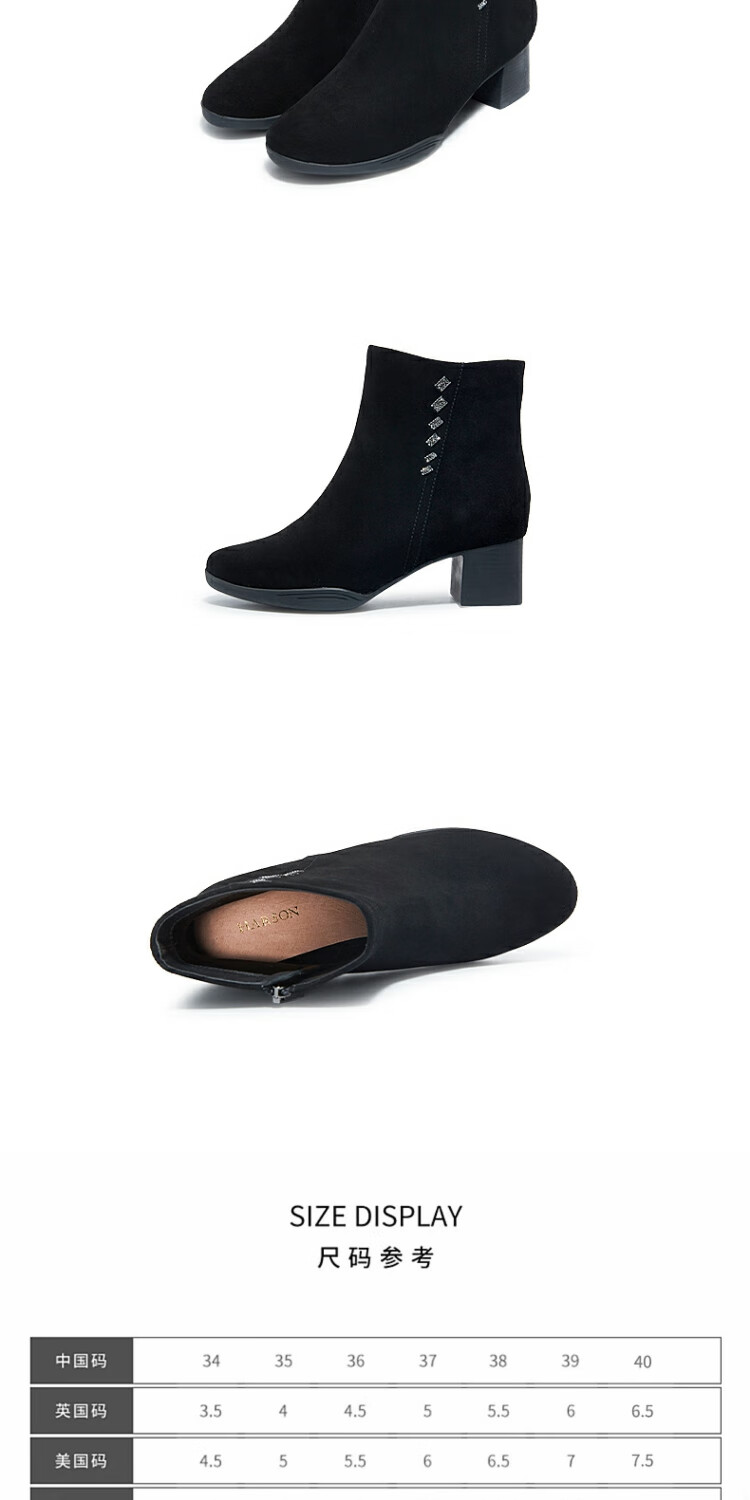 哈森秋冬季黑色绒面高跟时装靴百搭通勤保暖绒里女靴HA227905 黑色 羊皮革 34