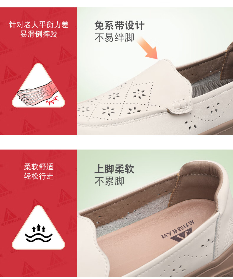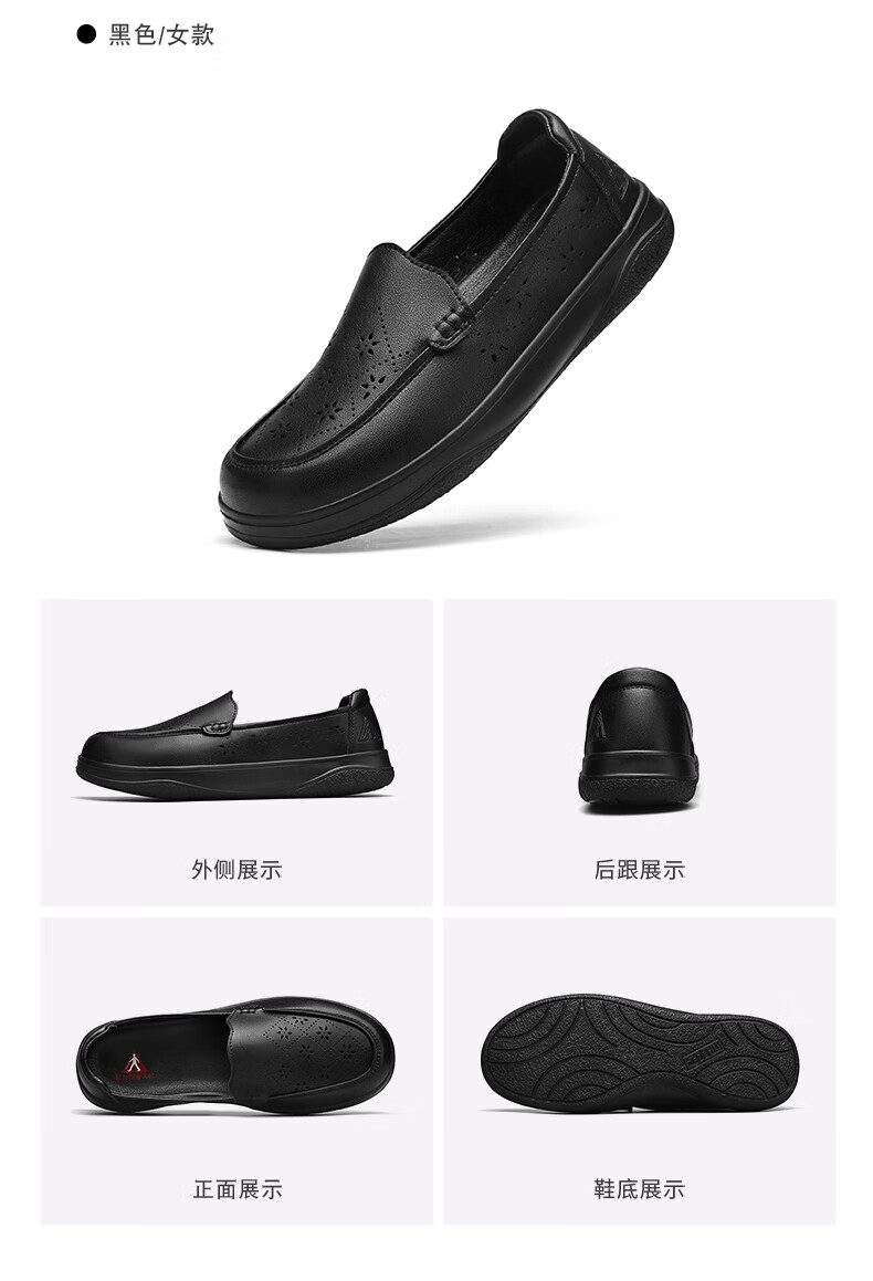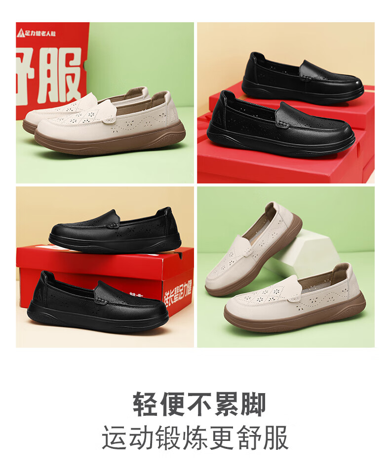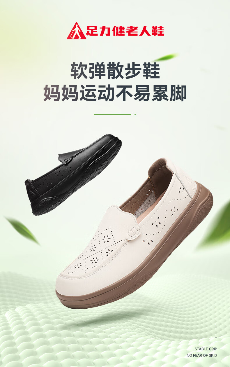 足力健正品老人鞋夏季新款透气皮鞋女士便捷一脚蹬软底软面时尚妈妈鞋 黑色 35