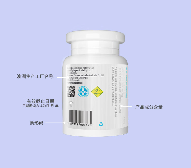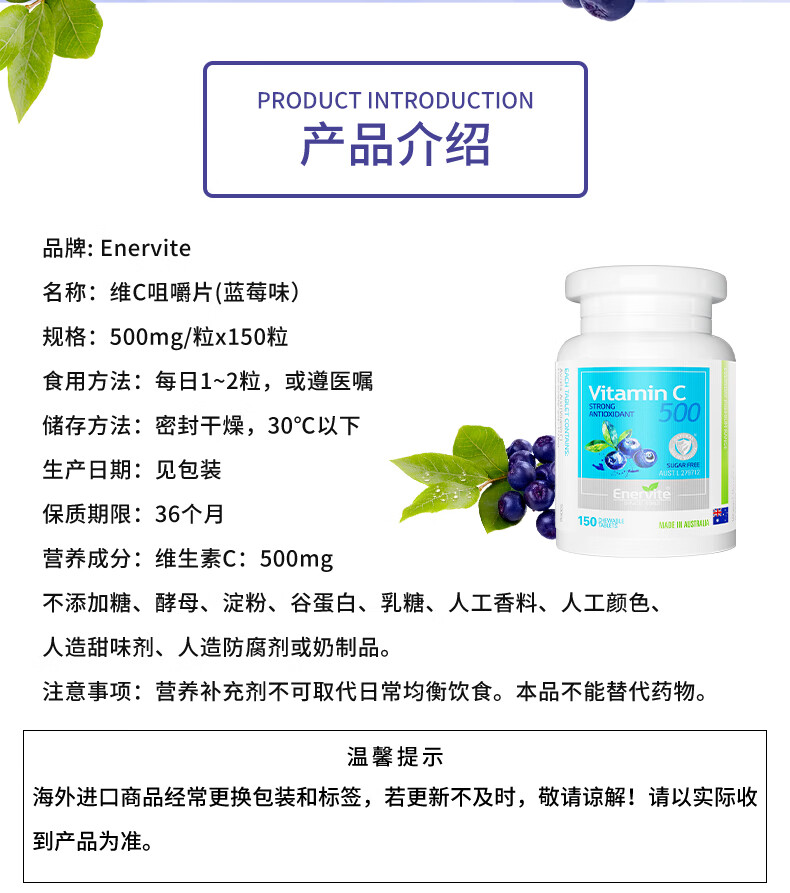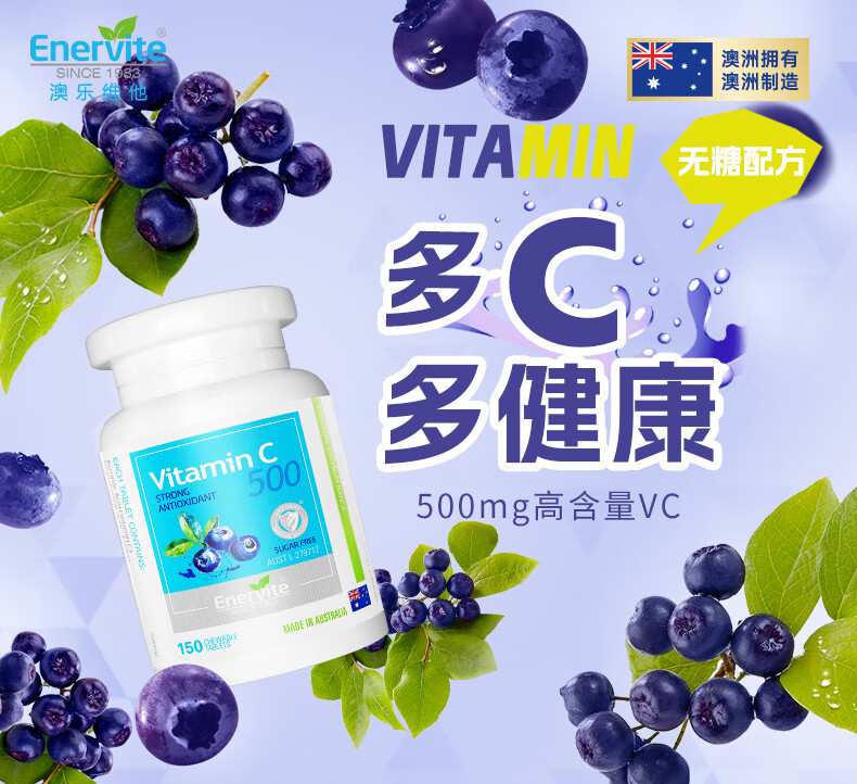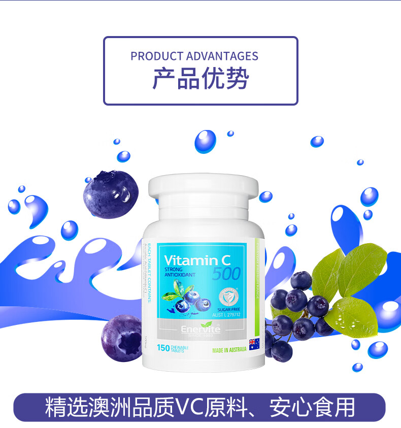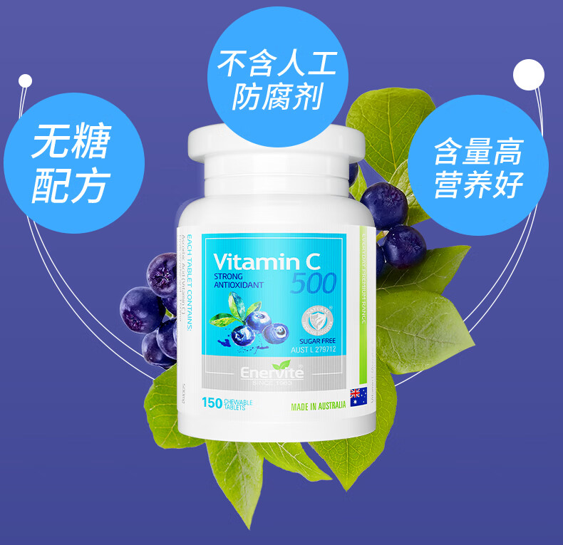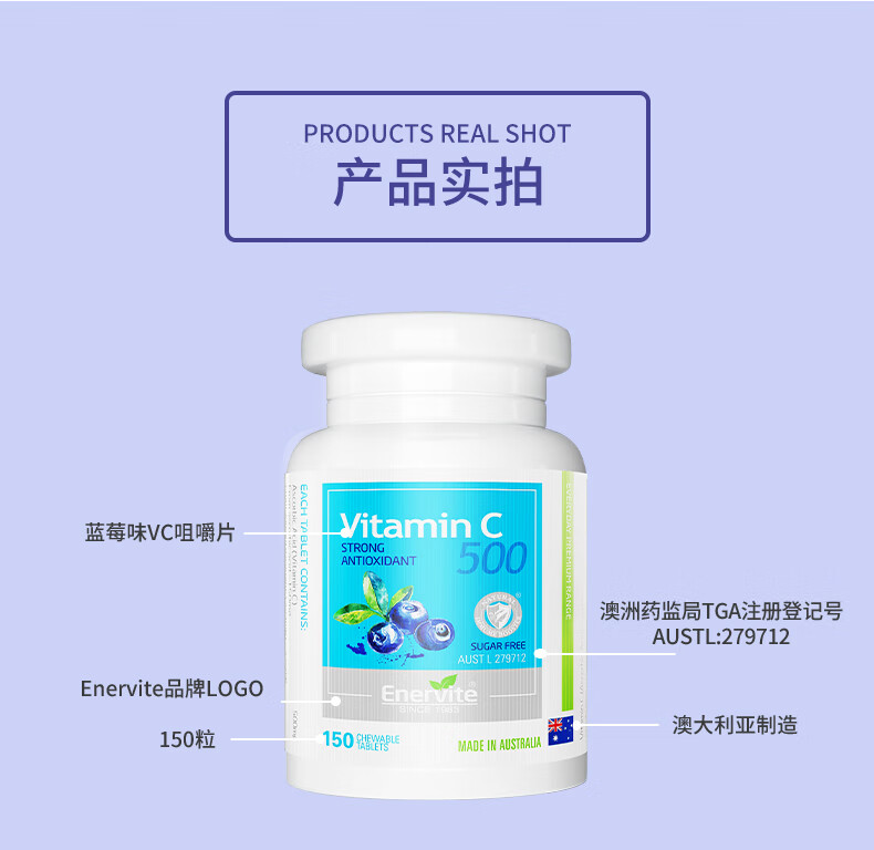 EnerVite维生素c咀嚼片蓝莓味补充VC 成人通用含量500mg/粒复合维生素营养 维C蓝莓片150片 【效期到26年1月】