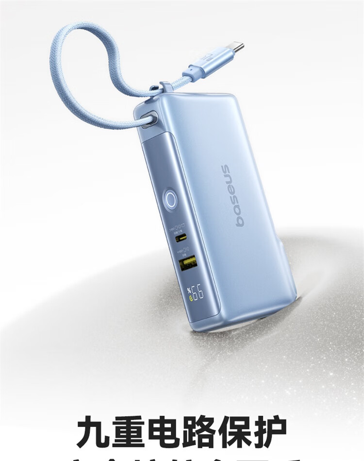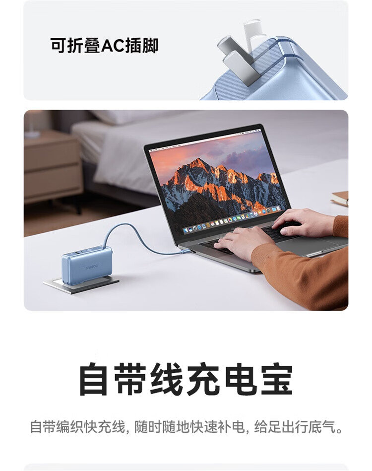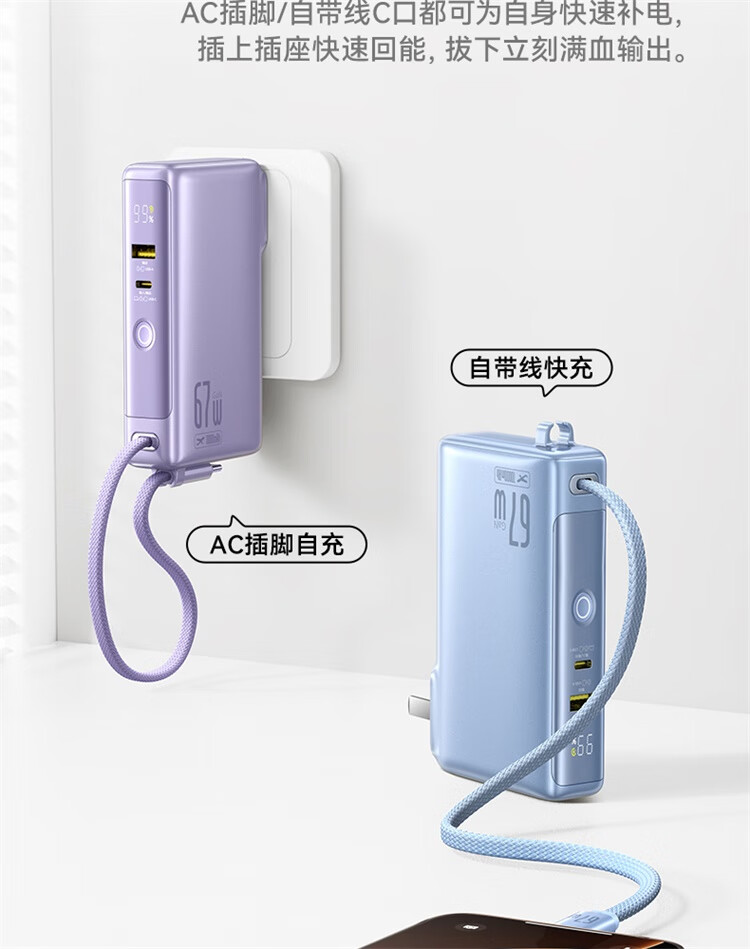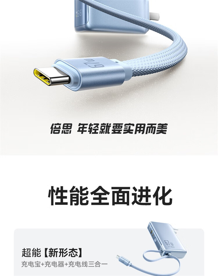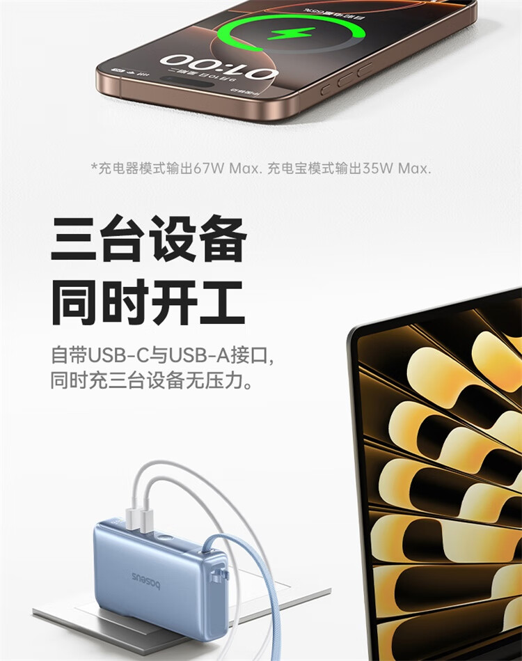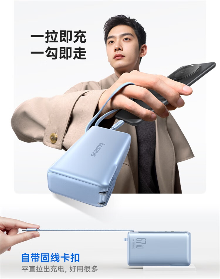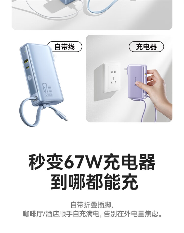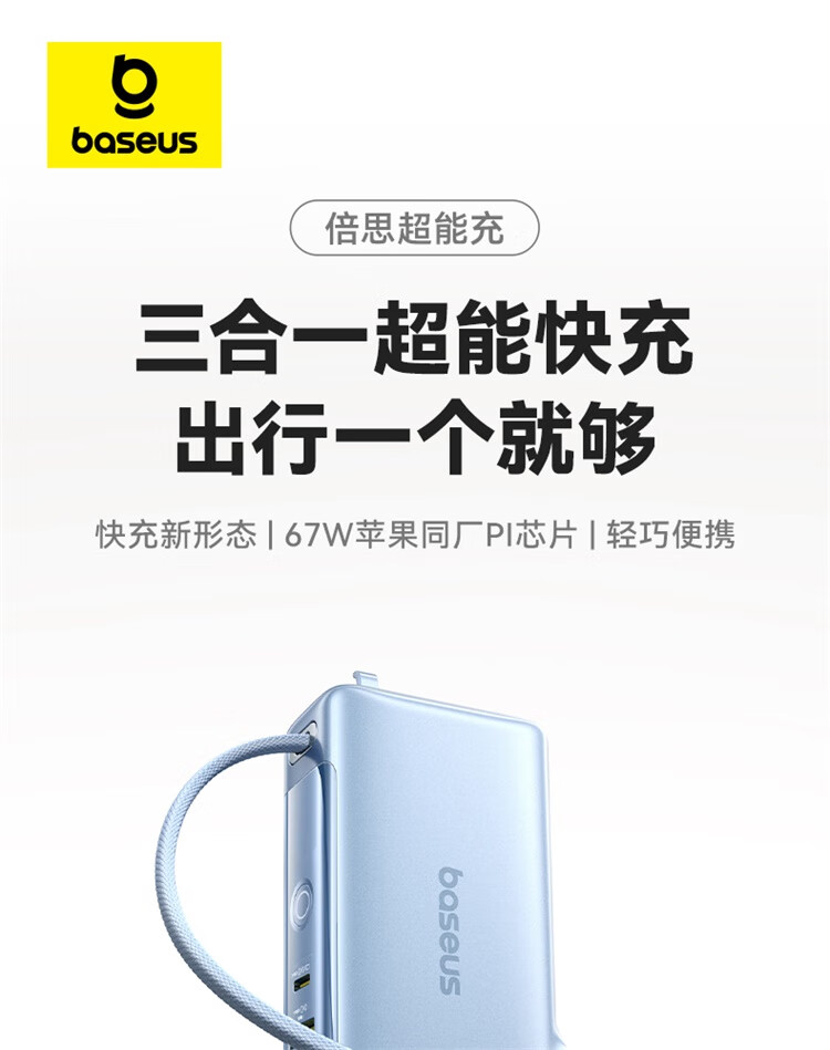 倍思【国标3C认证】超能充三合一充电宝自带插头自带线67W快充可上飞机移动电源充电器iPhone17适用-蓝