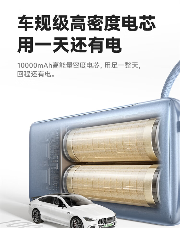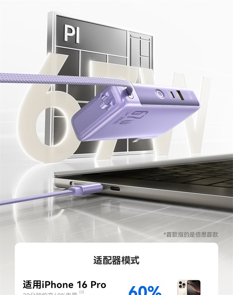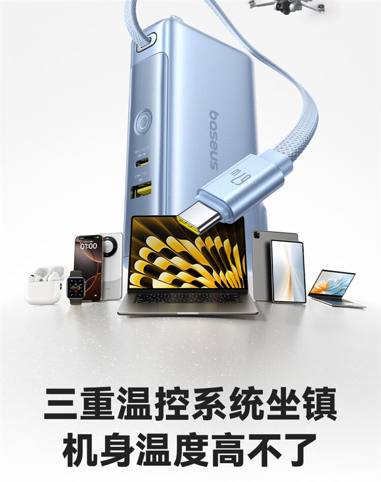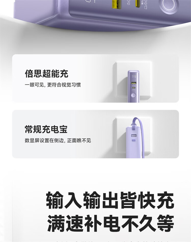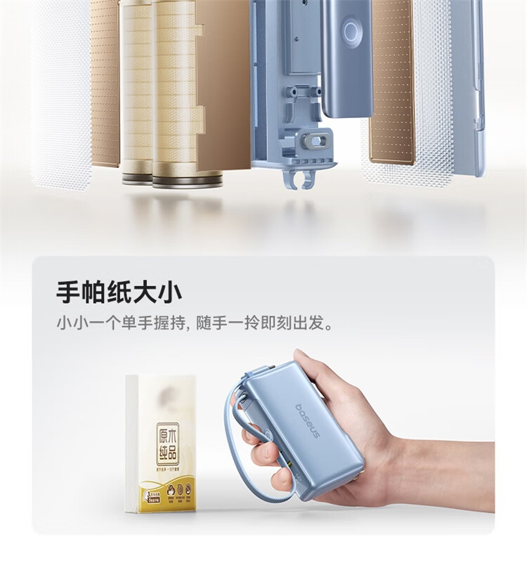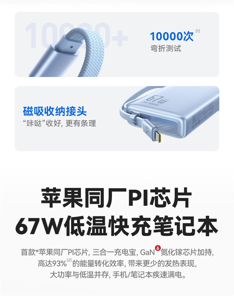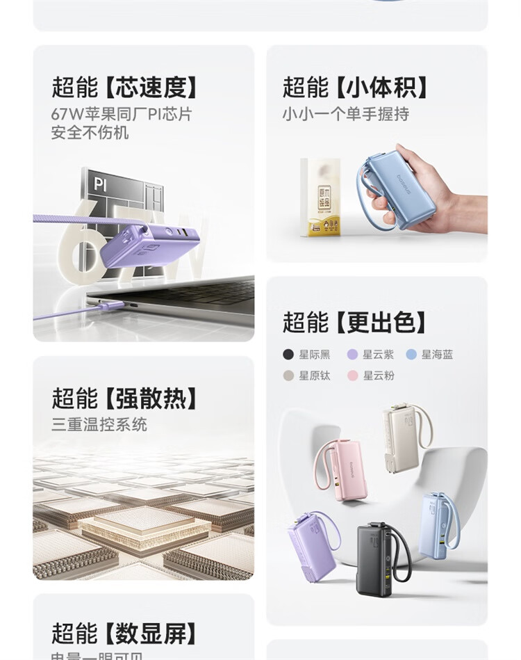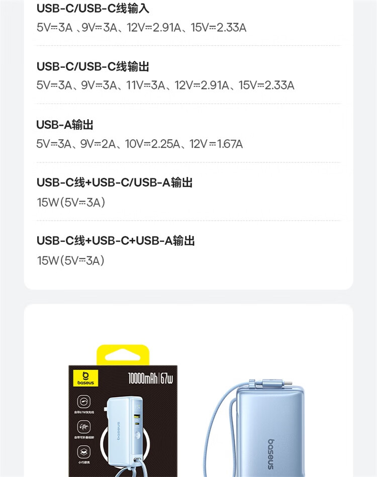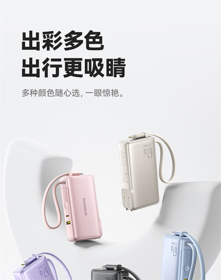 倍思【国标3C认证】超能充三合一充电宝自带插头自带线67W快充可上飞机移动电源充电器iPhone17适用-蓝
