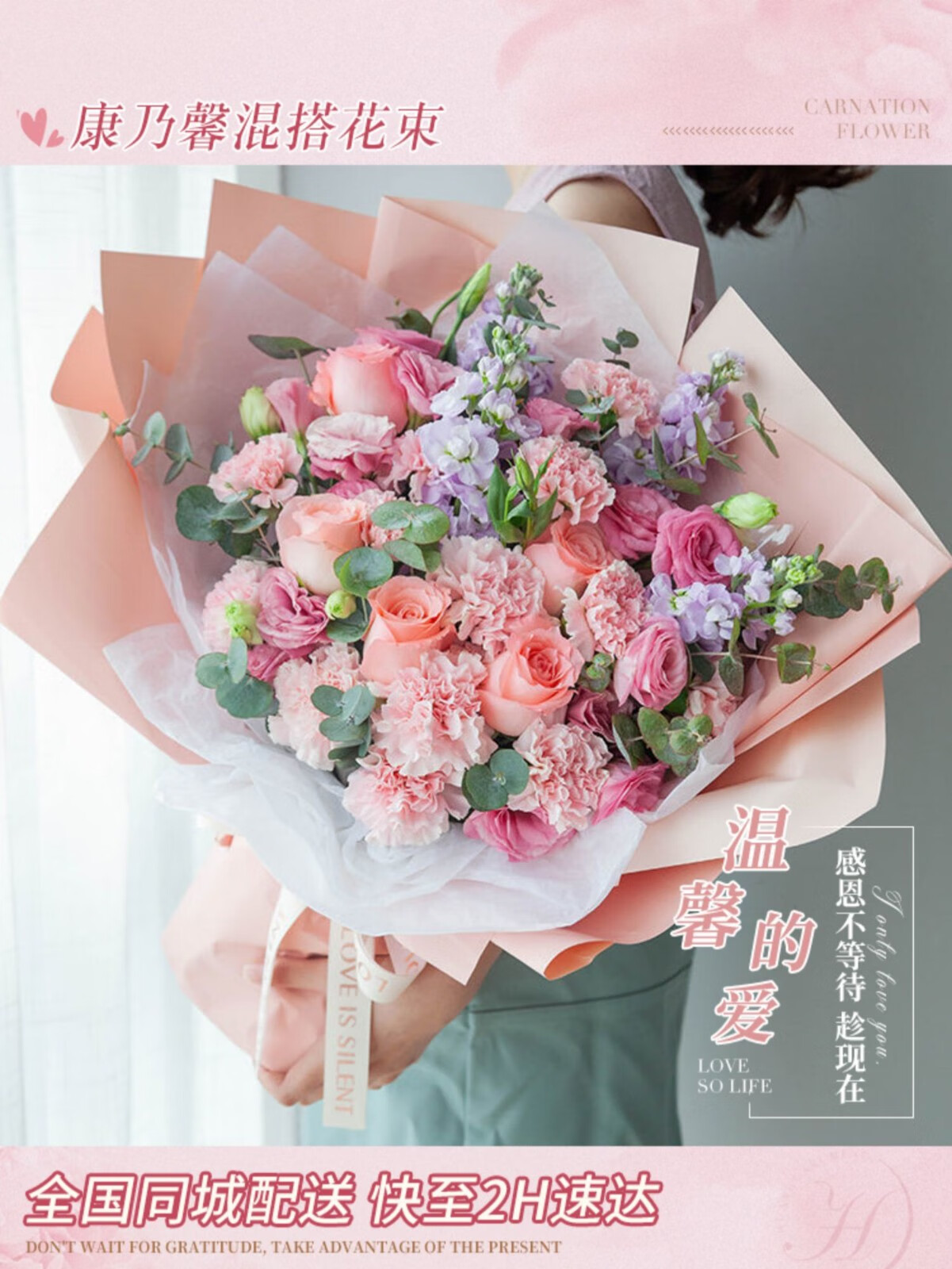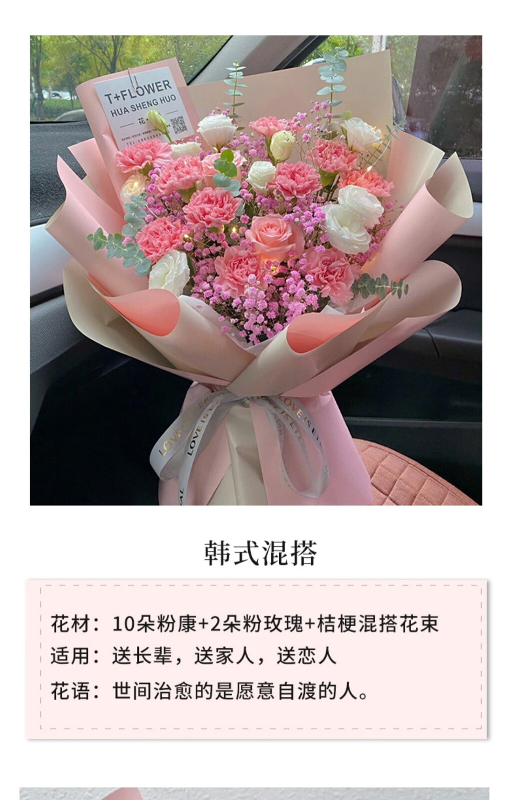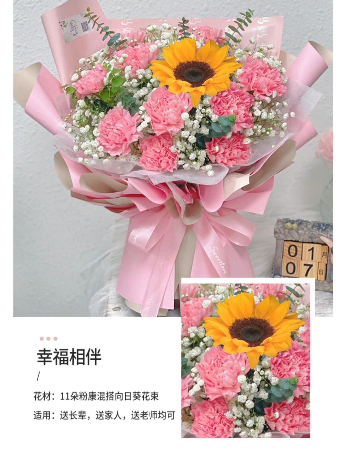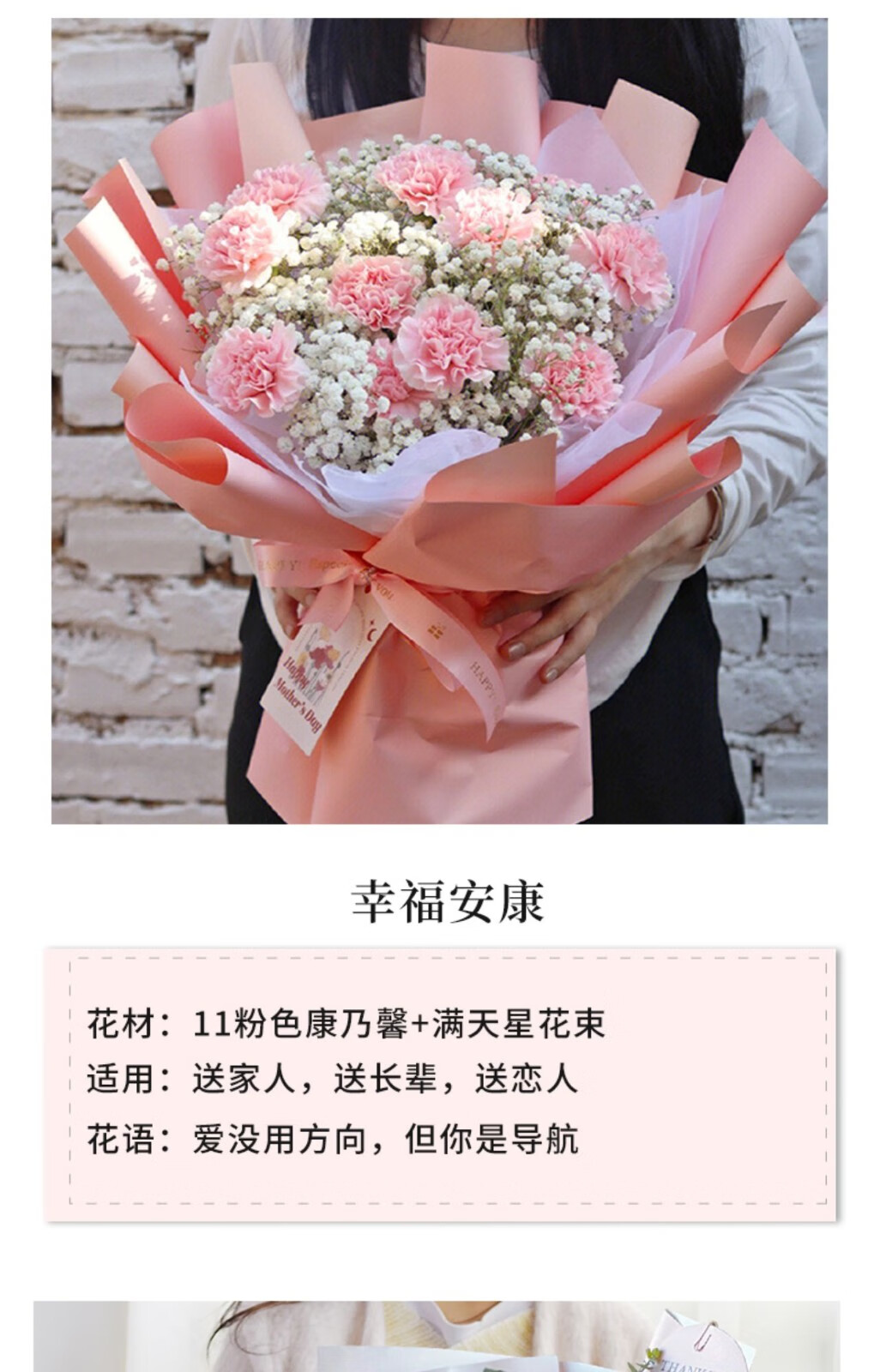 植伴康乃馨百合鲜花生日祝福探望病人母亲节鲜花速递送妈妈全国同城店 U款-11朵粉玫瑰康乃馨