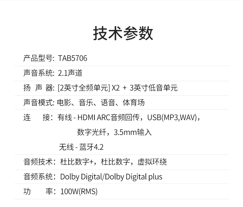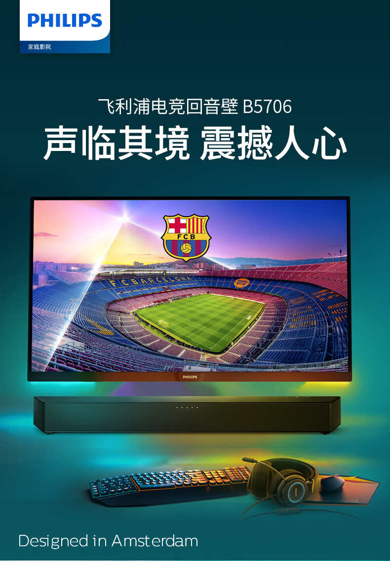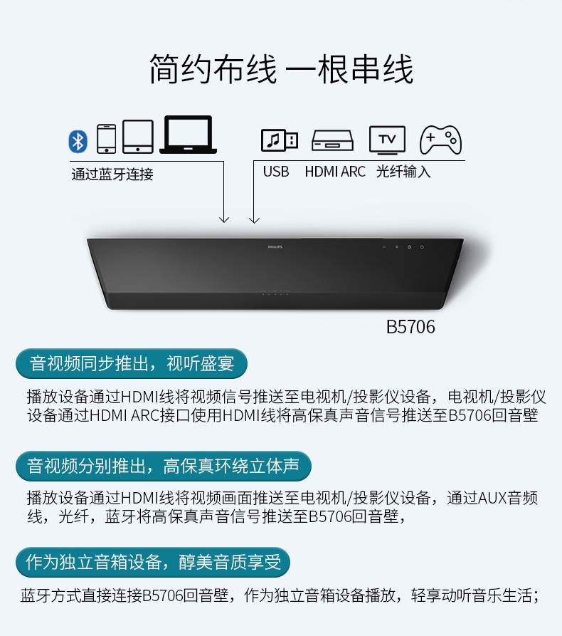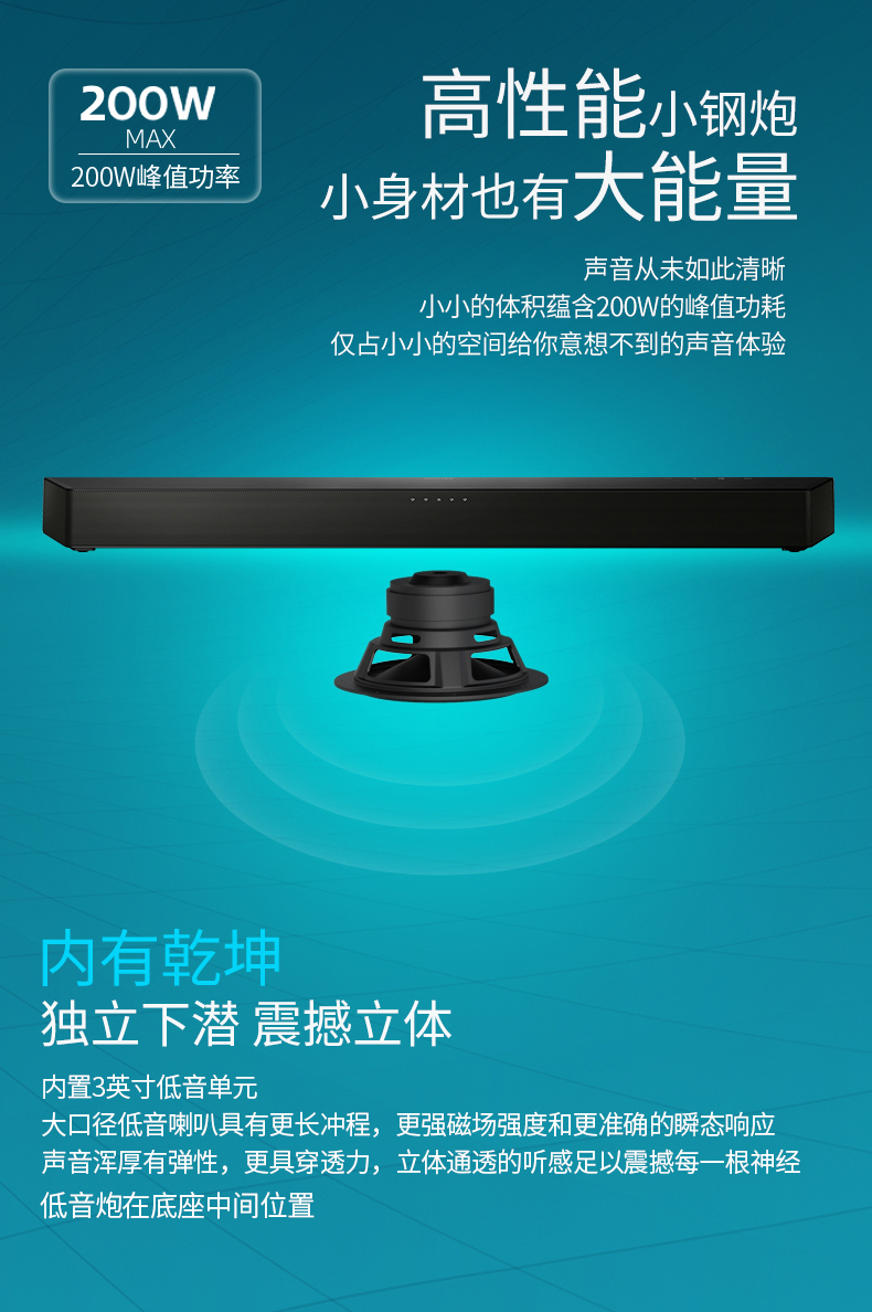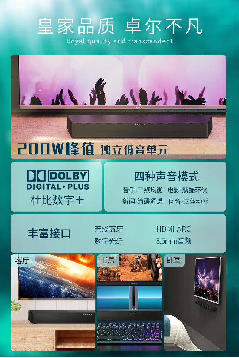 飞利浦(PHILIPS)TAB5706 回音壁 电视音响 内置低音炮 2.1声道 200W峰值功率 游戏电脑电视回音壁 杜比音效