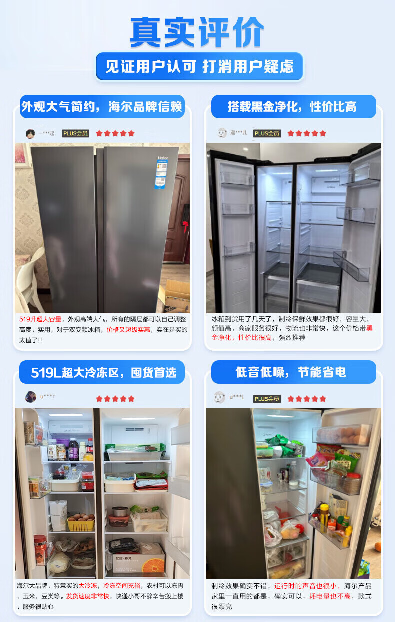 海尔(Haier)【新品】冰箱519升双开门家用囤货大容量大冷冻对开门超薄一级双变频风冷无霜净味嵌入式电冰箱 【新品】519升+265L大冷冻+黑金净化
