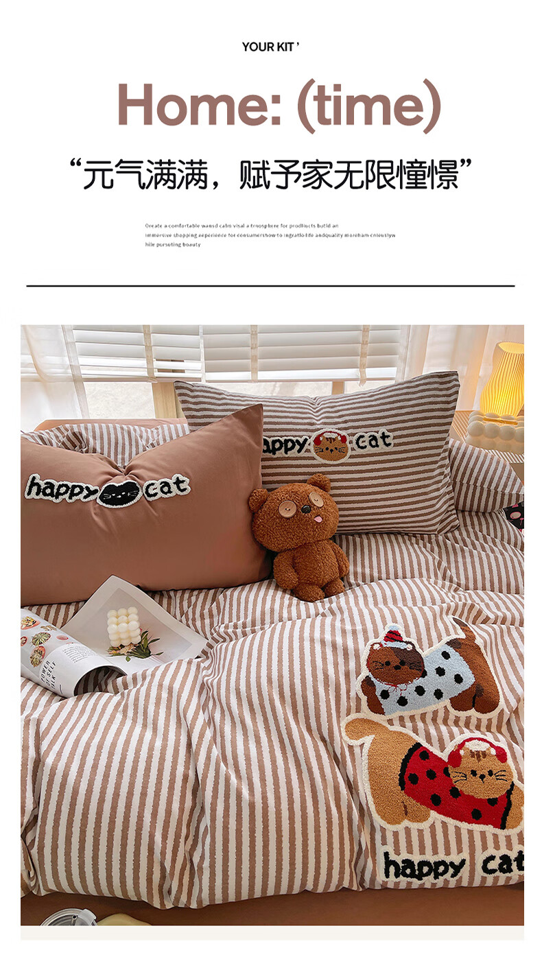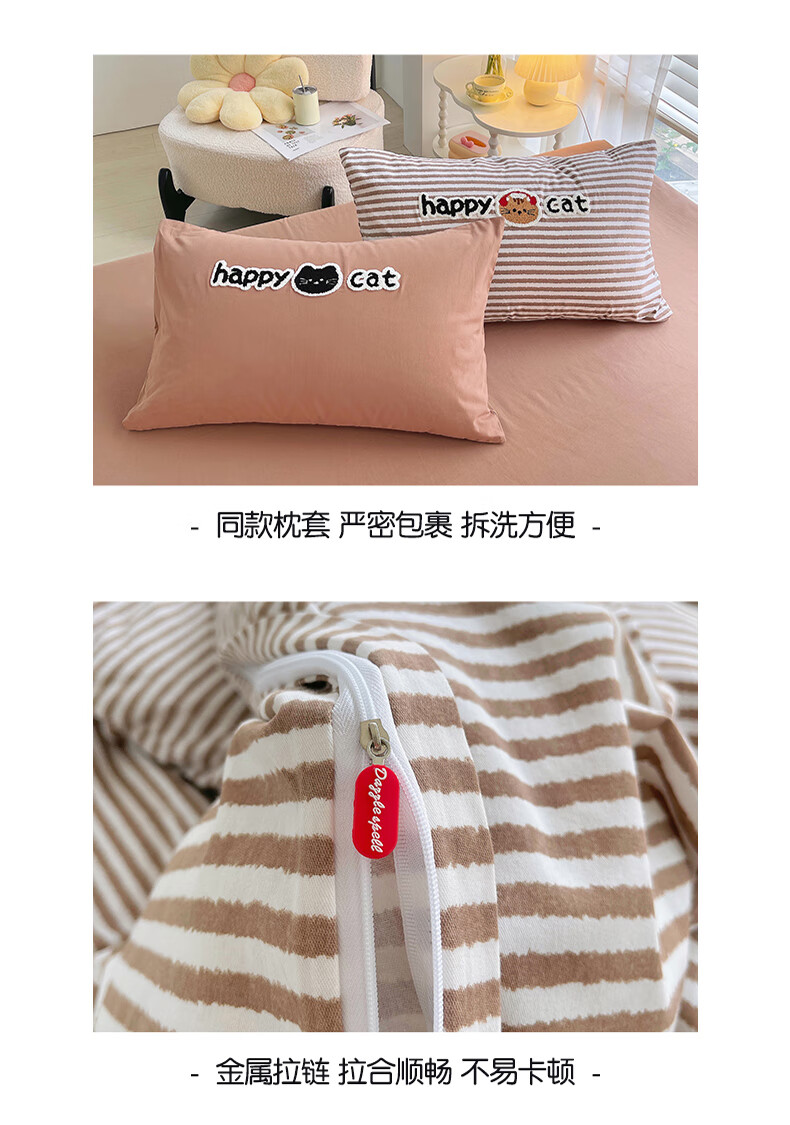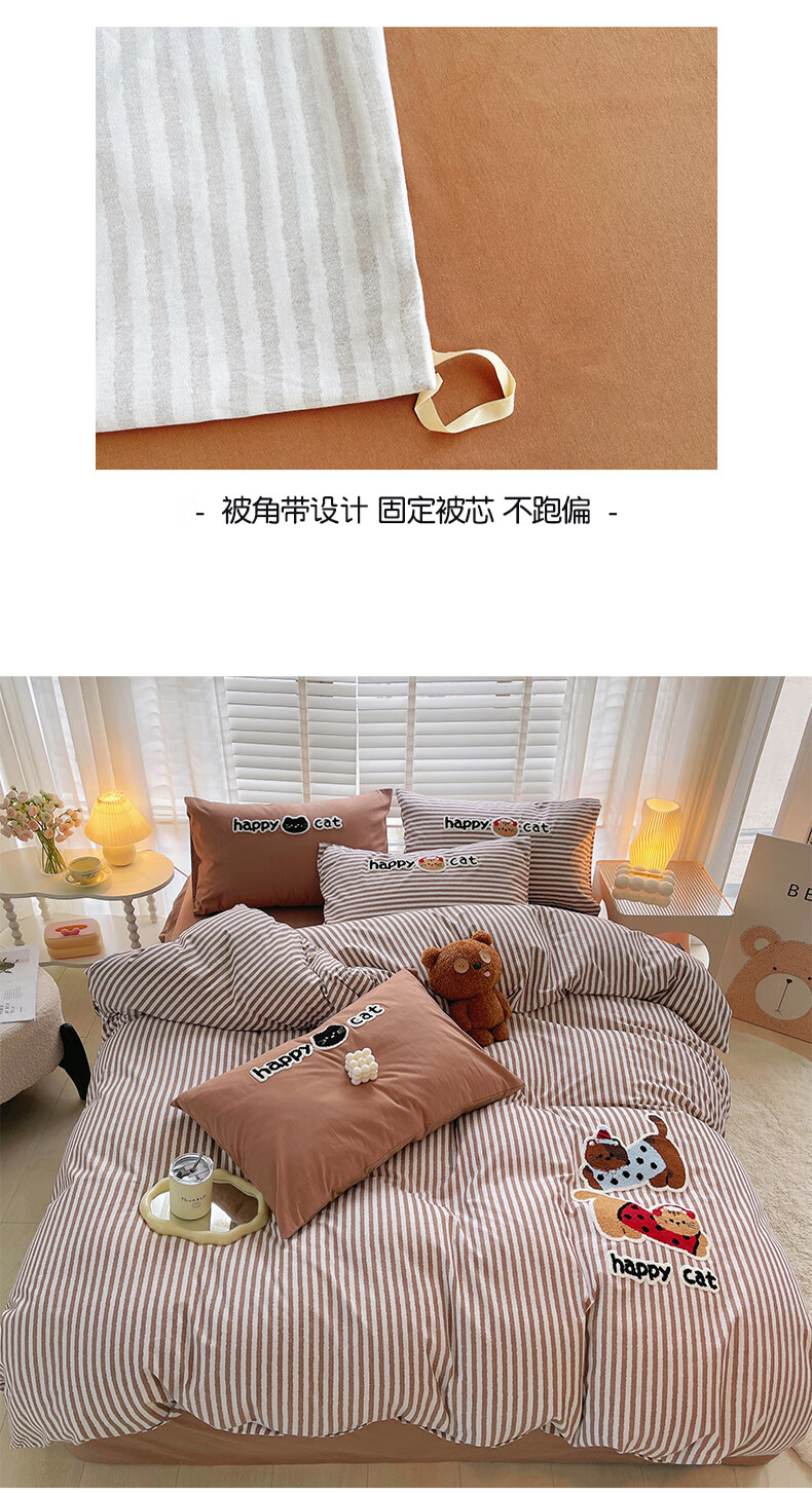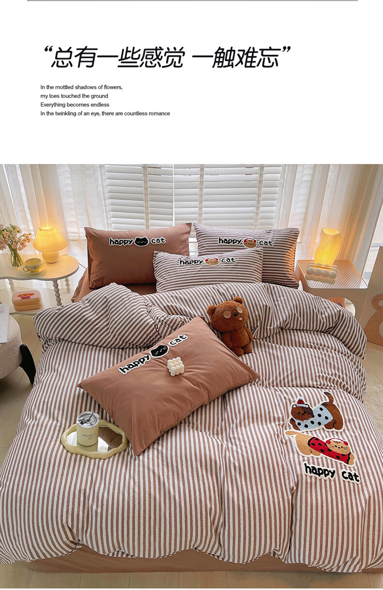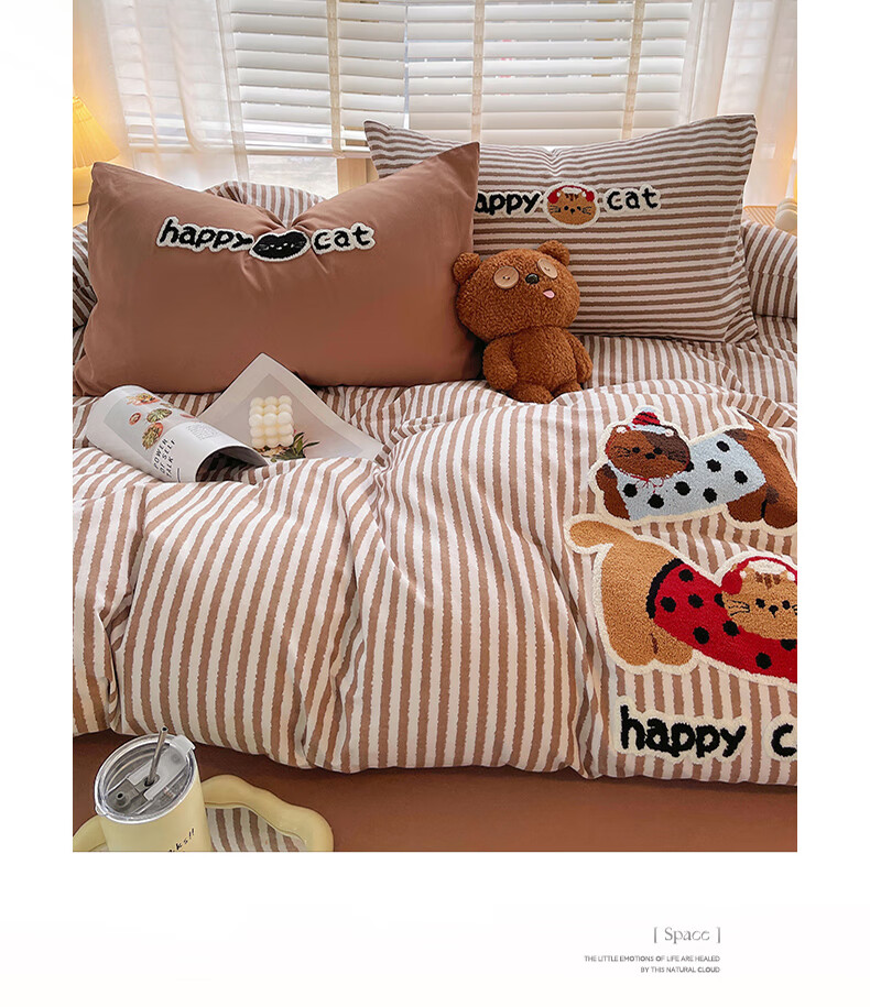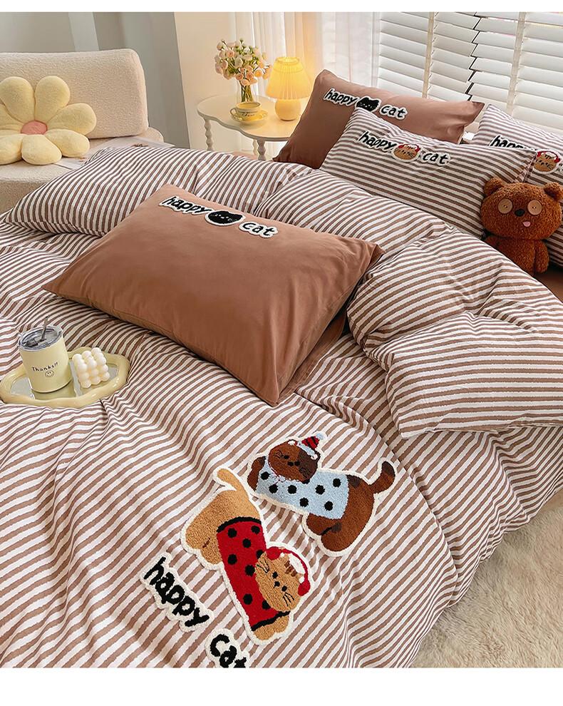 猫人(MiiOW)卡通毛巾绣全棉磨毛四件套床上用品秋冬纯棉床单被套宿舍三件套 曲奇-波点猫 【100%全棉磨毛】 1.8m 床单款 四件套-200*230cm被套