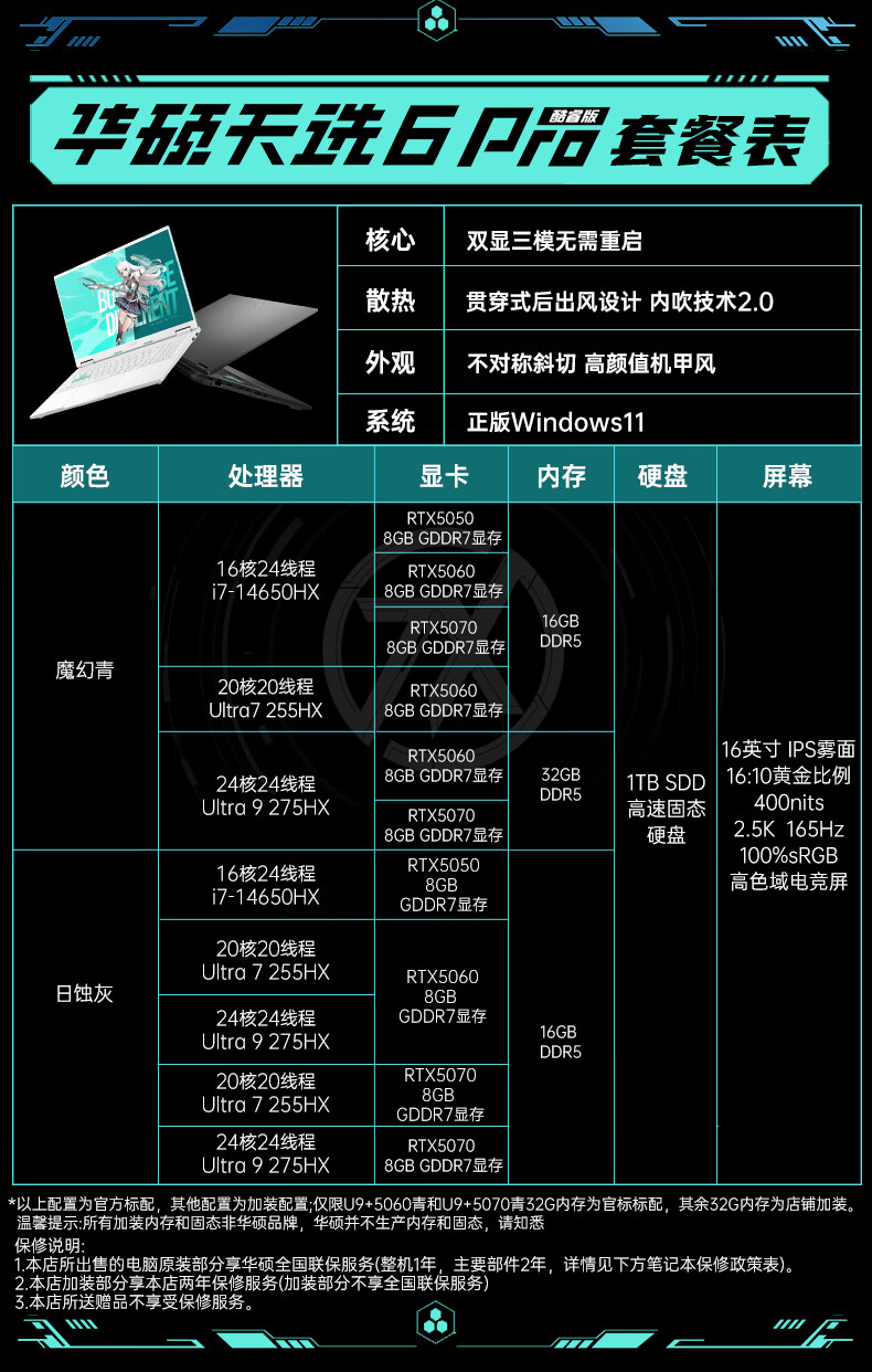 华硕(ASUS)天选6 Pro 酷睿版 国家补贴20% 酷睿HX 16英寸电竞游戏本 笔记本电脑 酷睿i7-14650HX/RTX5060/魔幻青 16G内存/1T高速固态硬盘 2.5K 16:10高刷高亮高色域电竞屏