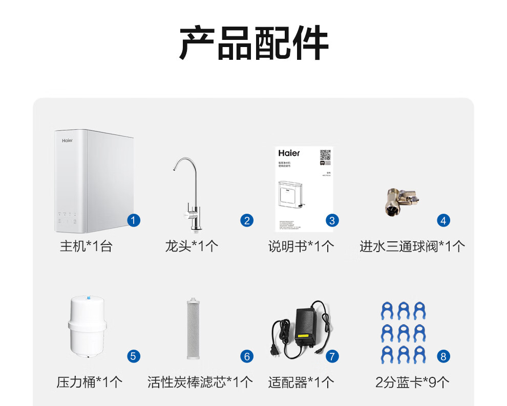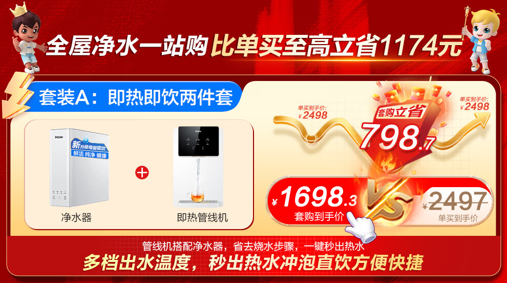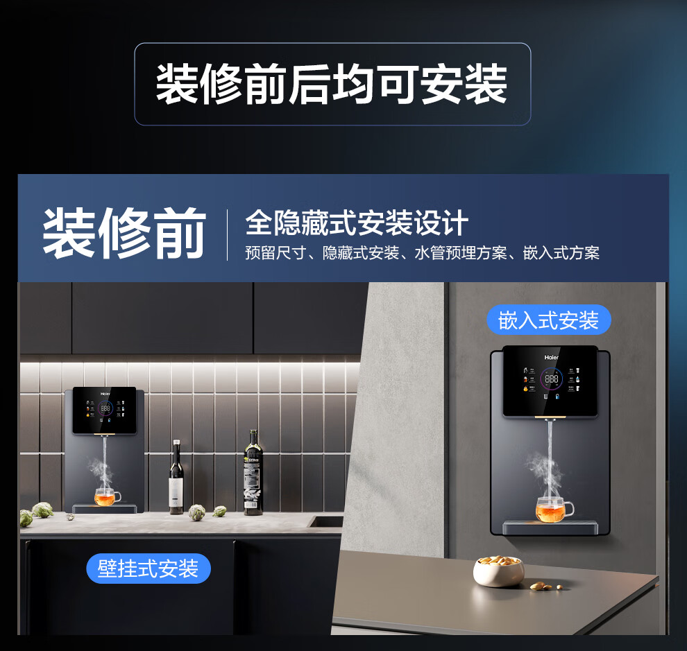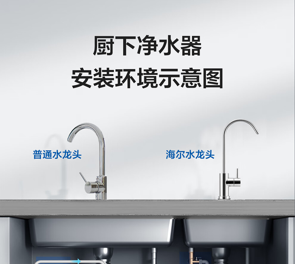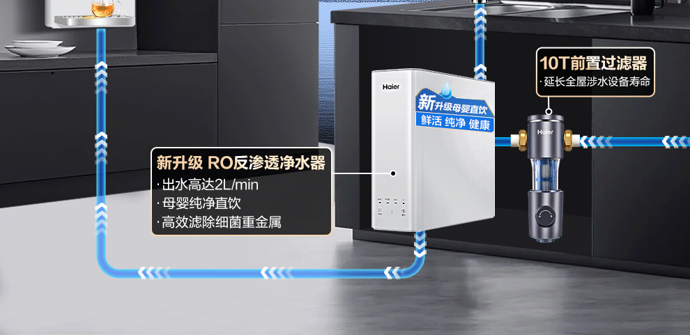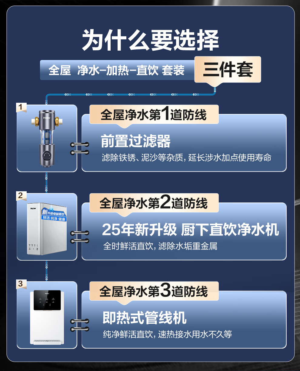 海尔(Haier)净水器家用厨下母婴RO反渗透直饮净水机加热一体机餐边柜壁挂式管线机接自来水全屋前置过滤器套装 【性能套装】即热管线机+净水器
