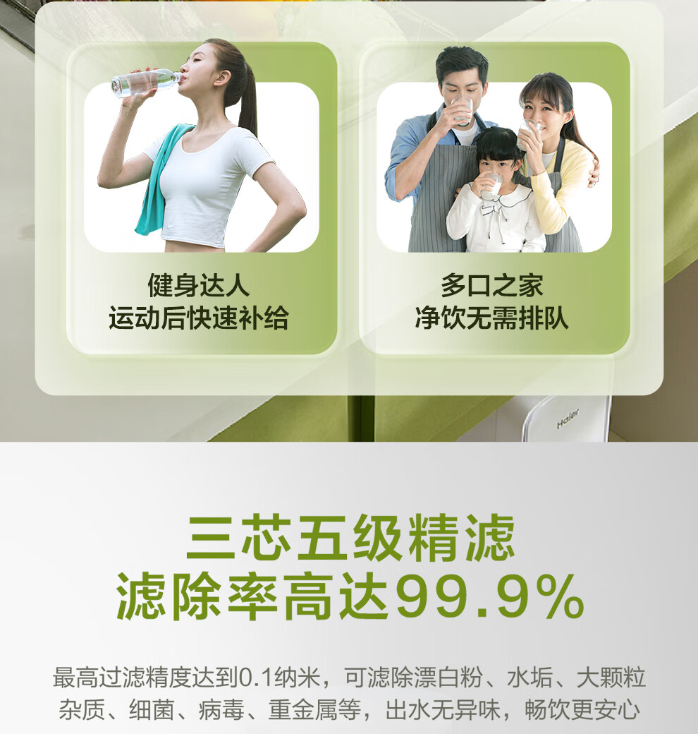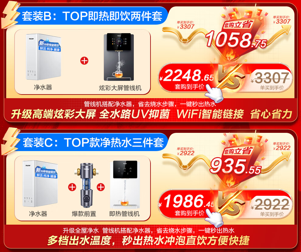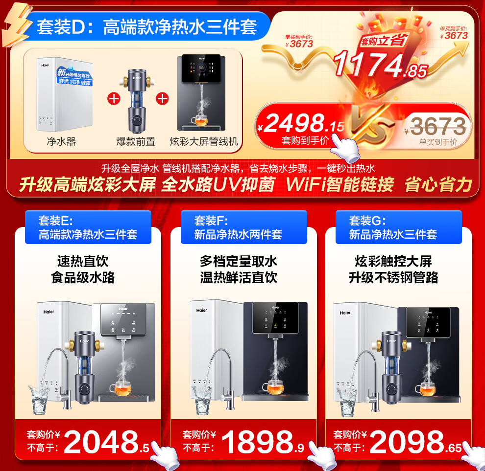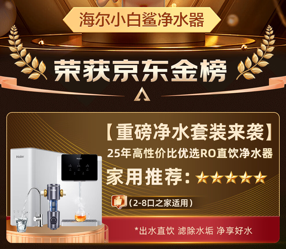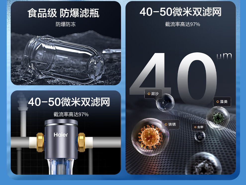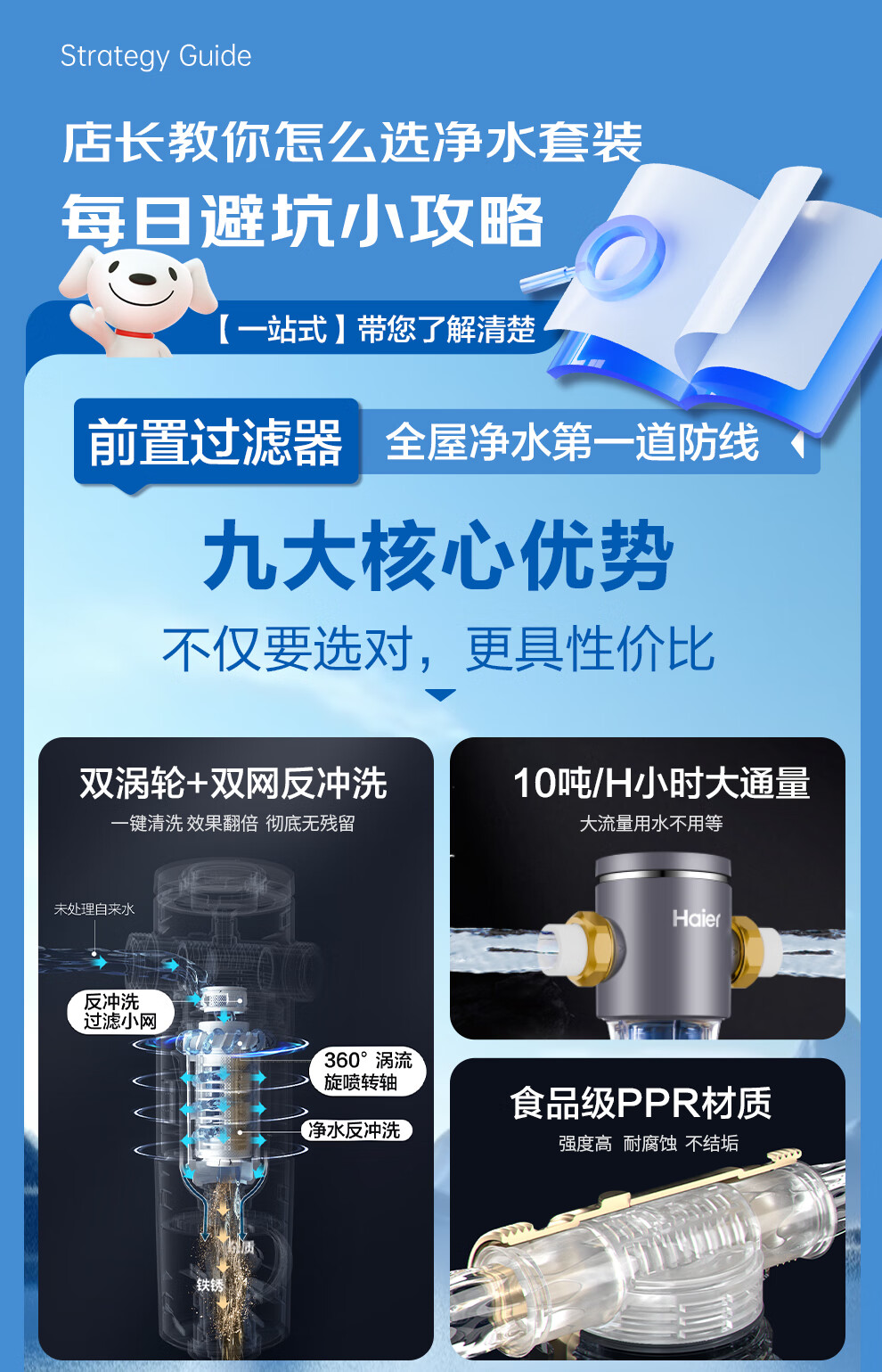 海尔(Haier)净水器家用厨下母婴RO反渗透直饮净水机加热一体机餐边柜壁挂式管线机接自来水全屋前置过滤器套装 【性能套装】即热管线机+净水器