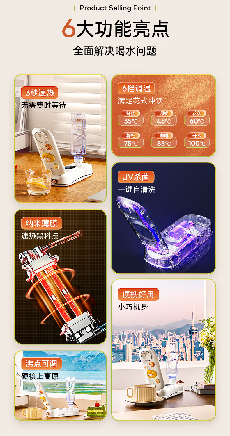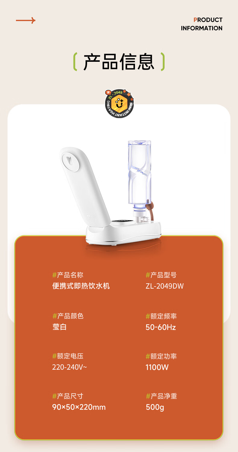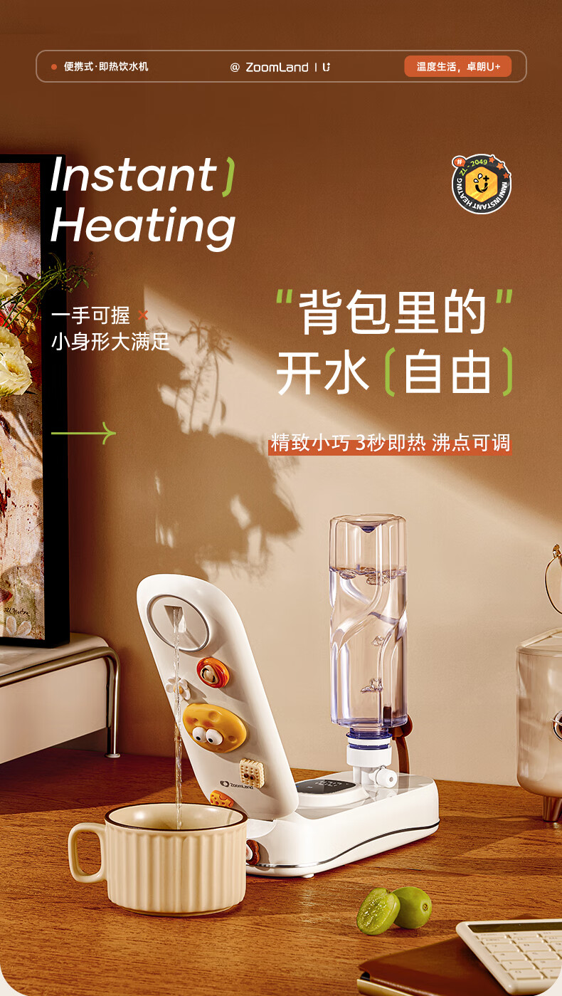 卓朗便携式即热饮水机便携式热水壶 家用泡奶饮水机小型米白色旅行便携烧水壶ZL-2049DW