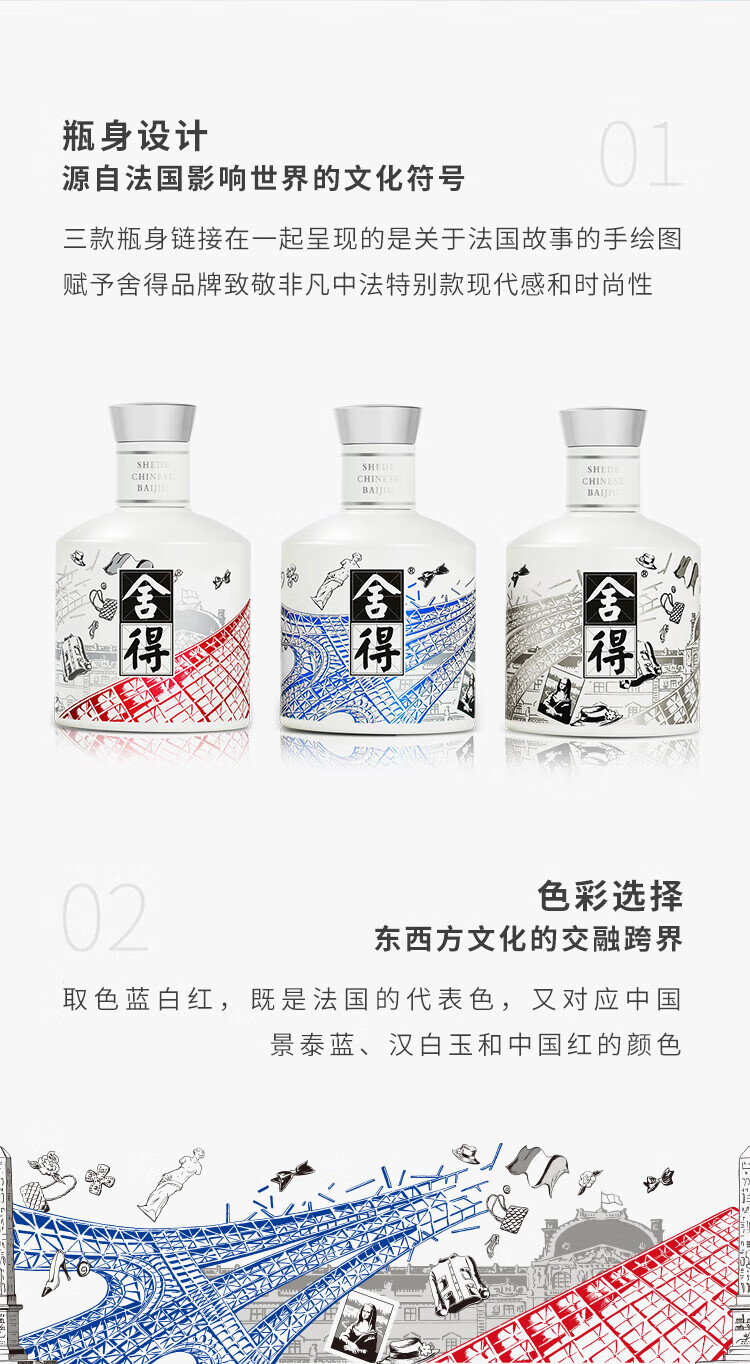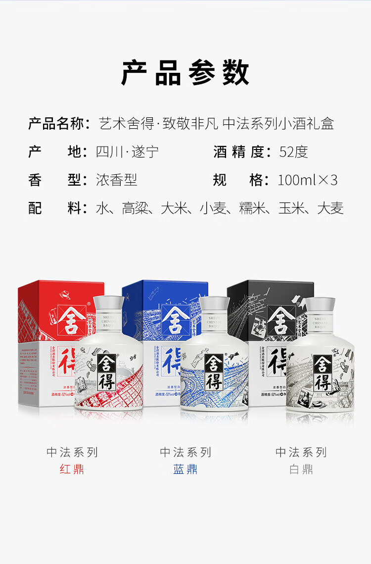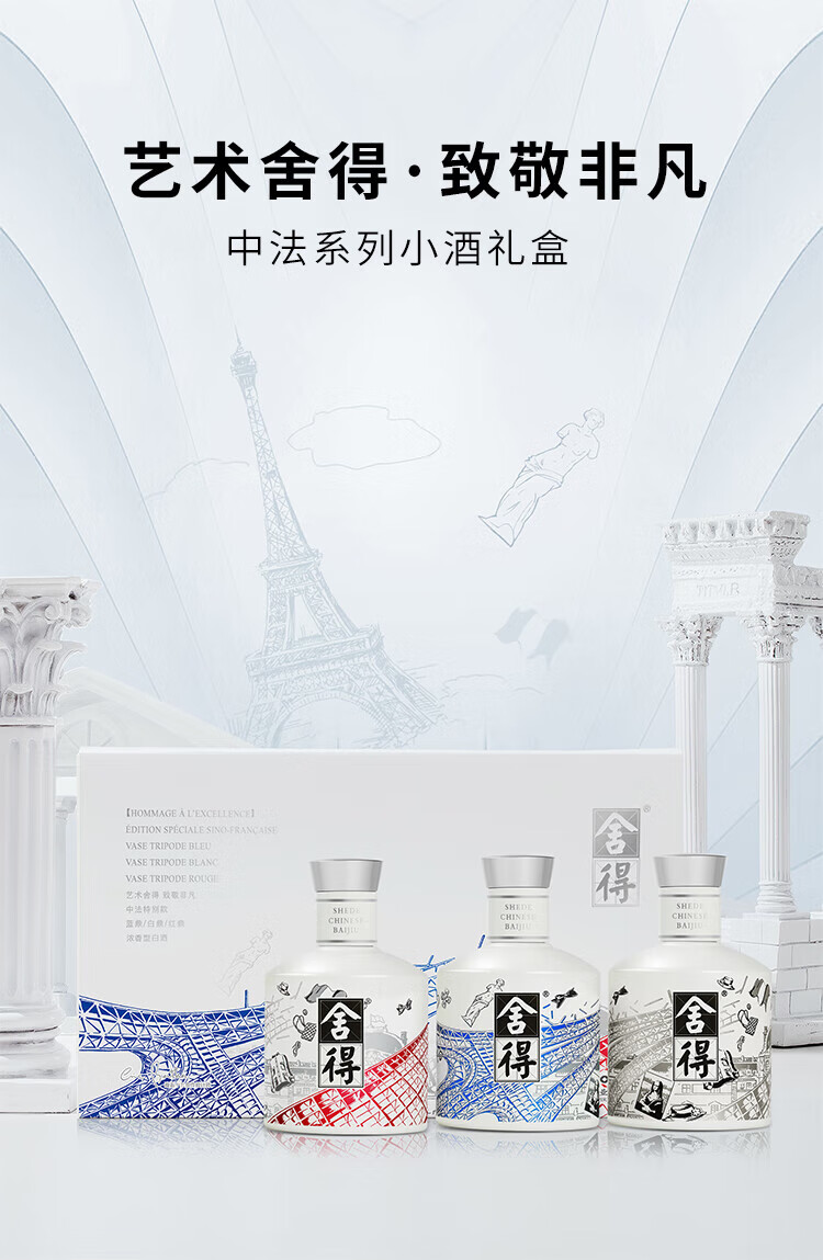 舍得沱牌艺术舍得中法系列小酒礼盒 浓香型白酒 52度 100mL 3瓶 礼盒装