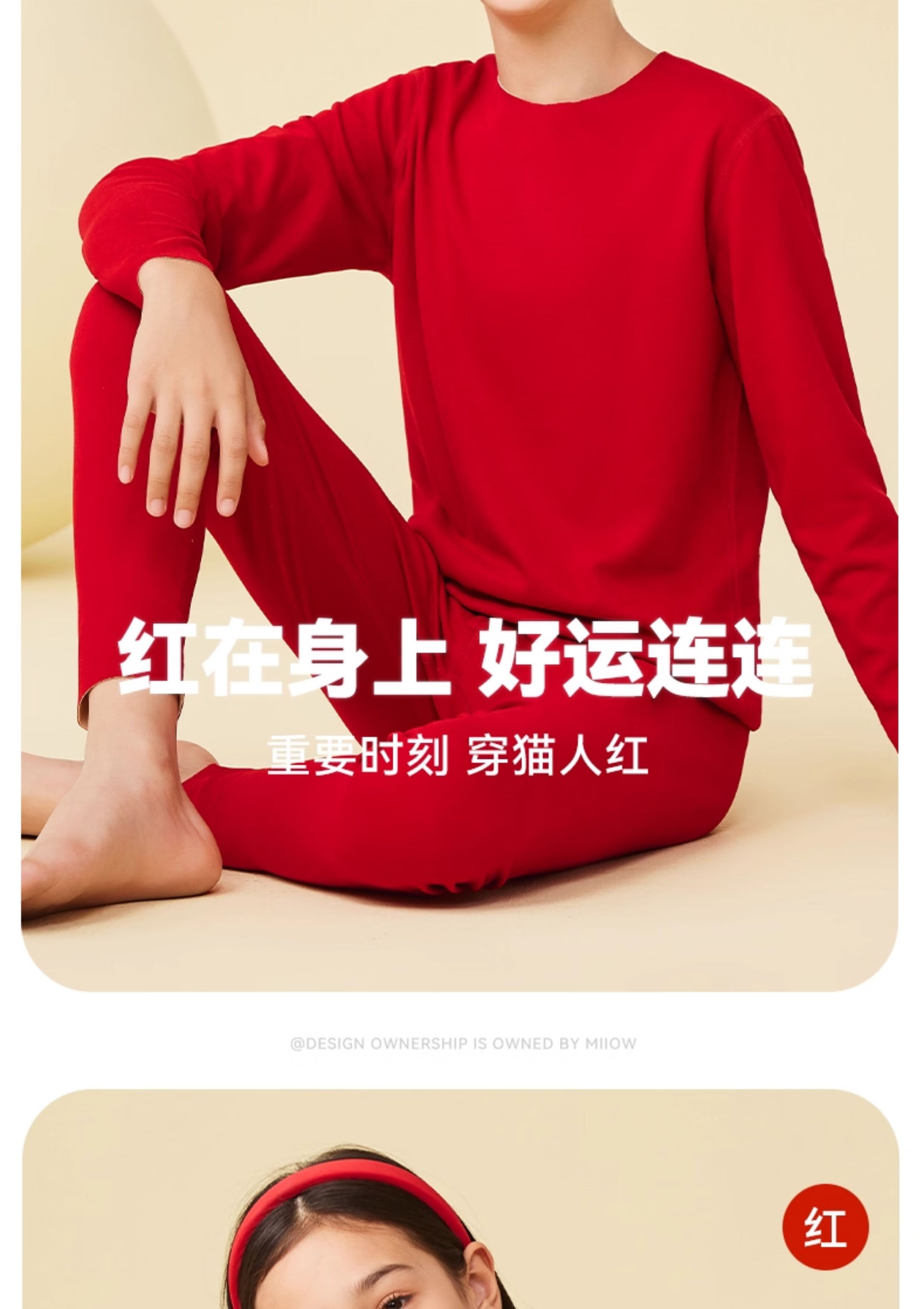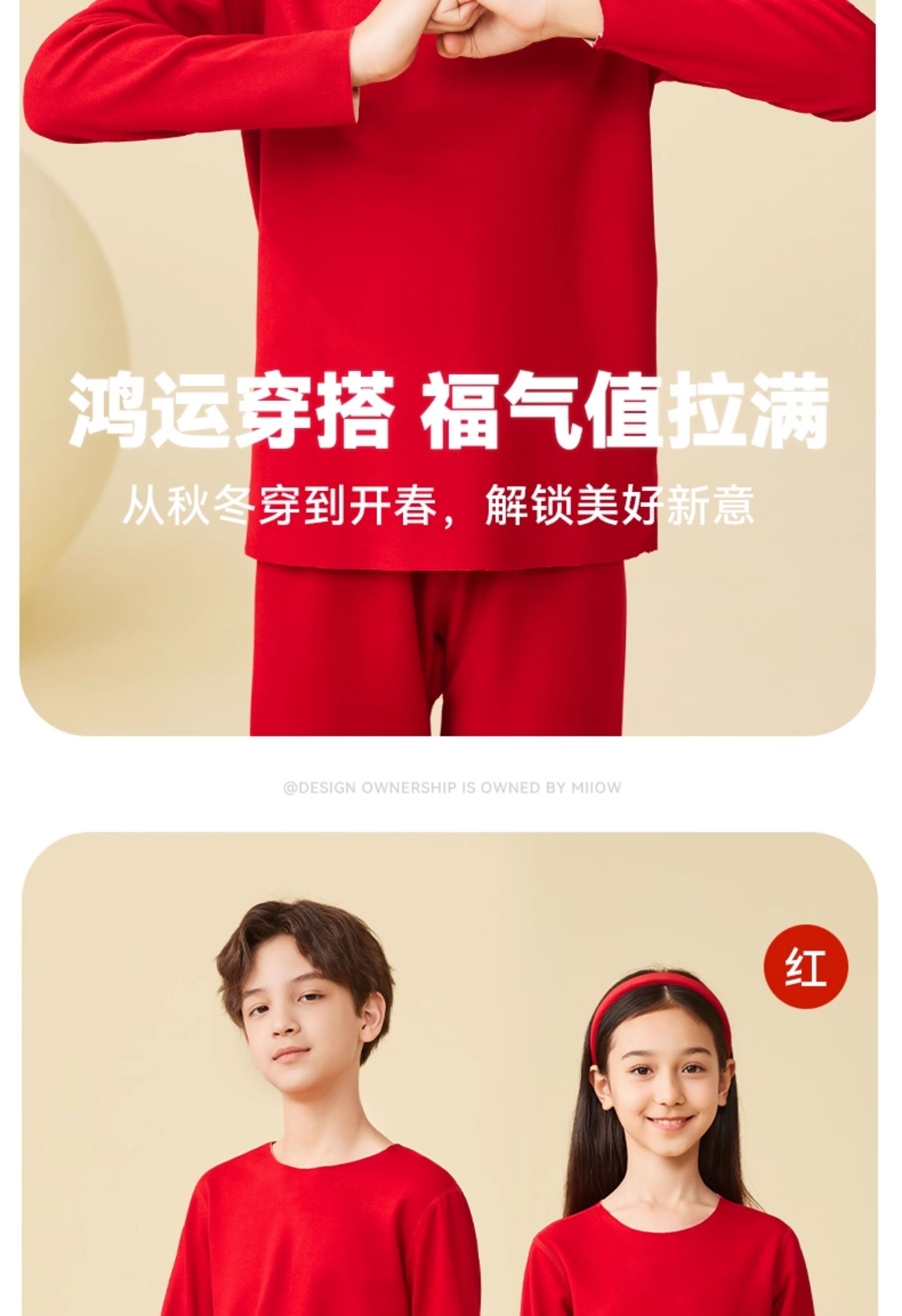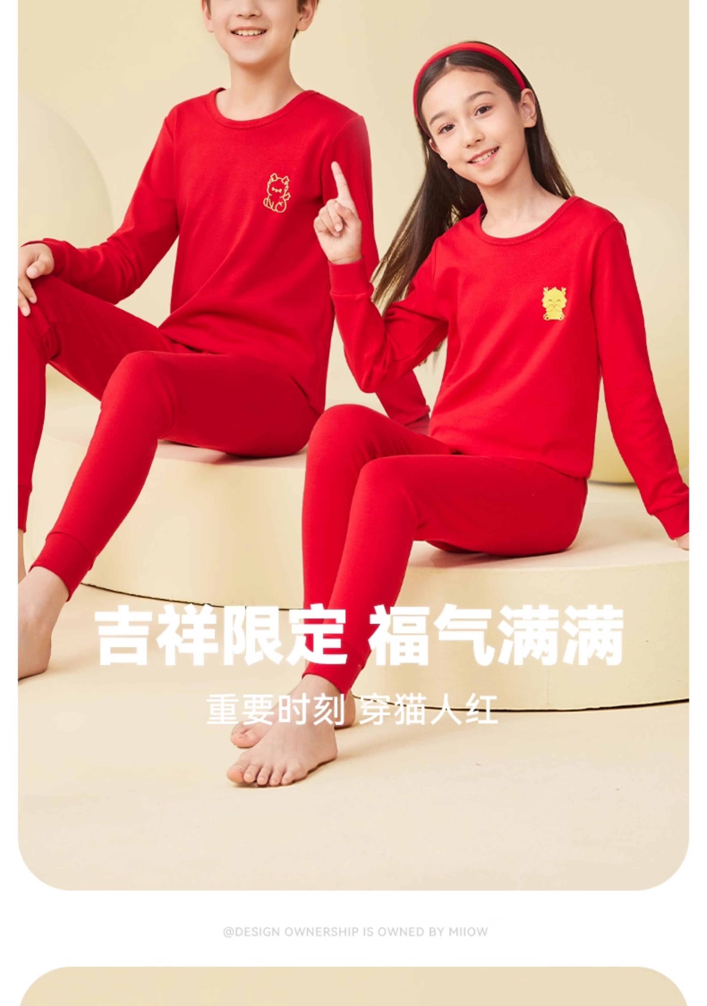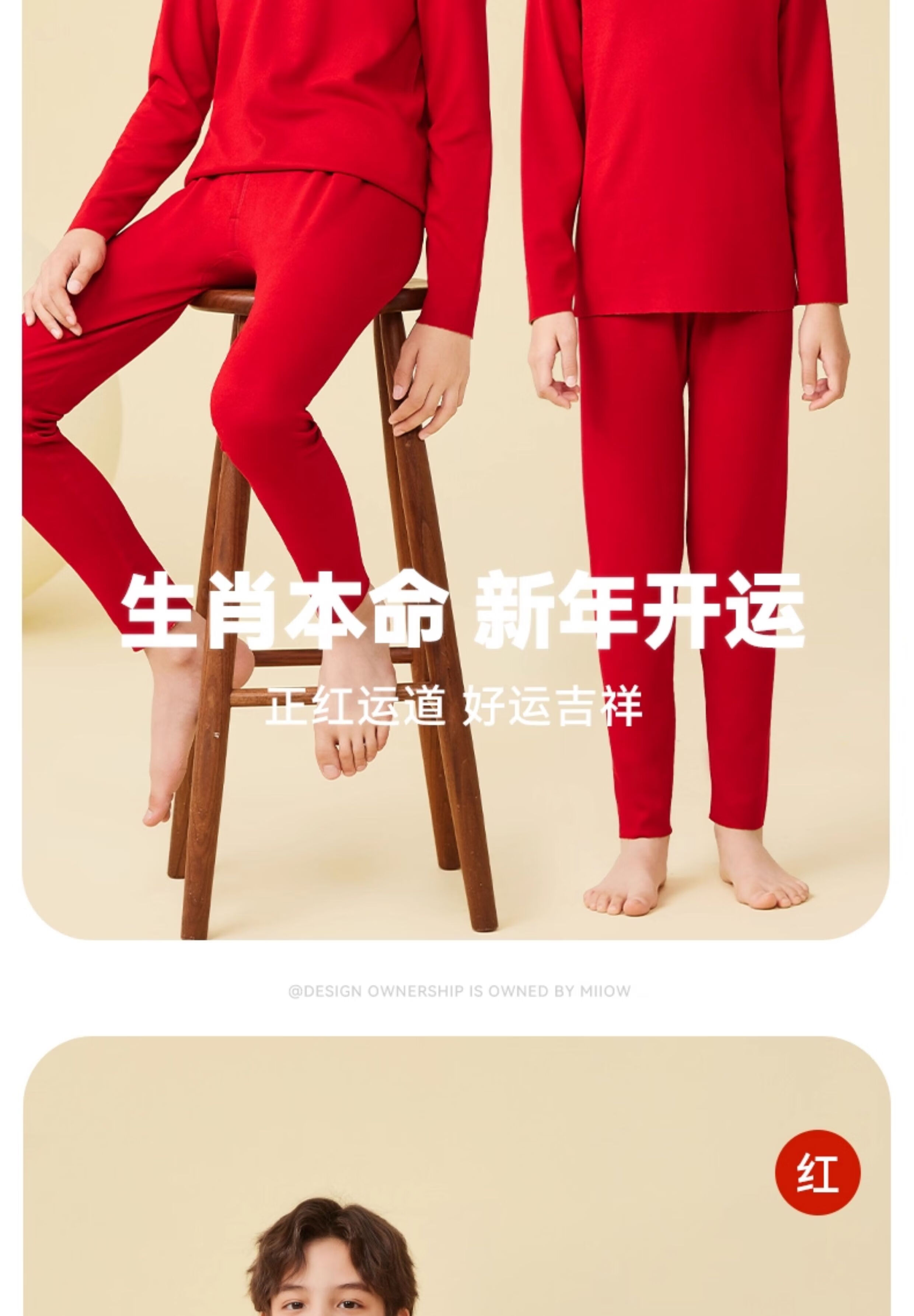 猫人(MiiOW)儿童本命年内衣套装纯棉12岁男童女童大童红色属龙年秋衣秋裤 男童圆领-马年限定 160 建议体重69-99斤