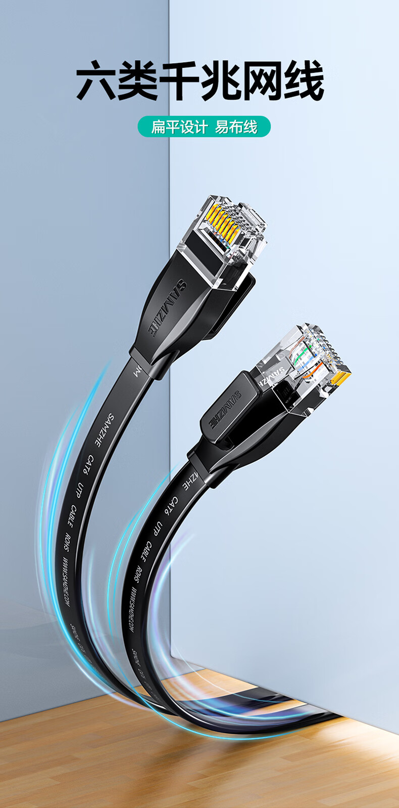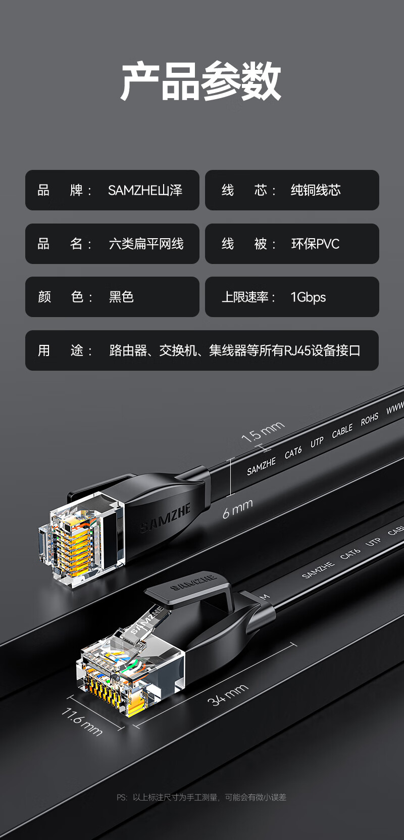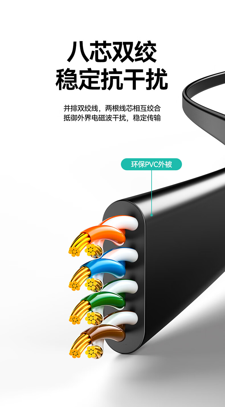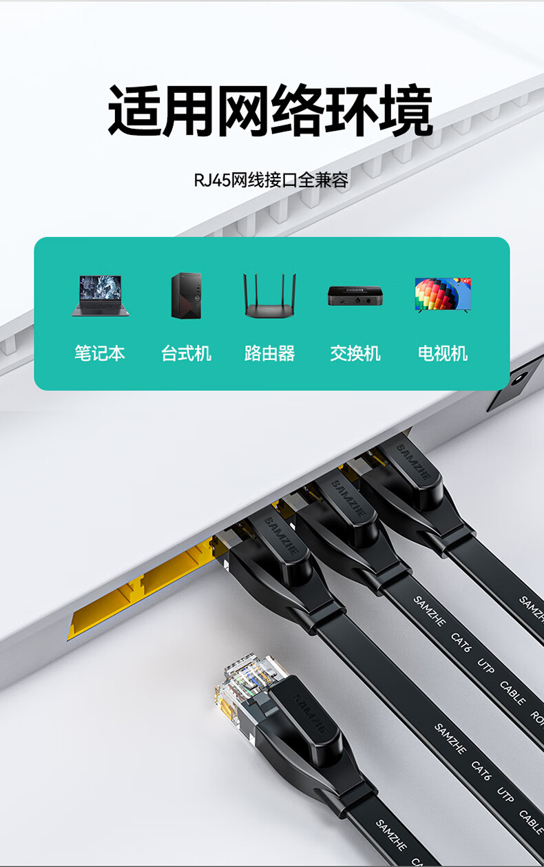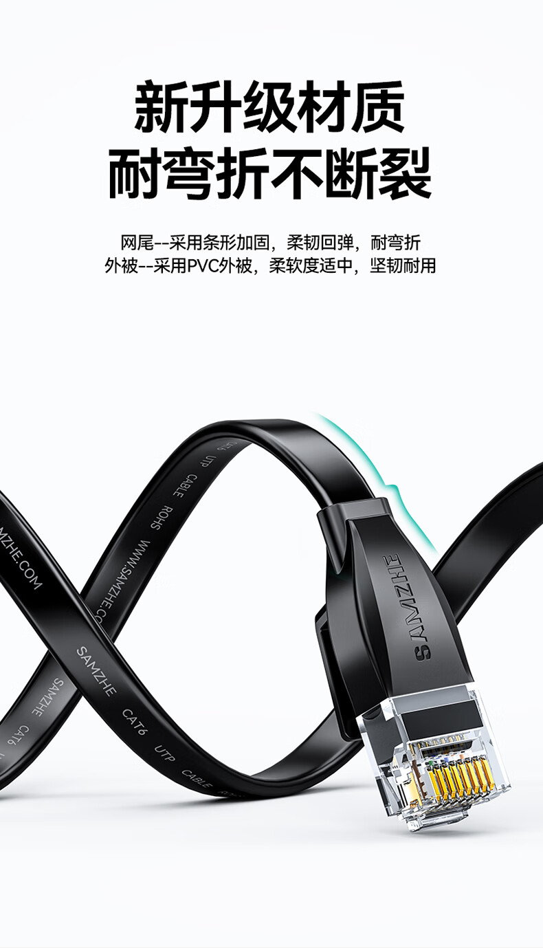 山泽 六类网线 CAT6类千兆纯铜扁平网线 电脑宽带家用监控网络连接成品跳线 黑色2米HBP602