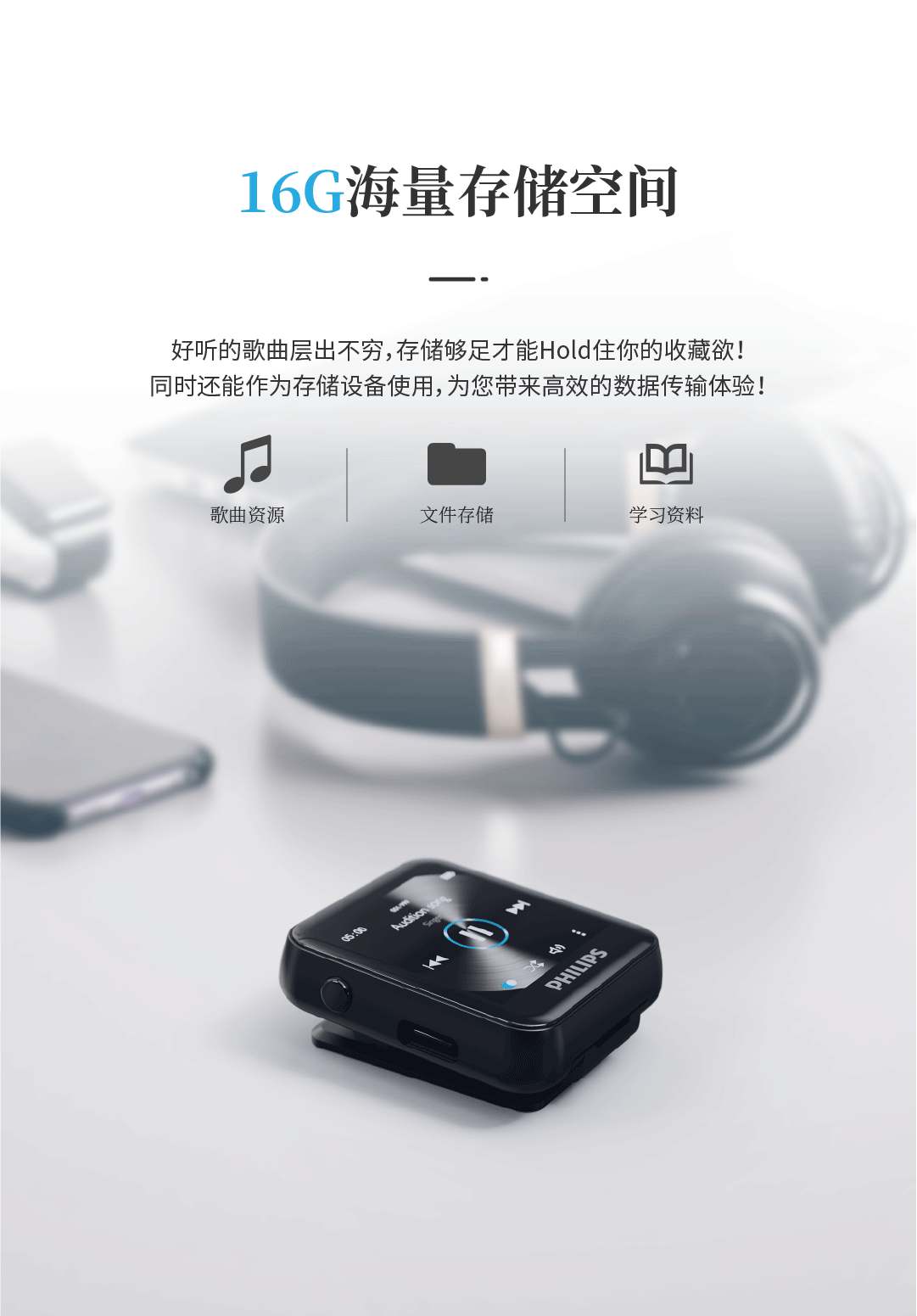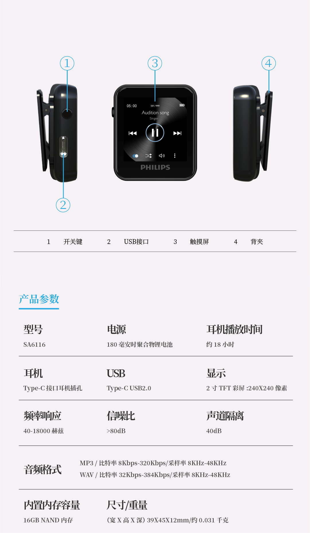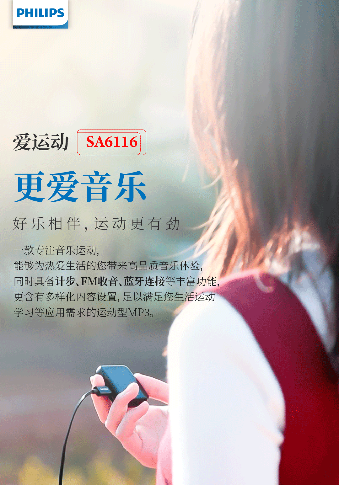 飞利浦SA6116 HIFI无损音乐MP3播放器 触摸屏蓝牙5.0 FM收音学生运动跑步可定时 16G