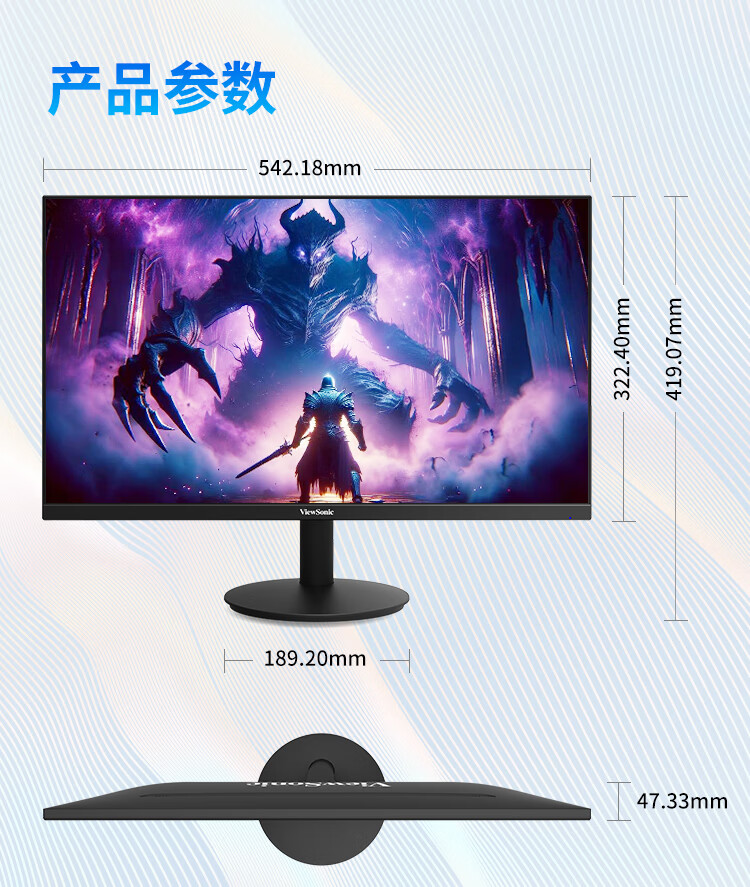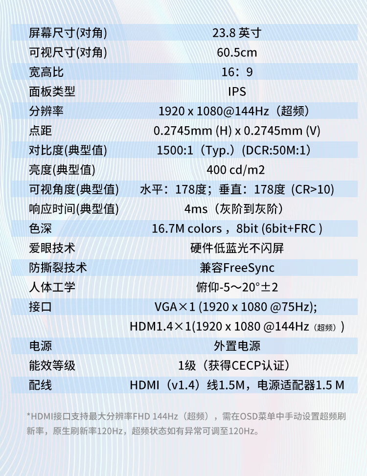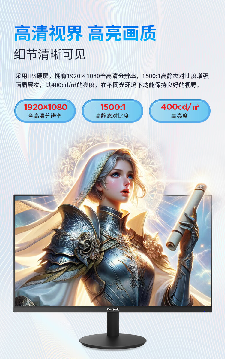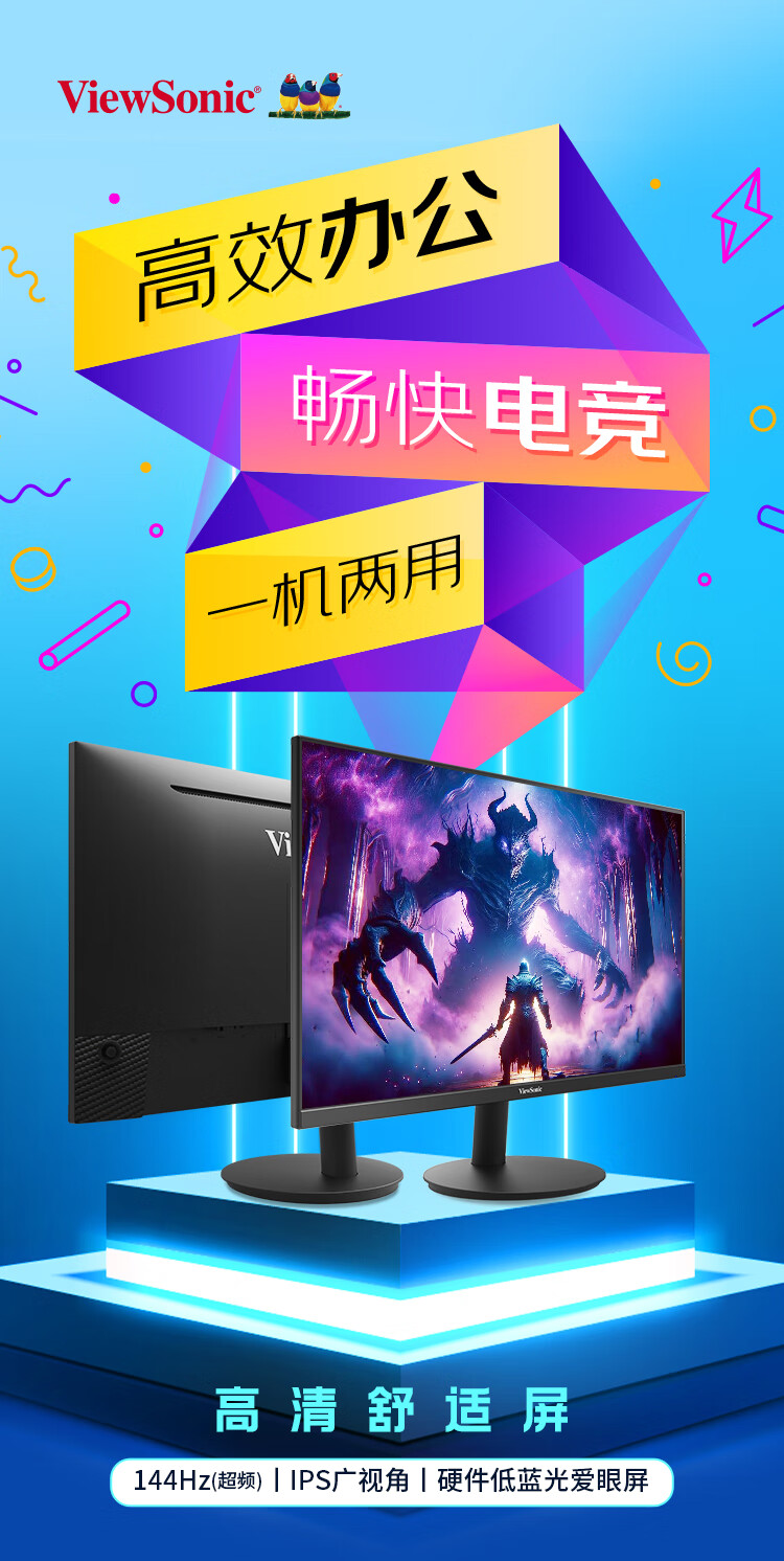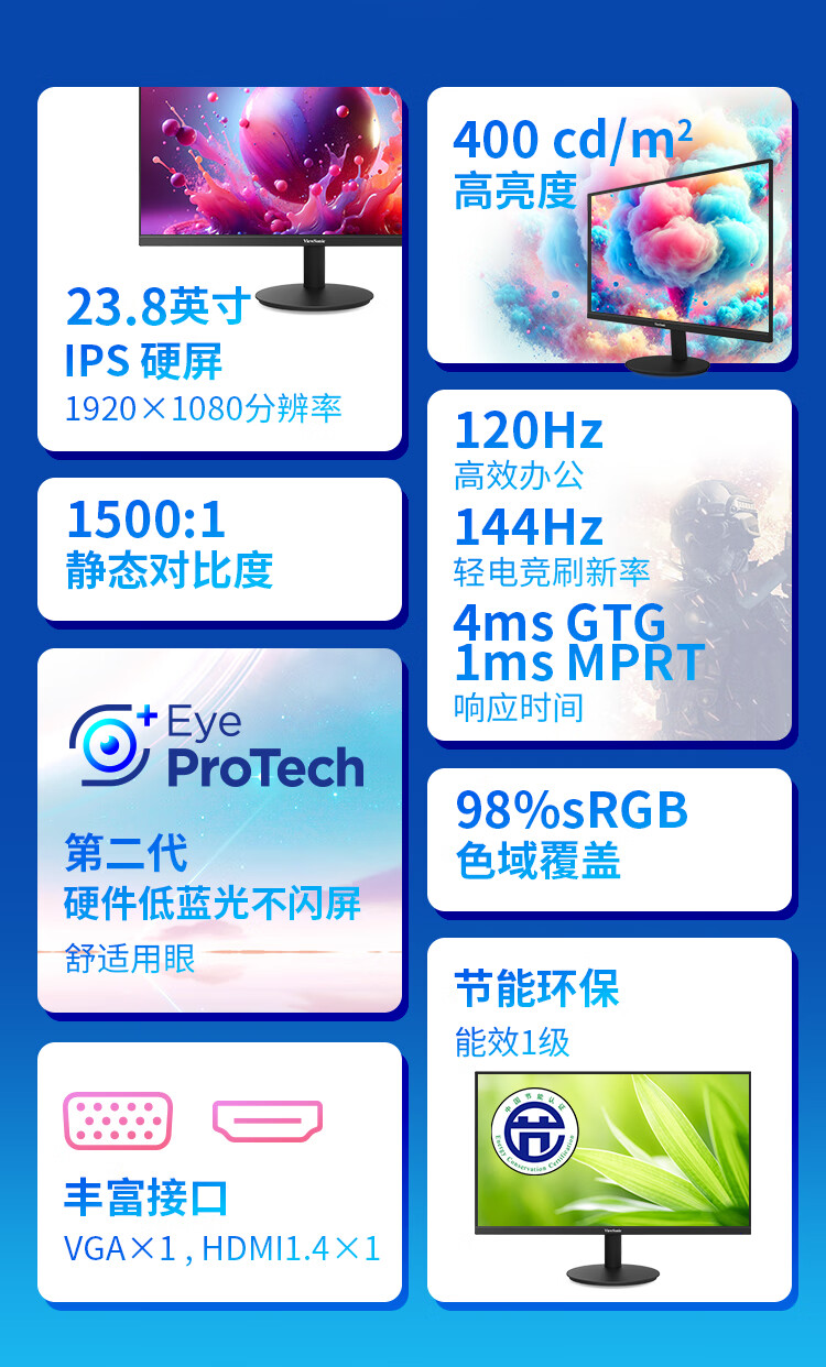 优派23.8英寸 原生120Hz超频144Hz IPS 400nit高亮 硬件低蓝光 1级能效 电脑办公电竞显示器VA24G25