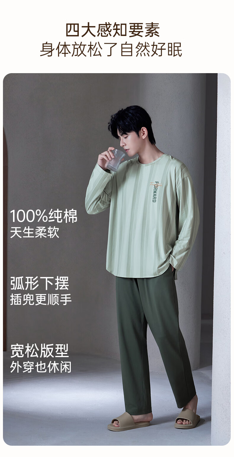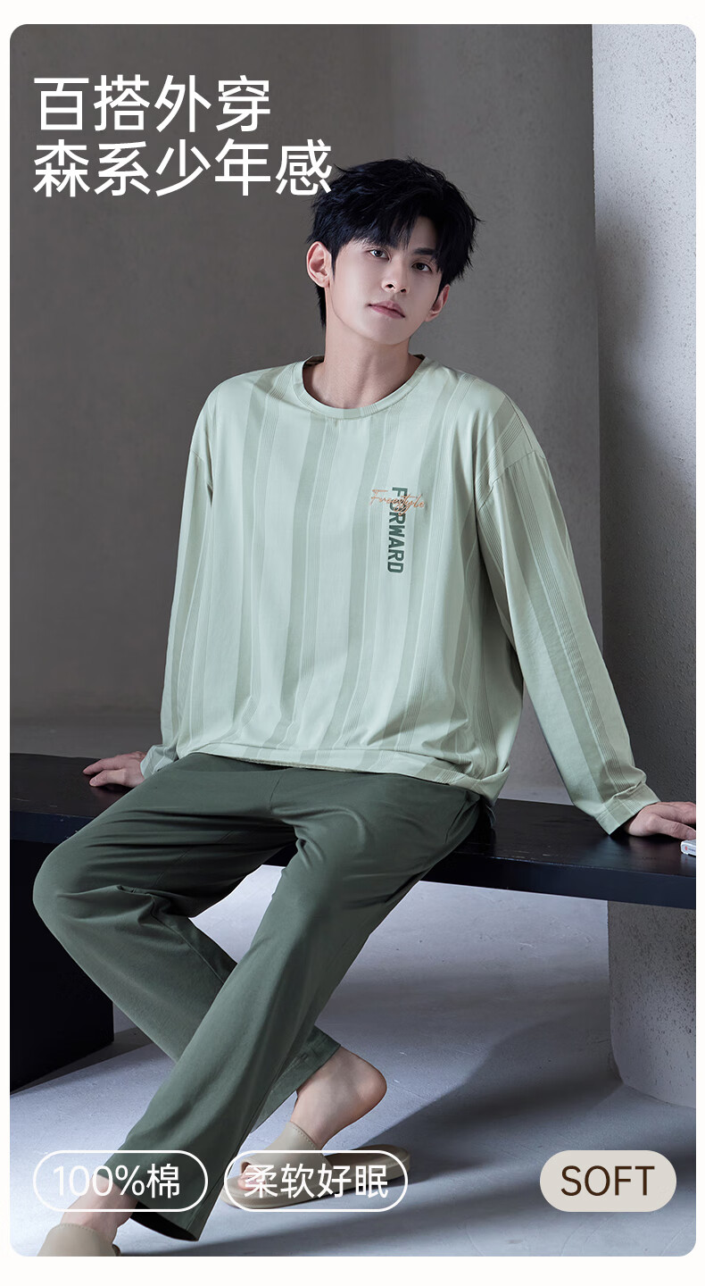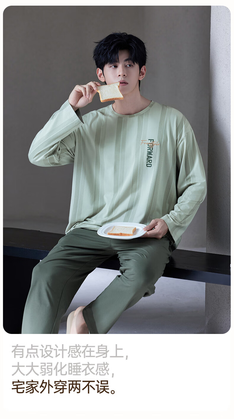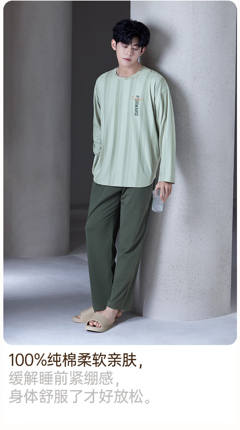 玛伦萨【超柔软】纯棉睡衣男春秋季2025新款长袖长裤可外穿男士家居服 灰绿 L
