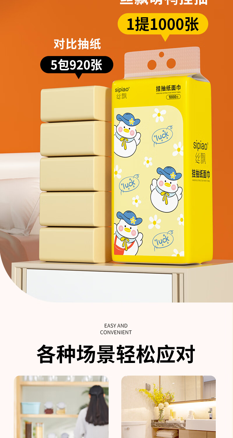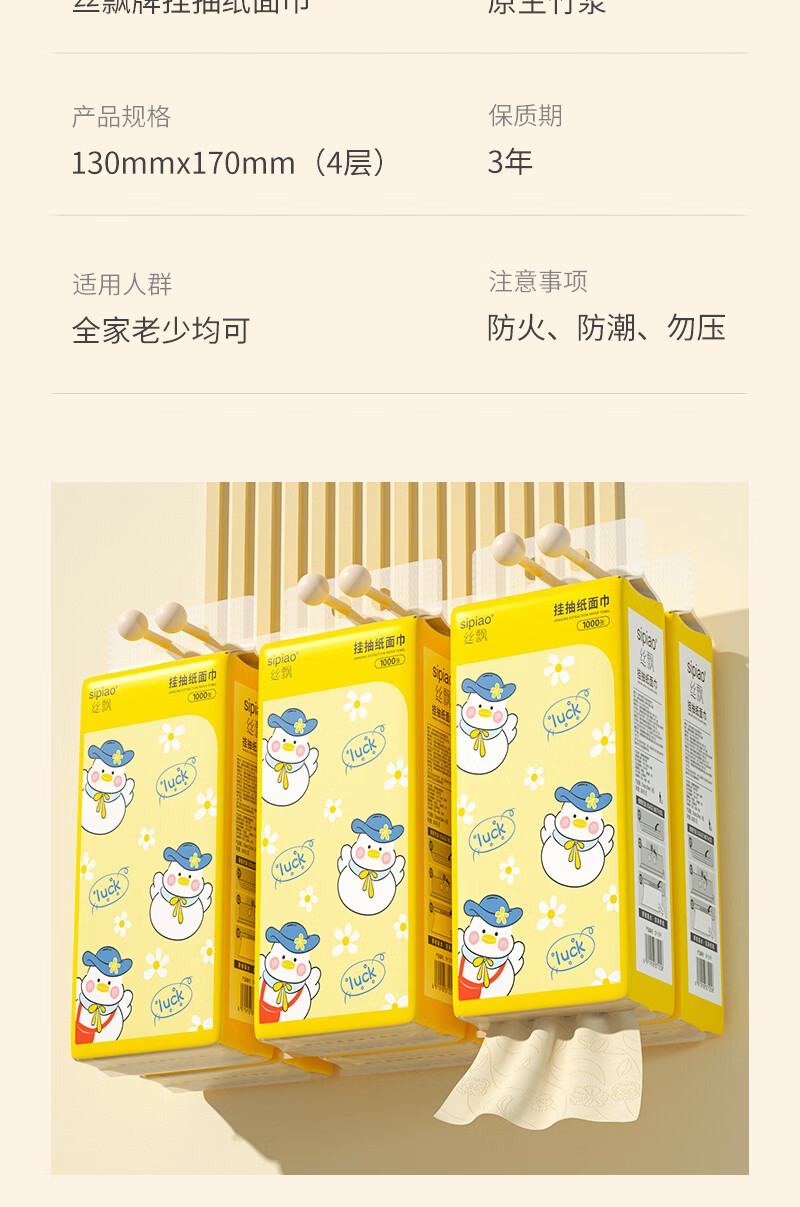 丝飘悬挂式抽纸面纸餐巾纸厕所用纸 1000张加厚4层家用纸巾 小黄鸭系列4提家用装