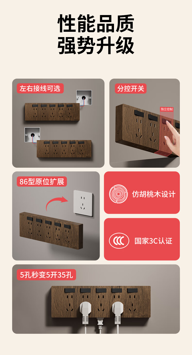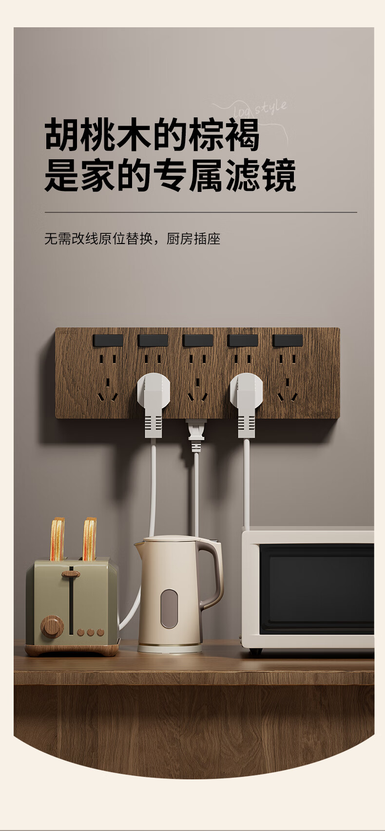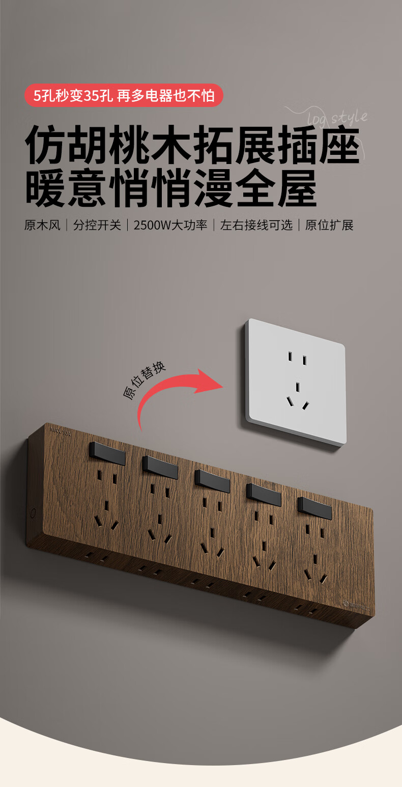 国际电工拓展插座86型墙面固定原位替换胡桃木纹扩展面板多孔位厨房转换器 【一开14孔+usb】86型即插即用