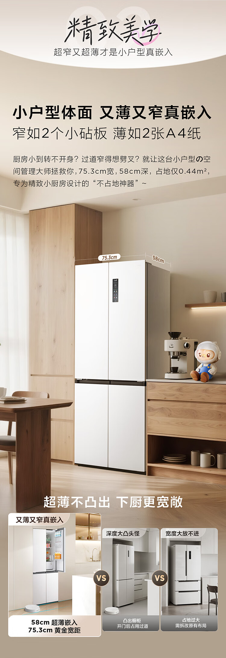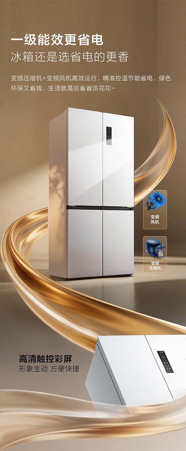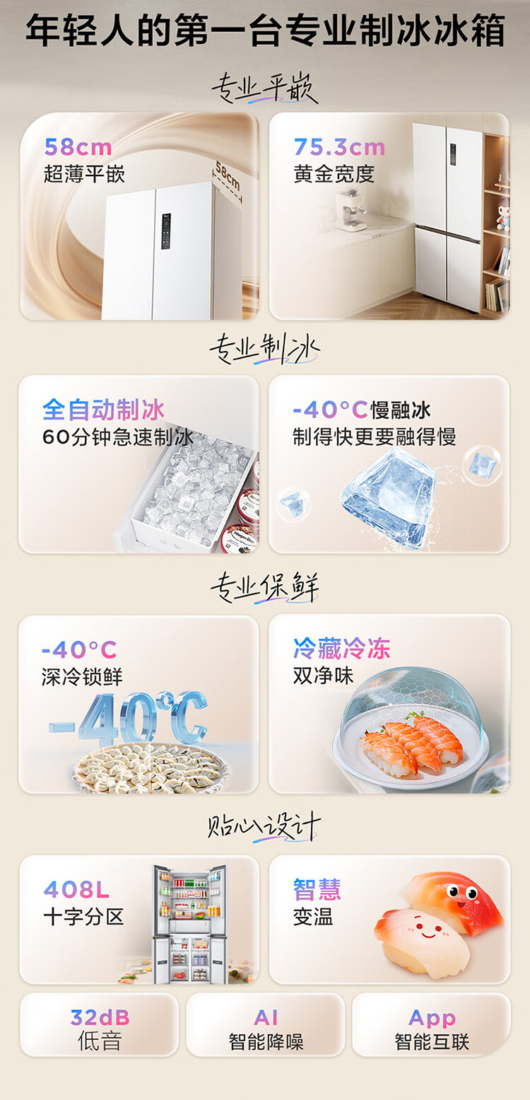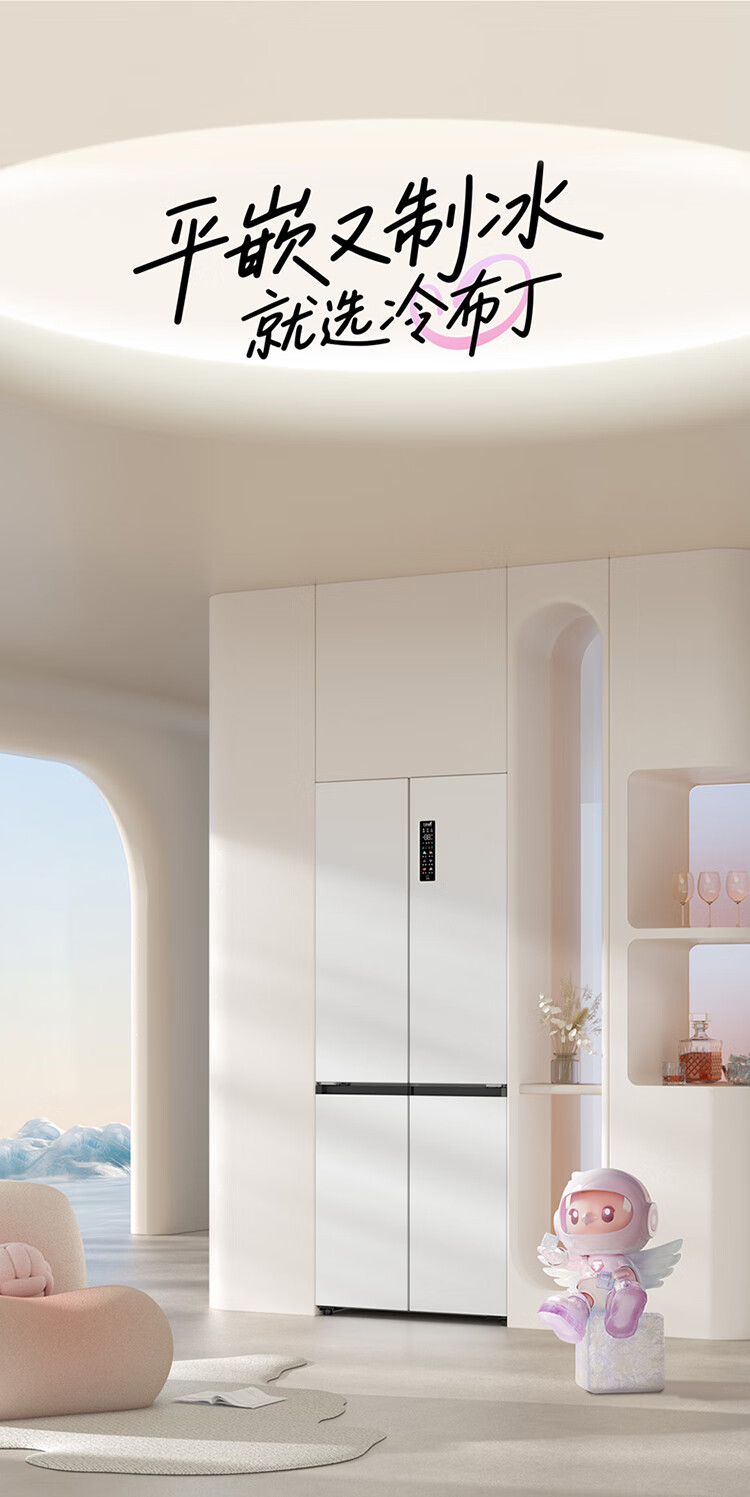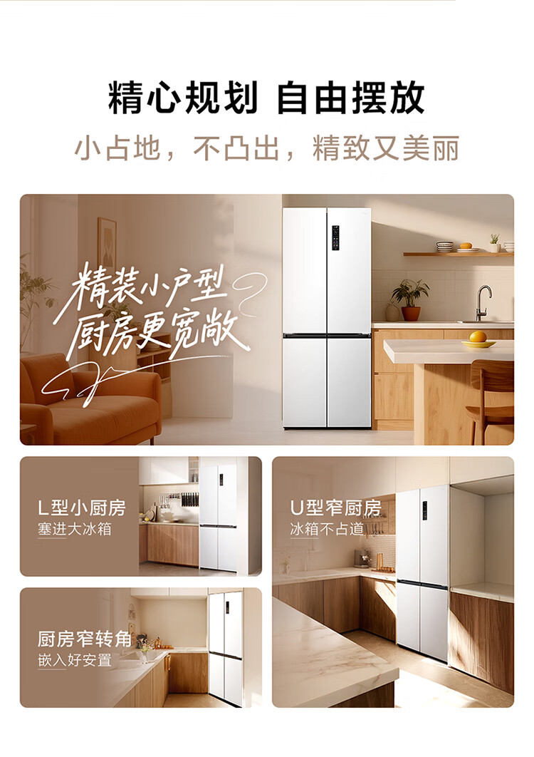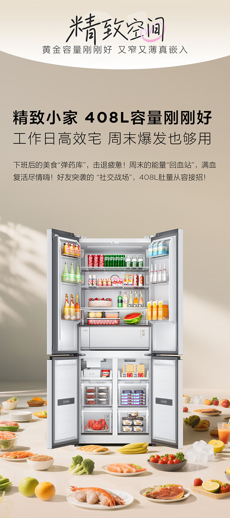 TCL冷布丁408升十字四开门超窄超薄小户型平嵌全自动制冰慢融冰家用冰箱一级能效国家补贴R408T7-UQB