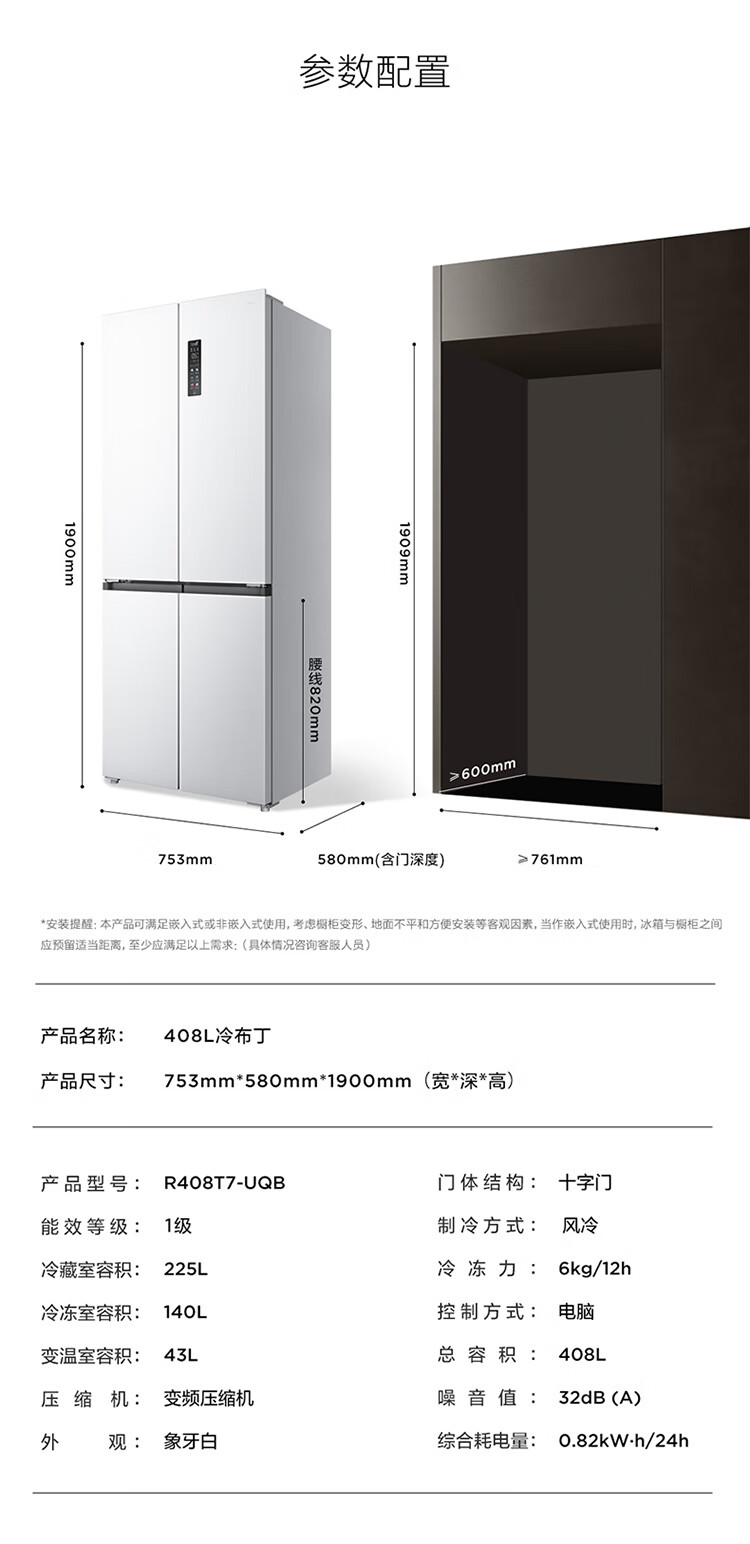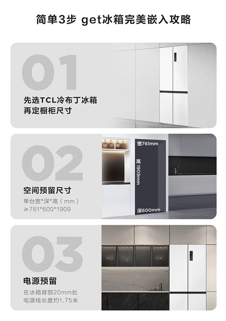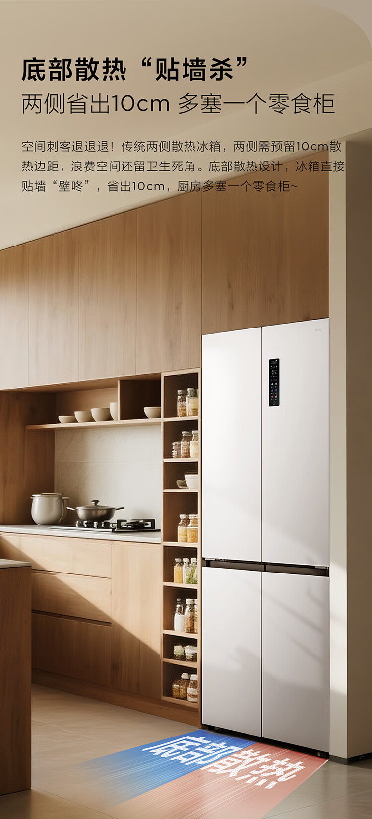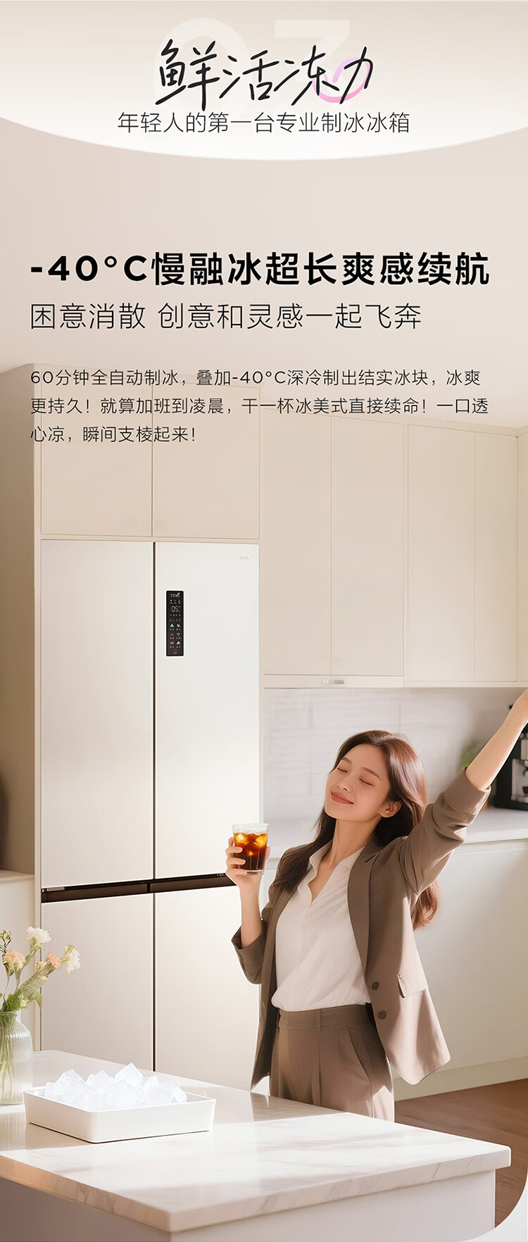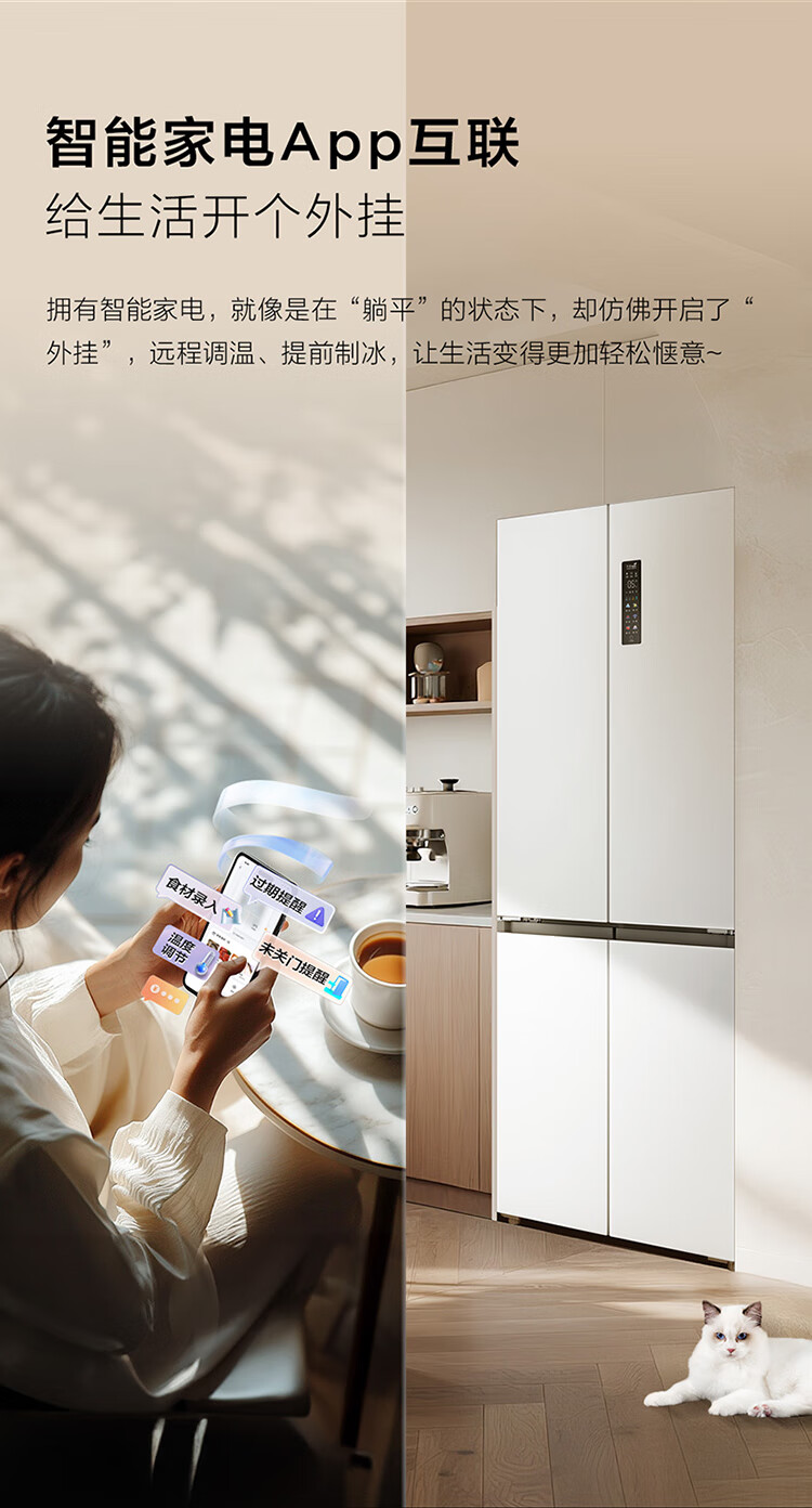 TCL冷布丁408升十字四开门超窄超薄小户型平嵌全自动制冰慢融冰家用冰箱一级能效国家补贴R408T7-UQB