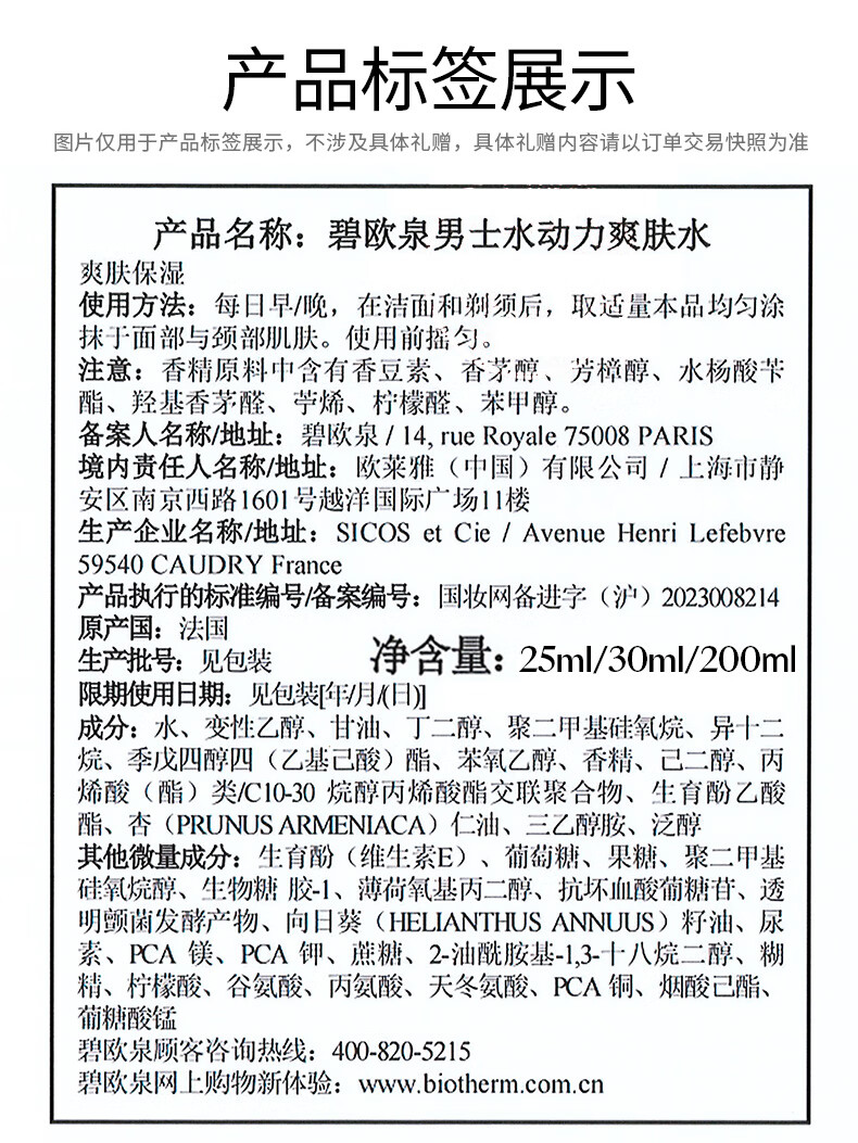 碧欧泉男士水动力爽肤水200ml补水保湿 生日礼物送男友
