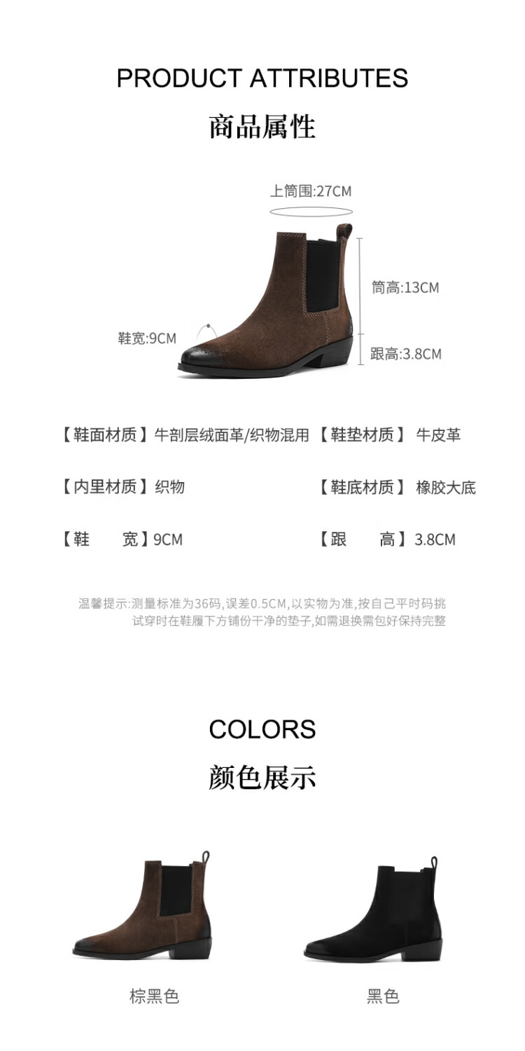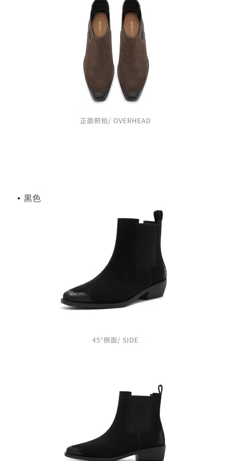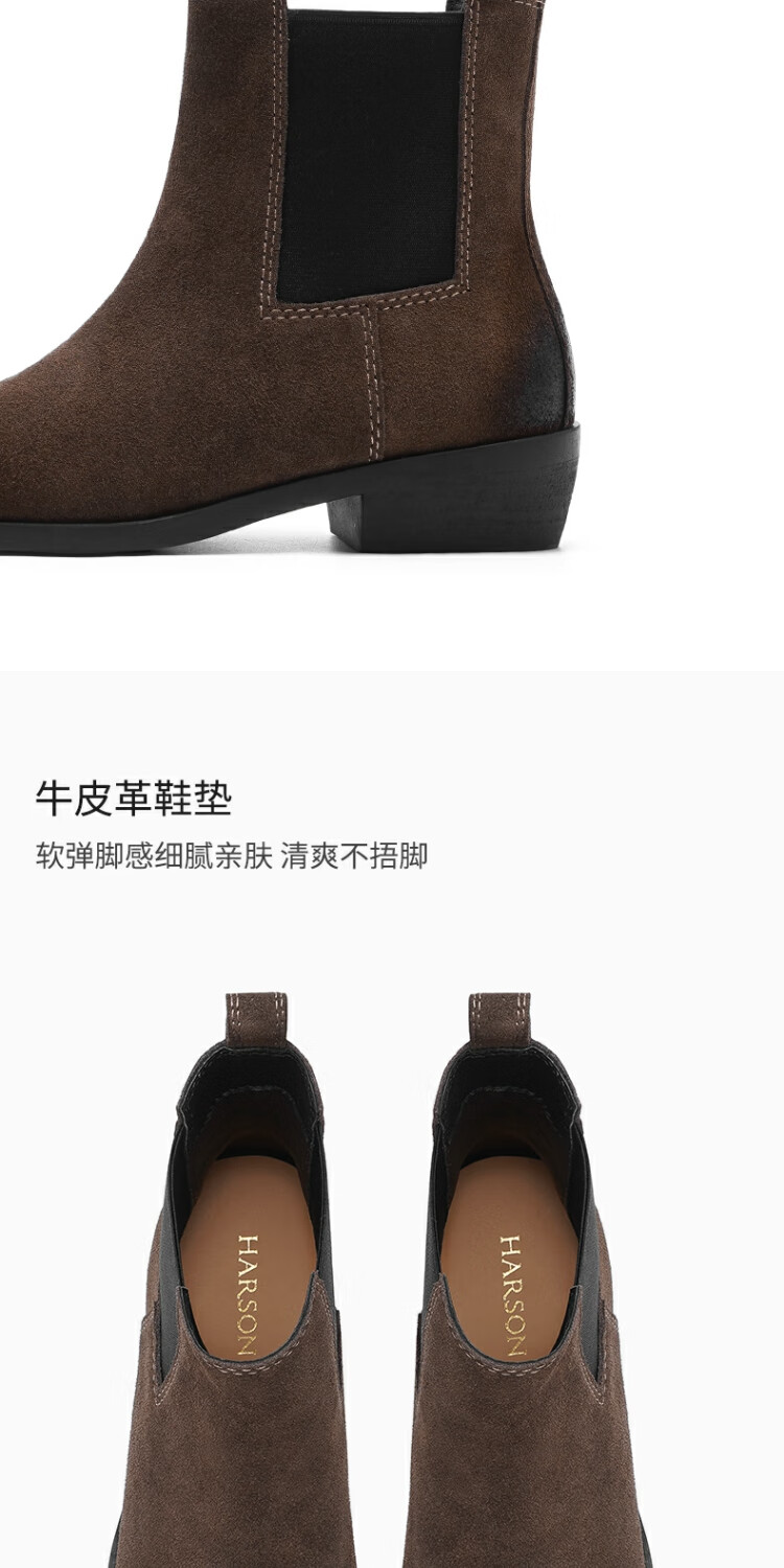 哈森气质方头复古擦色烟筒靴切尔西靴女短靴2025冬新品HWA250138 黑色 牛剖层绒面革/织物混用 35
