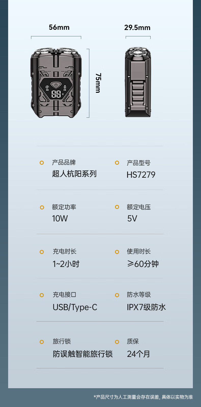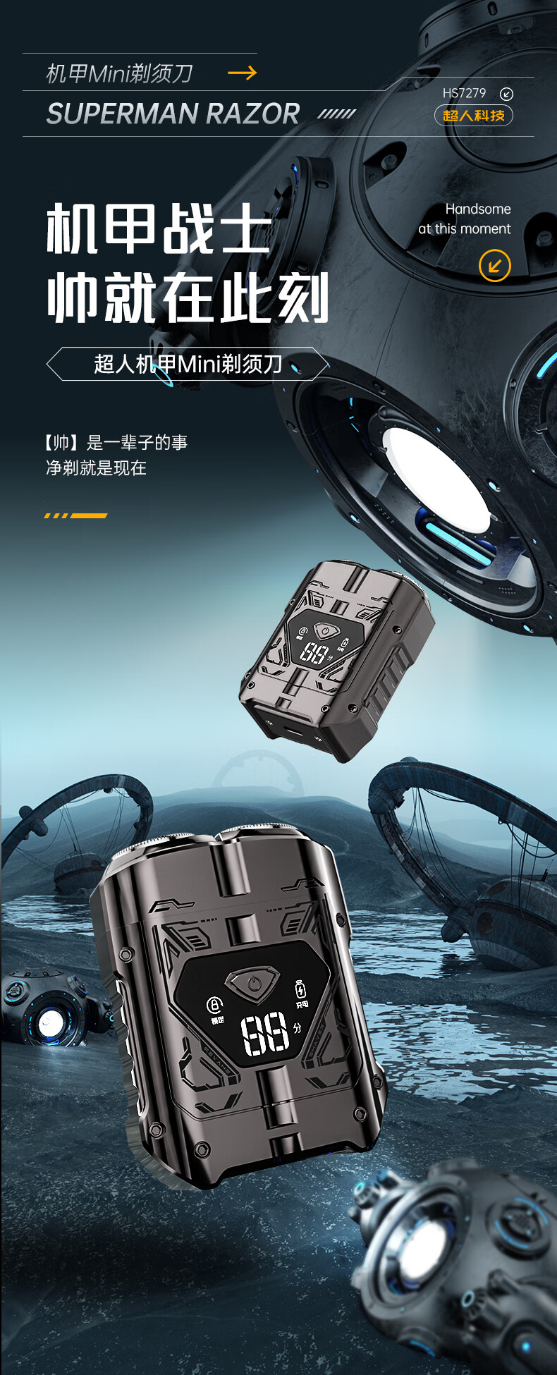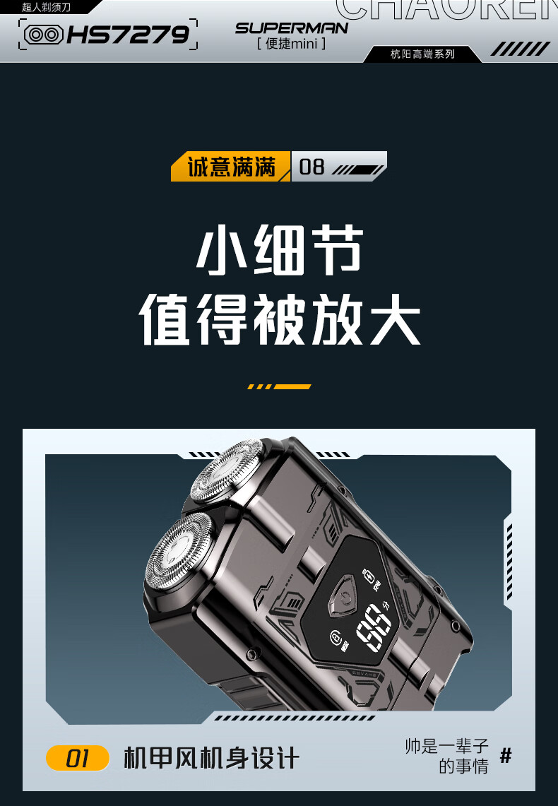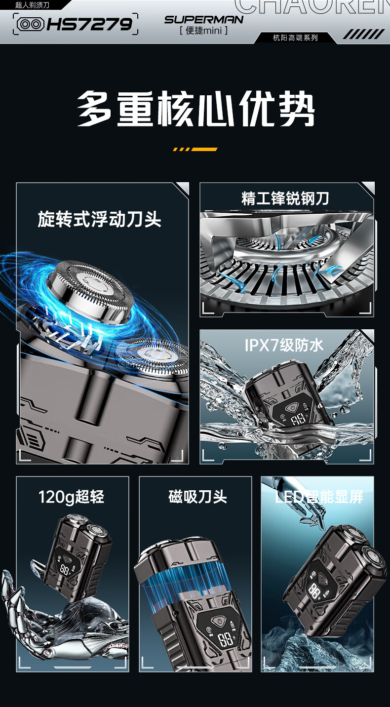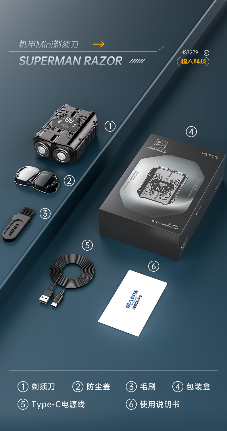 超人【出行必备】电动刮胡剃须刀小巧便携式迷你智能数显款刮胡刀Type-C充电全身水洗剃胡刀HS7279