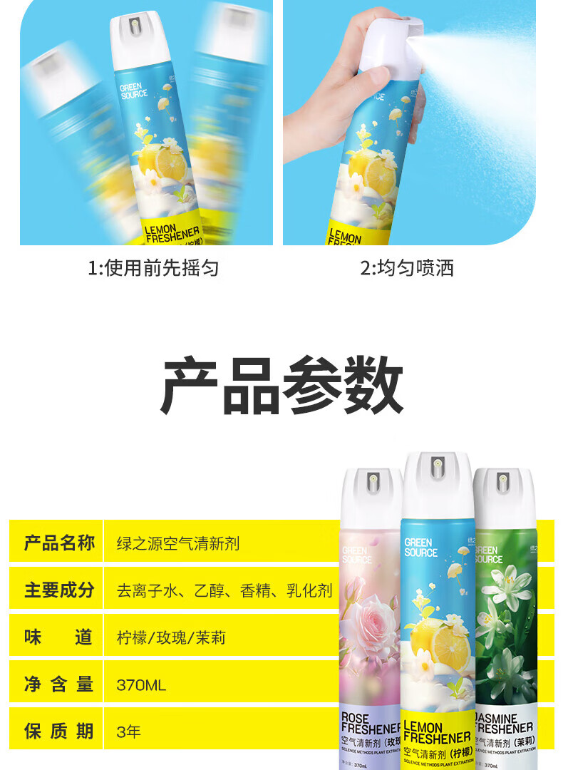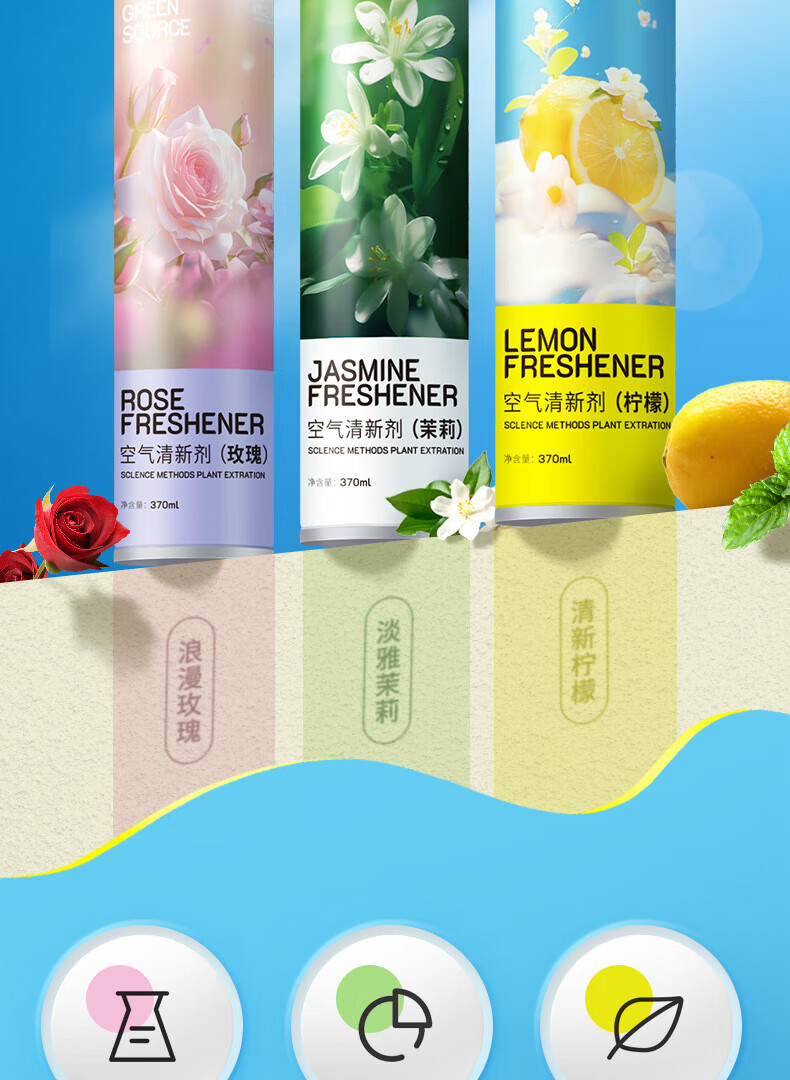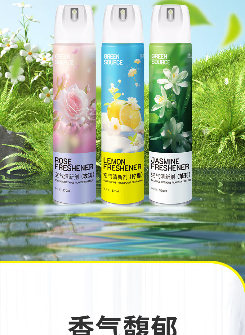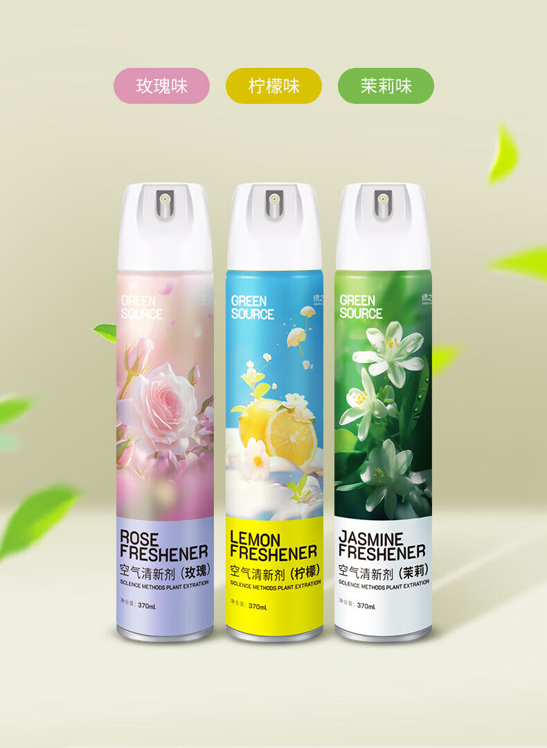 绿之源绿之源空气清新剂喷雾370ml卧室车内除异味薰香厕所除味香氛 玫瑰370ml+茉莉370ml+柠檬370ml