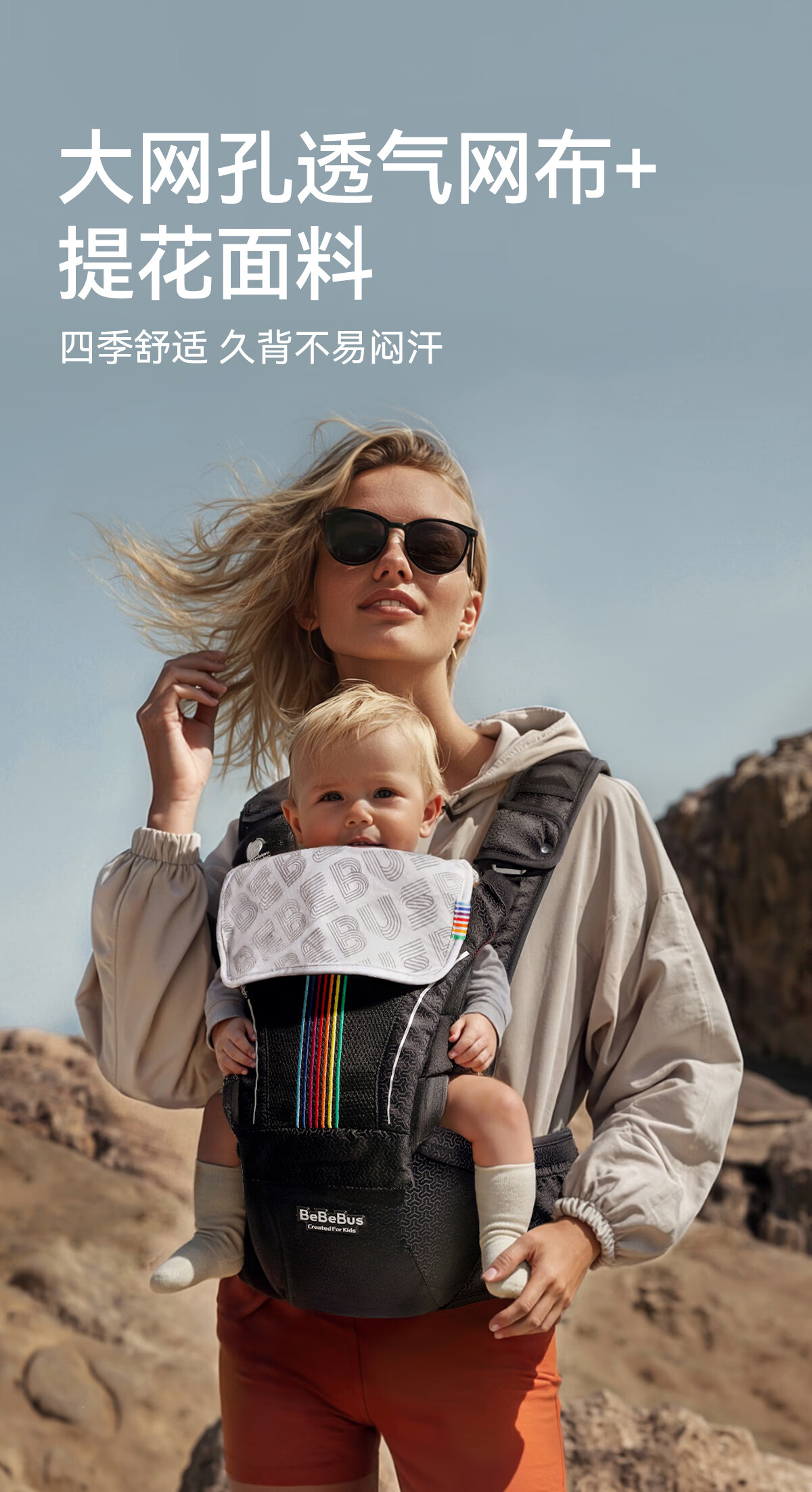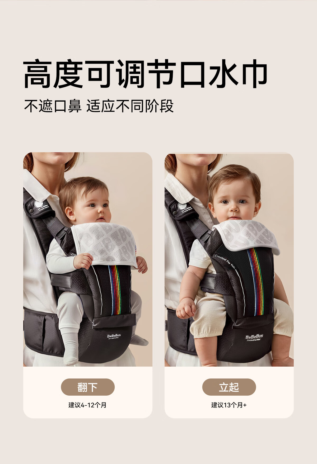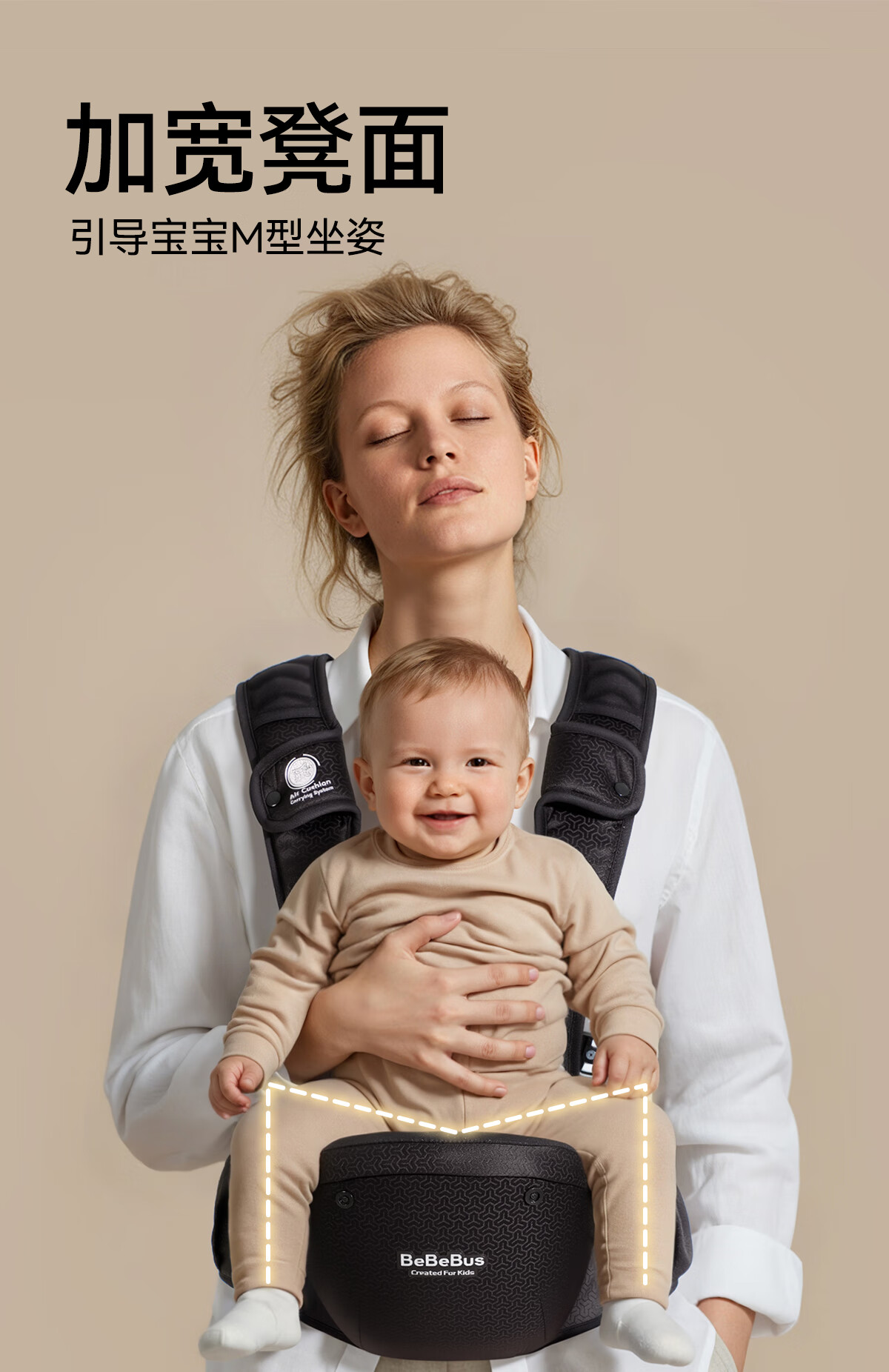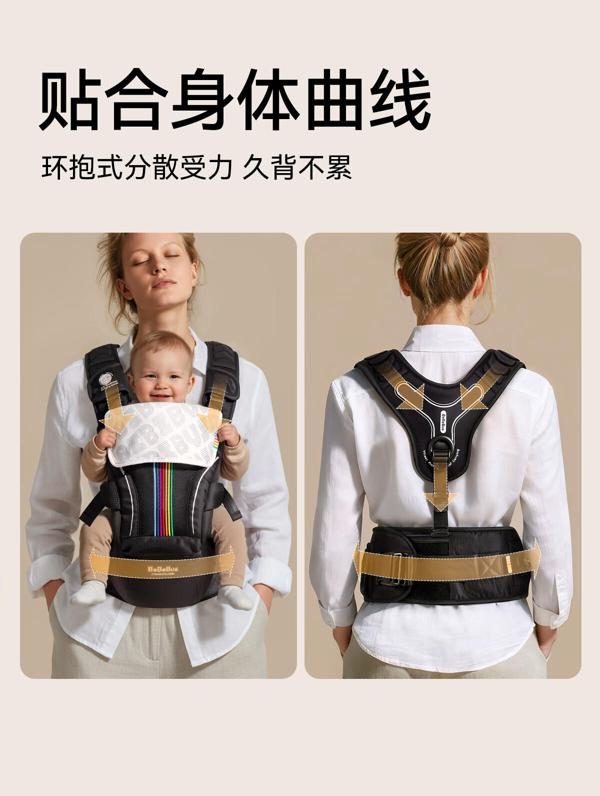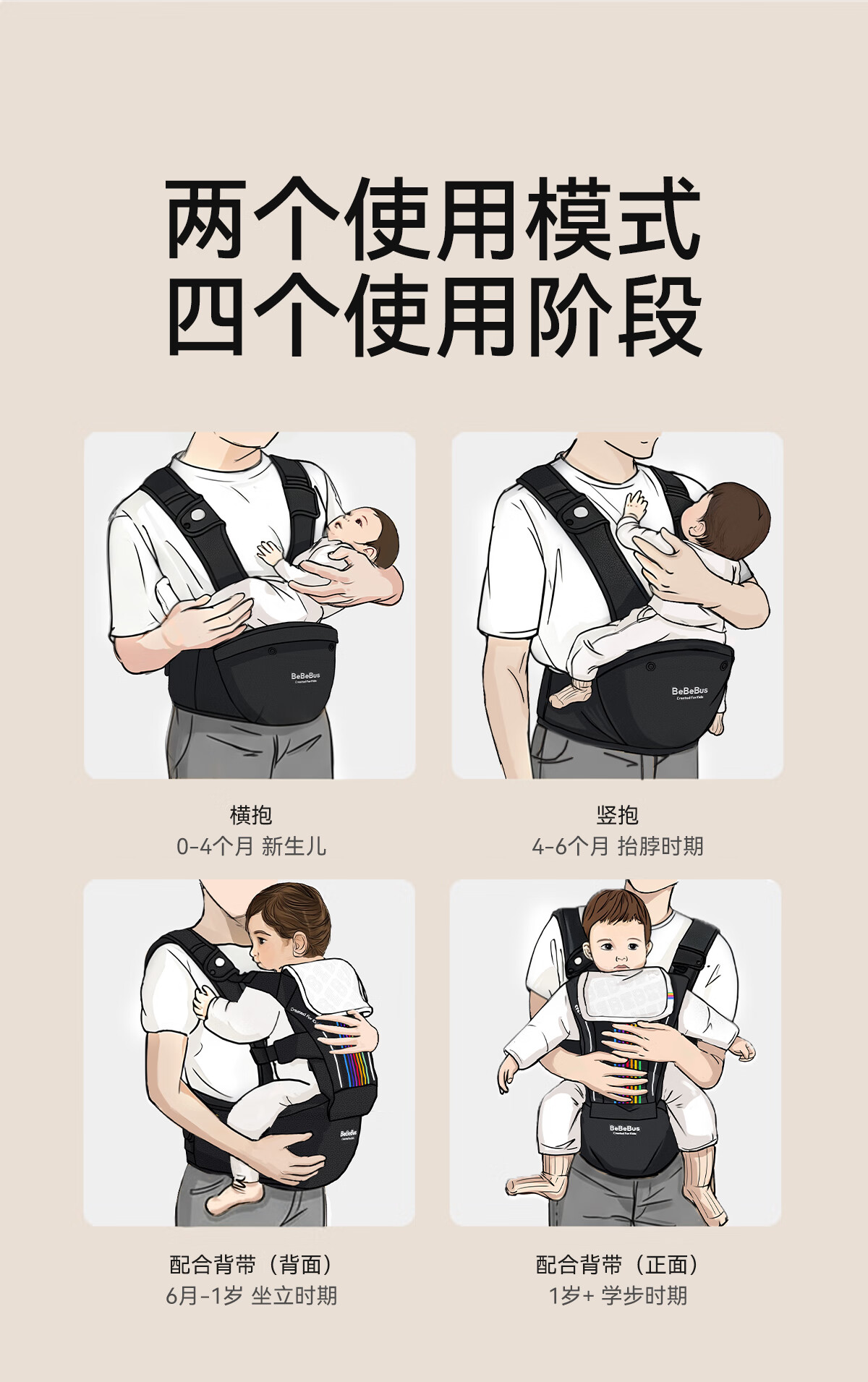bebebus轻享家腰凳婴儿背带二合一可拆卸轻便四季透气前抱式抱娃神器 黑金含1条口水巾
