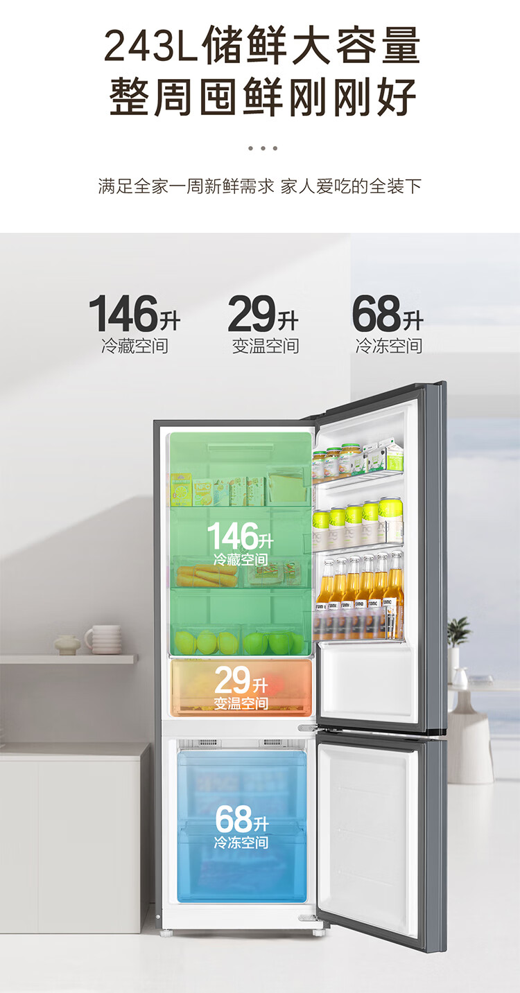 海尔(Haier)冰箱243升双开门两门一级能效风冷无霜小型冰箱宿舍公寓租房三档变温双变频节能家用电冰箱 -30℃深冷速冻+健康黑金净化+三档变温