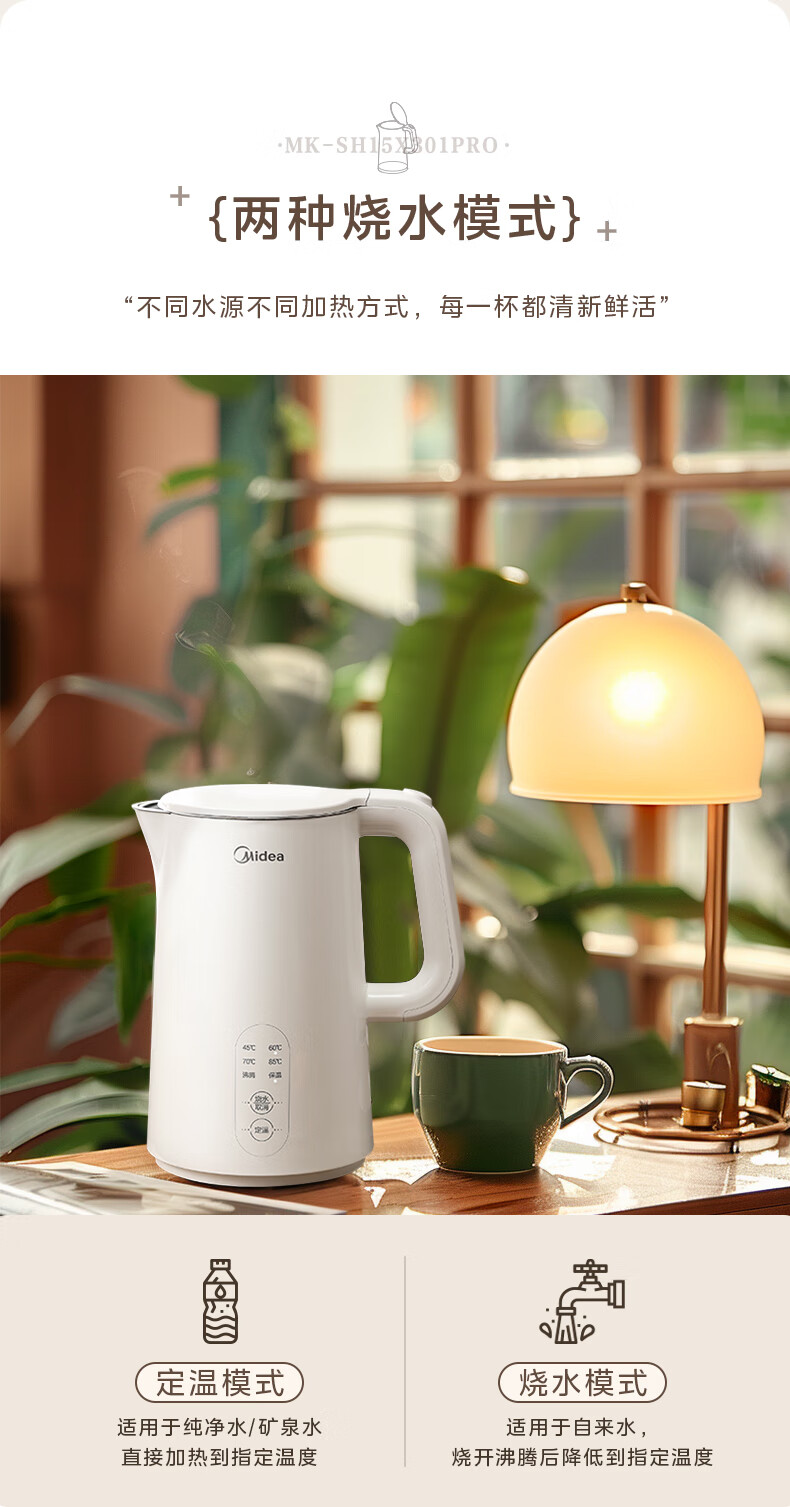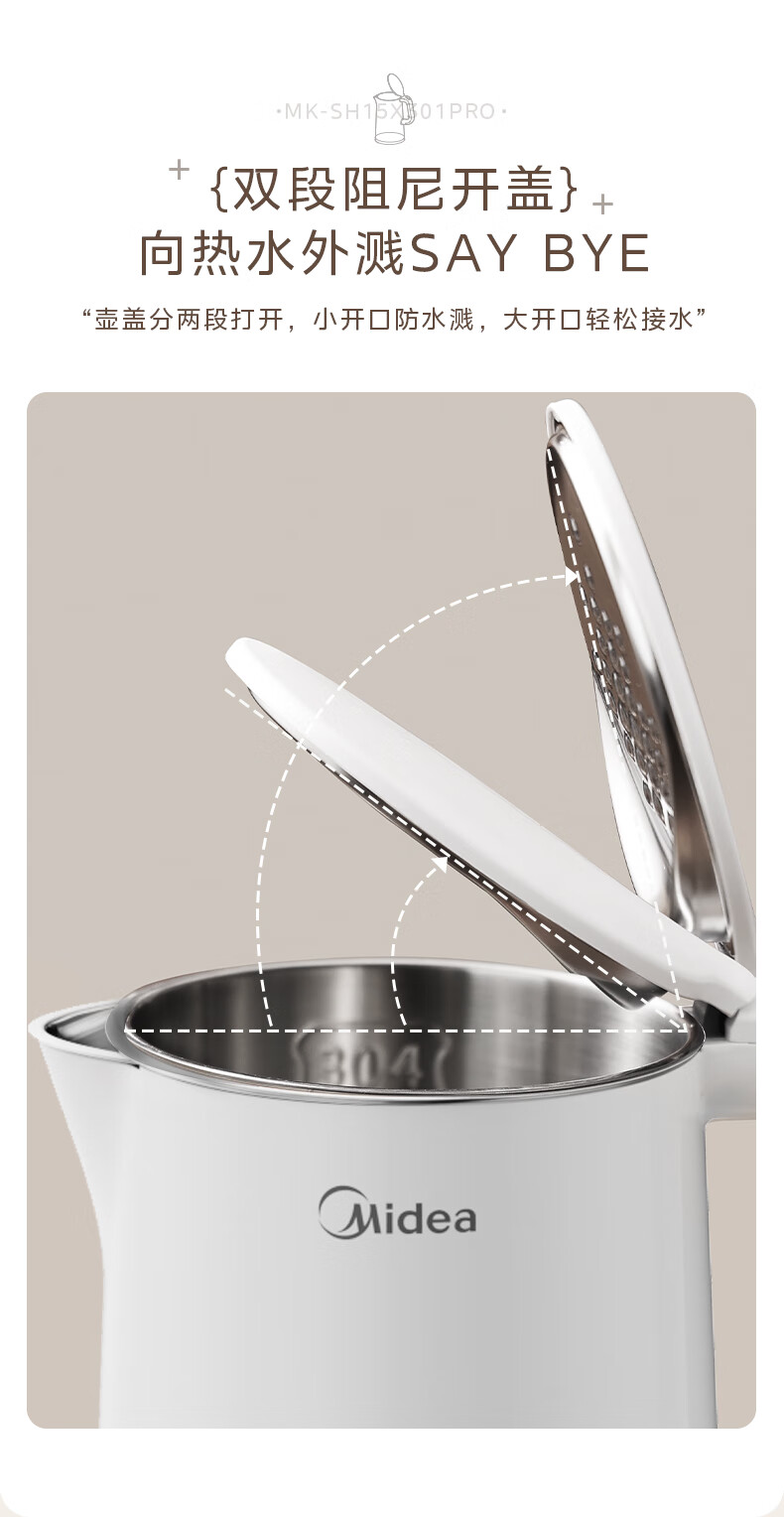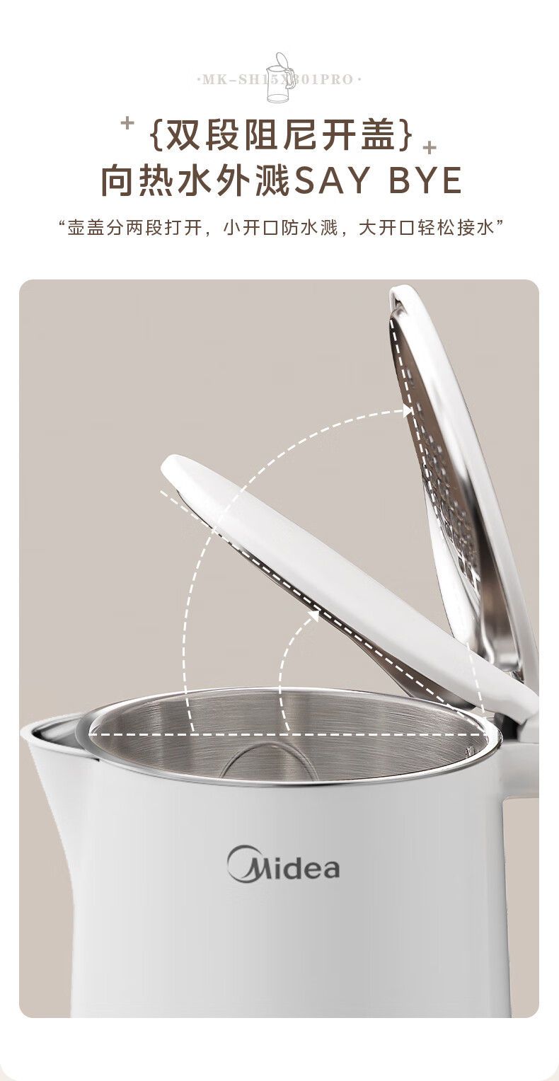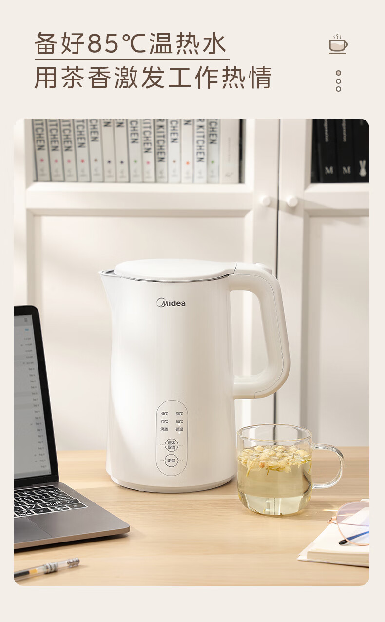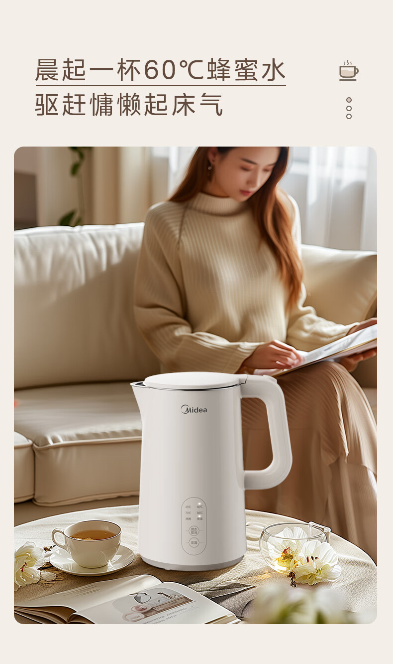 美的(Midea) 电热水壶 热水壶 家用大容量不锈钢烧水壶双层防烫 一体无缝内胆电水壶开水壶 1.5L 【304不锈钢恒温保温一体】-最新款