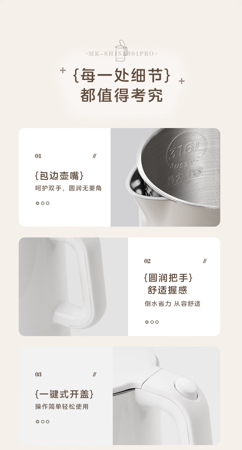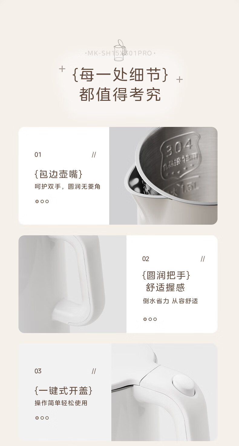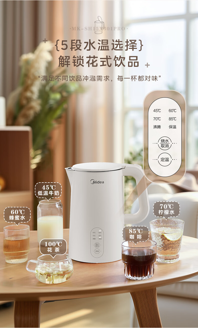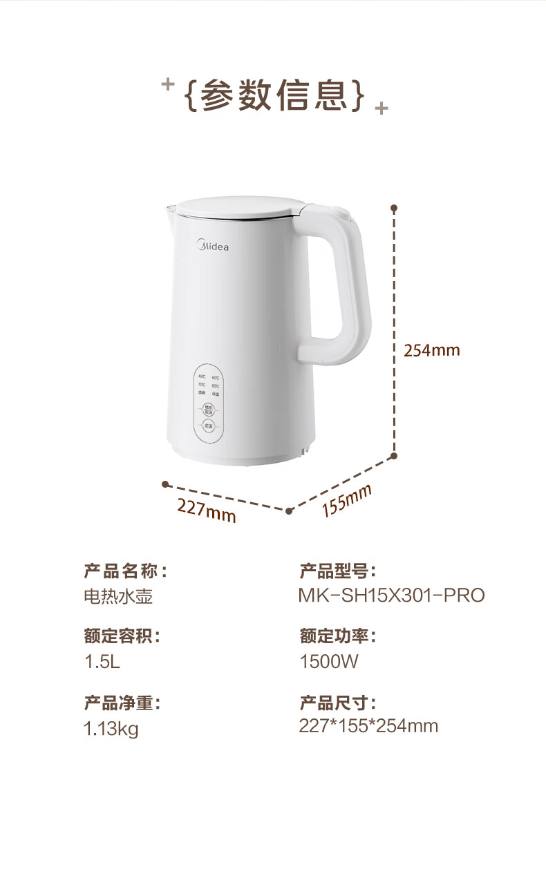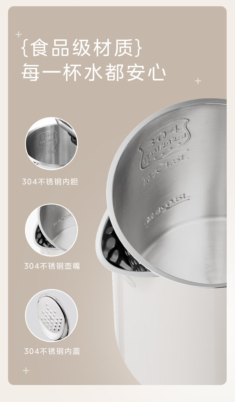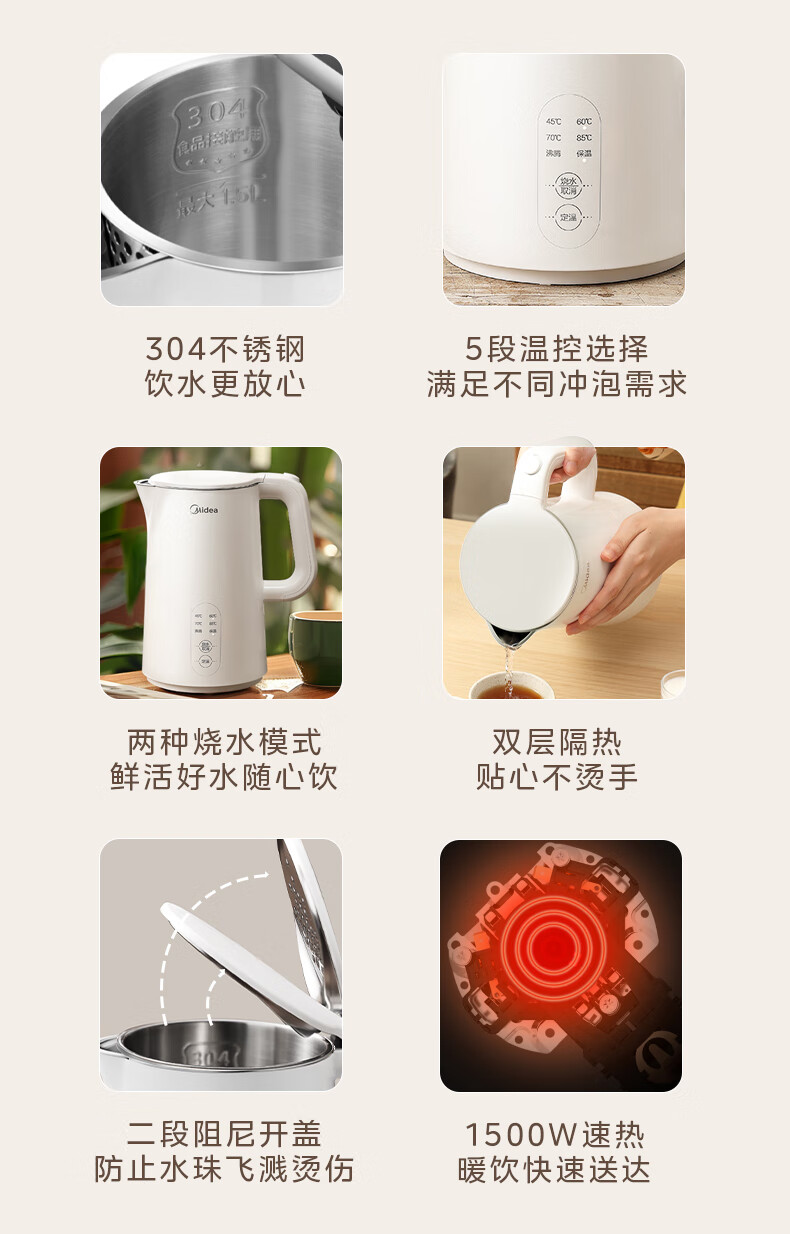 美的(Midea) 电热水壶 热水壶 家用大容量不锈钢烧水壶双层防烫 一体无缝内胆电水壶开水壶 1.5L 【304不锈钢恒温保温一体】-最新款